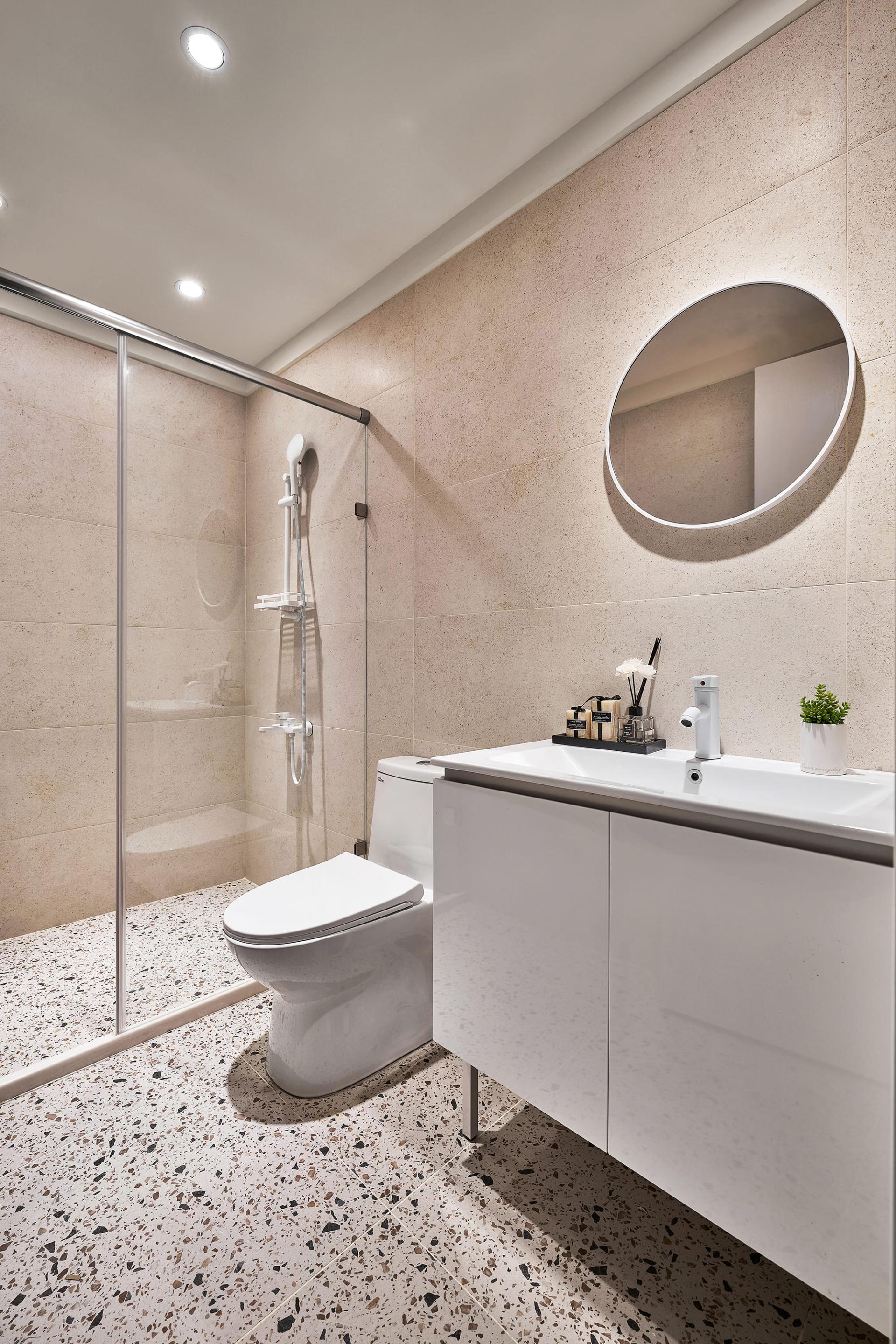 In the bathroom, the design embraces a primarily beige color scheme, harmonizing with the main palette of the home. To ensure visual consistency, elegant white fixtures have been selected, continuing the refined aesthetic throughout. Addressing the height difference between the bathroom and the adjacent secondary bedroom was a crucial consideration for the team.
