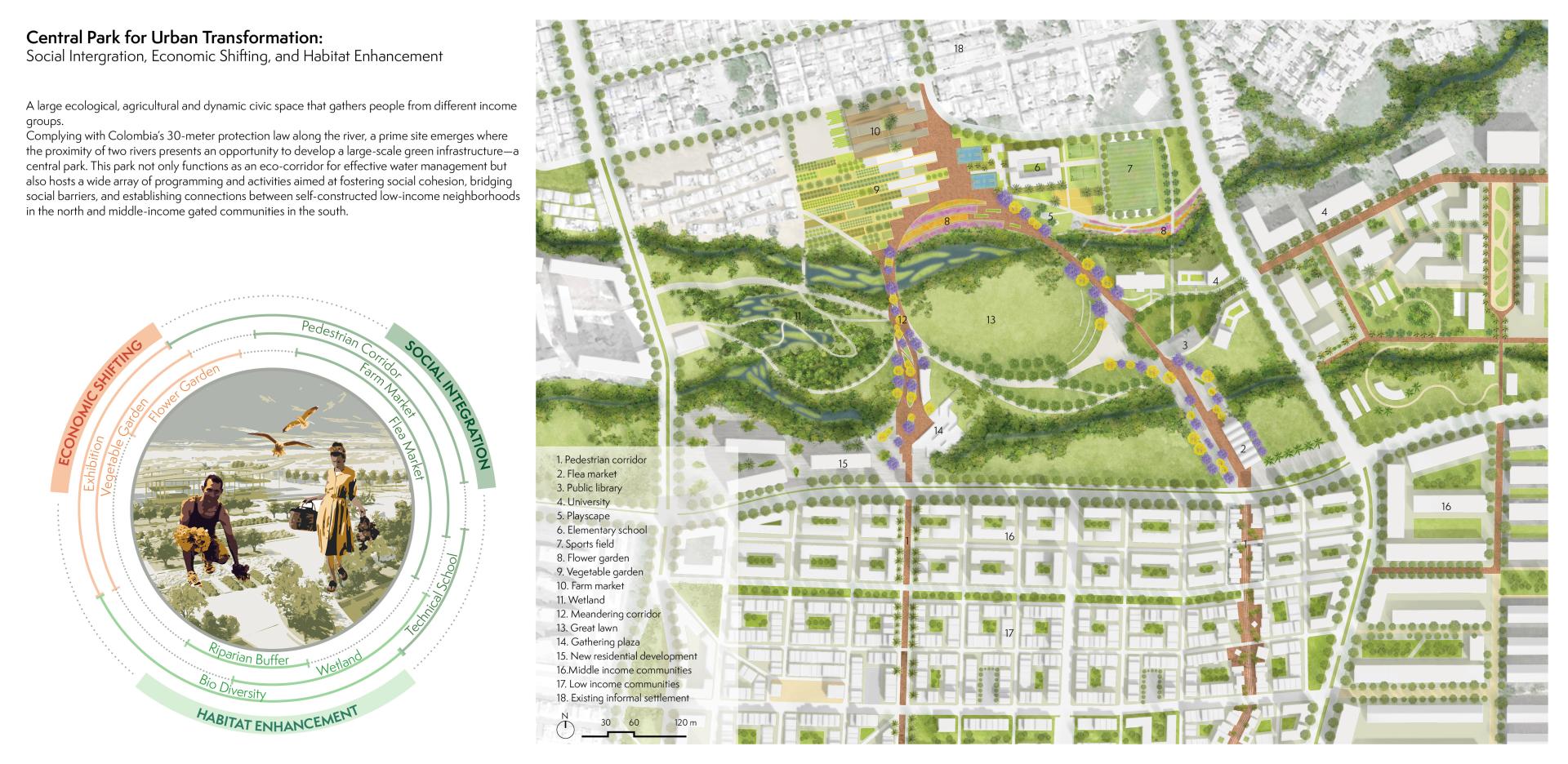 The proposal centers on a comprehensive green network that integrates open spaces and green infrastructure into the city’s fabric. Landscape becomes a tool to guide urban expansion, support ecological recovery, foster economic opportunities, and promote social equity. At the heart of the design is the “Central Park for Urban Transformation,” a multifunctional anchor that protects sensitive ecological areas while offering vibrant social programs. It engages surrounding communities through flea markets, partnerships with universities, farmers’ markets, and communal gardens—creating inclusive spaces that attract diverse users and strengthen community ties.