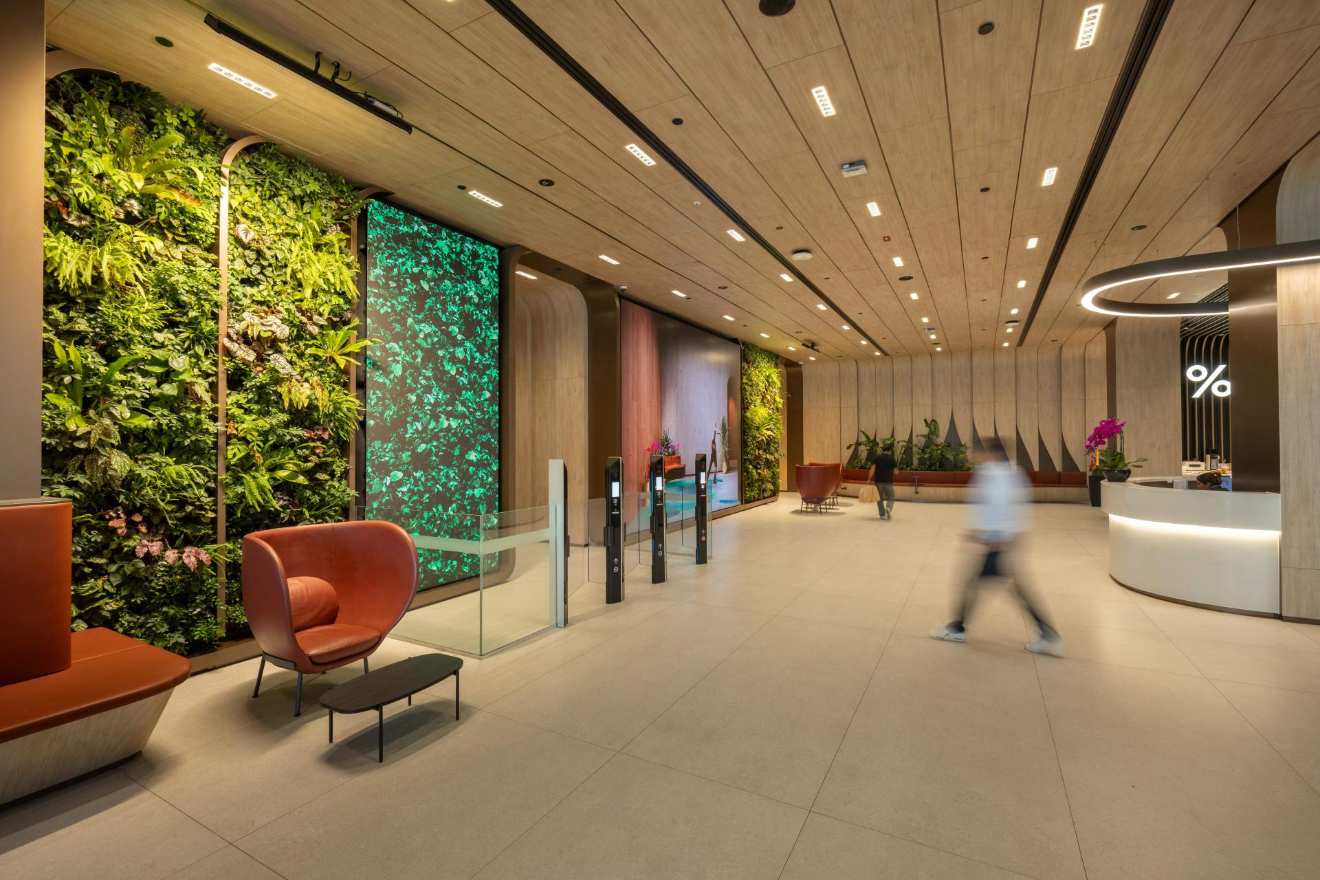 Biophilic design features—a 30-metre green wall facing a nearby hotel and lush tropical planting including flowering plants, shrubs, ferns, and aroids—enhance urban ecology and wellness.