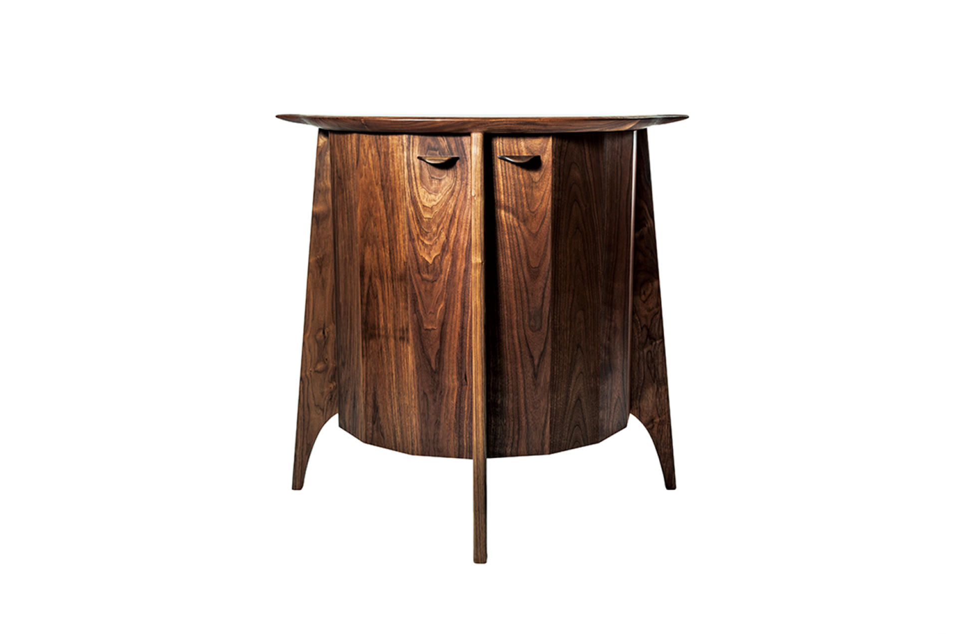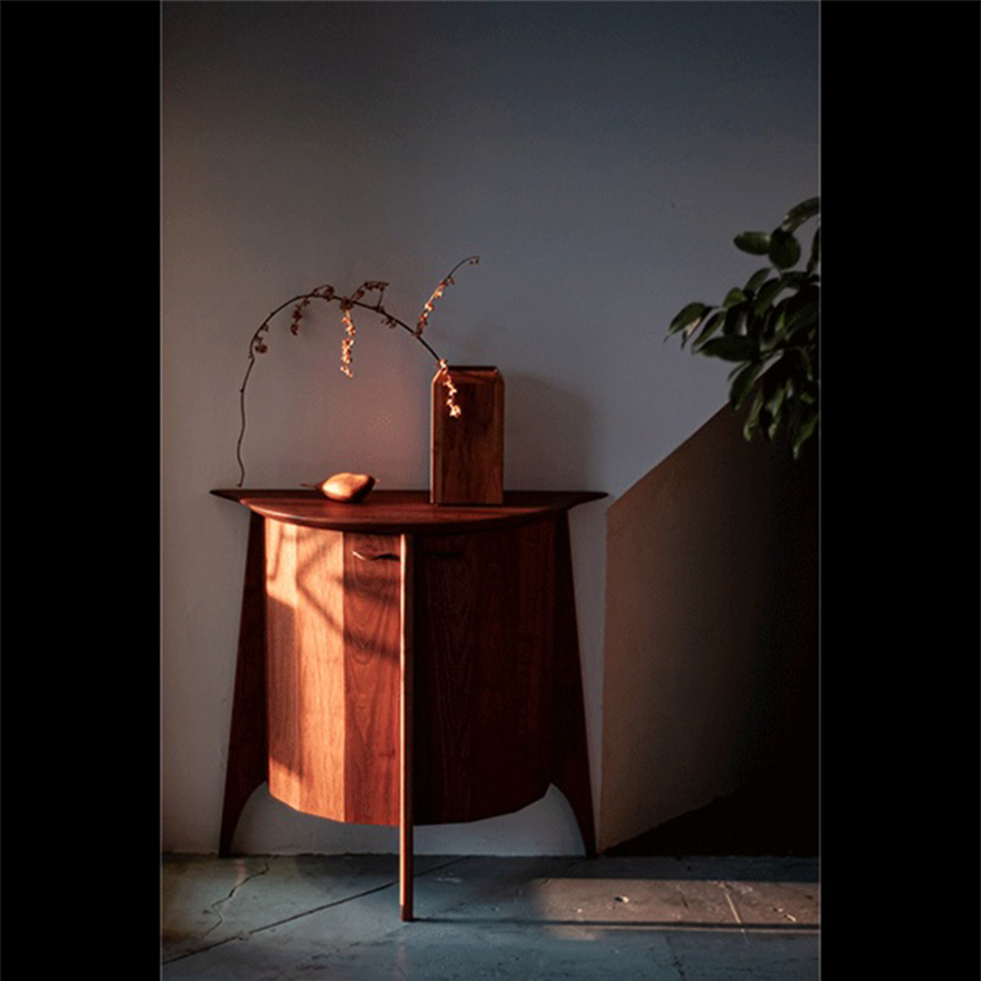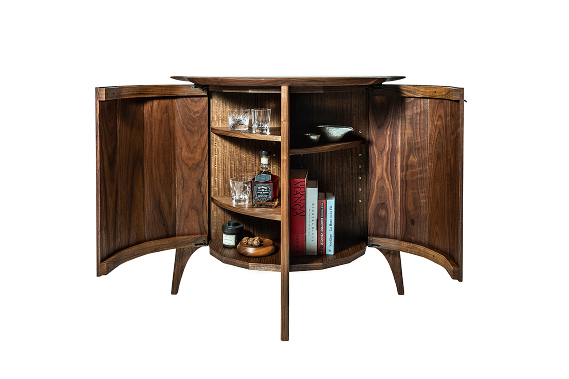 cocoda cabinet is a storage with an unique structure. It is designed around legs and frames almost like a chair to make a three dimensional and sculptural shape. Top board is hand carved by craftsman using planes for a distinctive finish, and the leg joints are carved by Japanese traditional blades for smoothness. Doors are made with solid wood pieces grafted together in angles to make a circular shape, and the signature handles which are also carved by hand are embed for a functional element. The opening and closing of the doors are calculated to the perfect angle, also finished with a soft closure function.