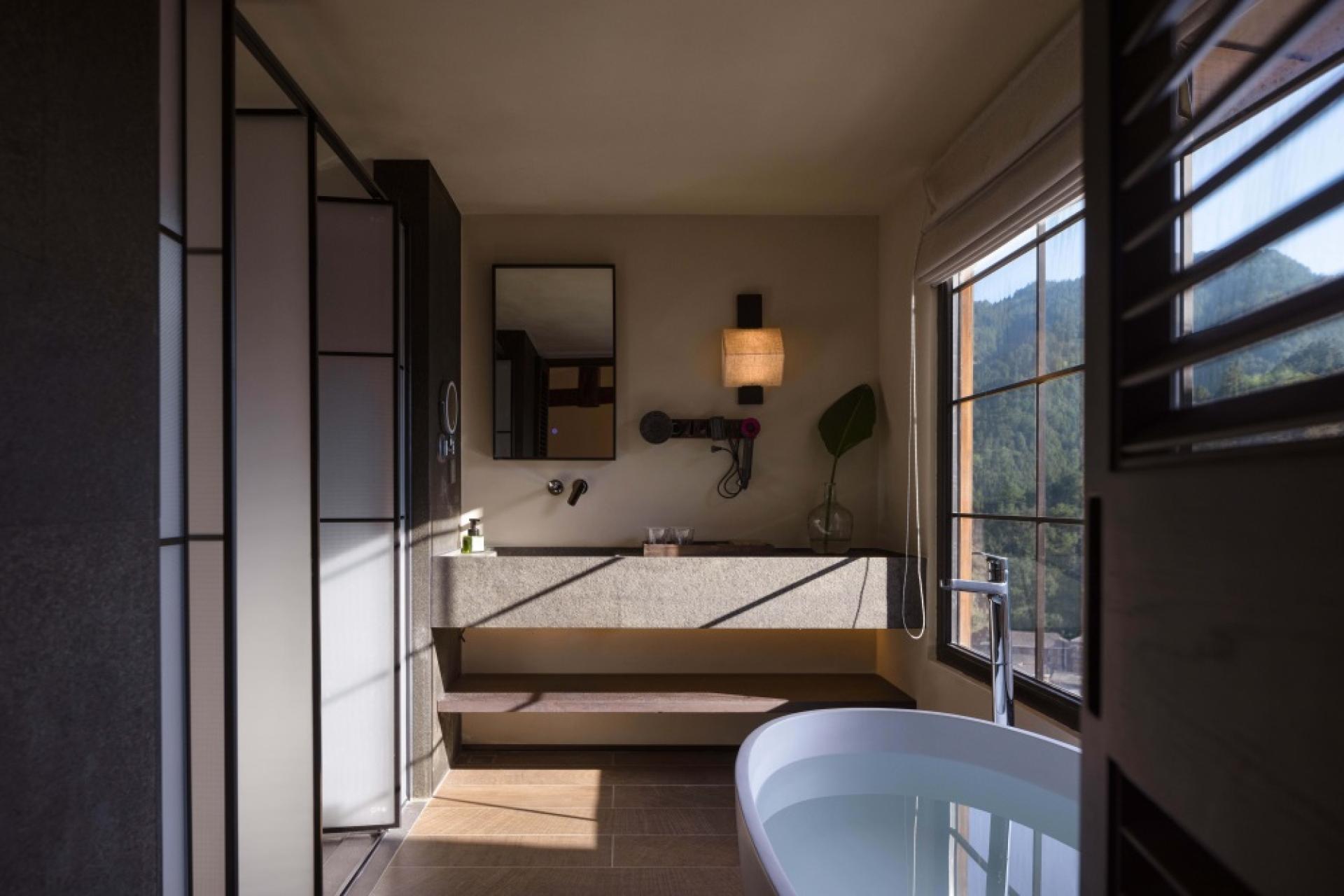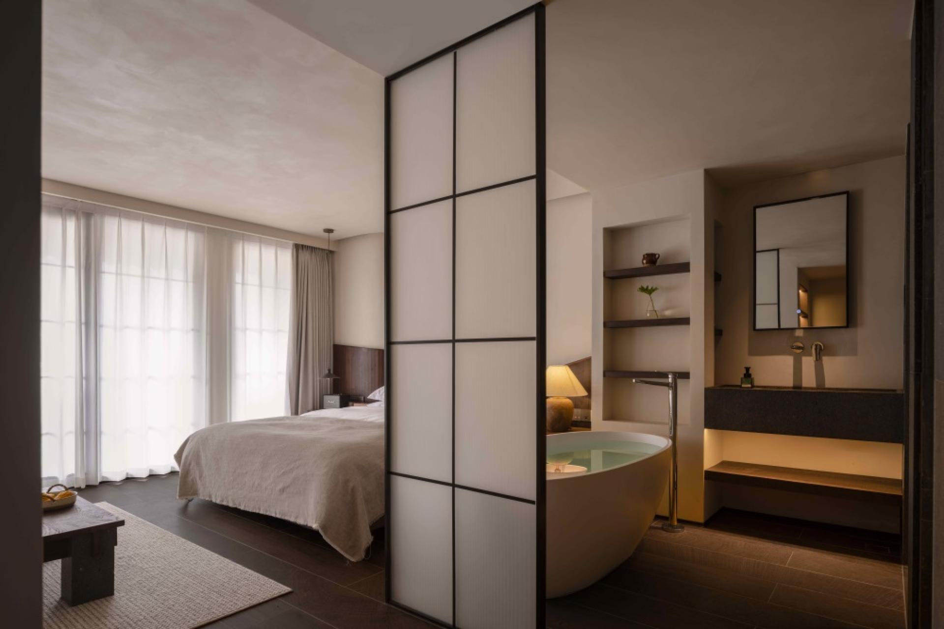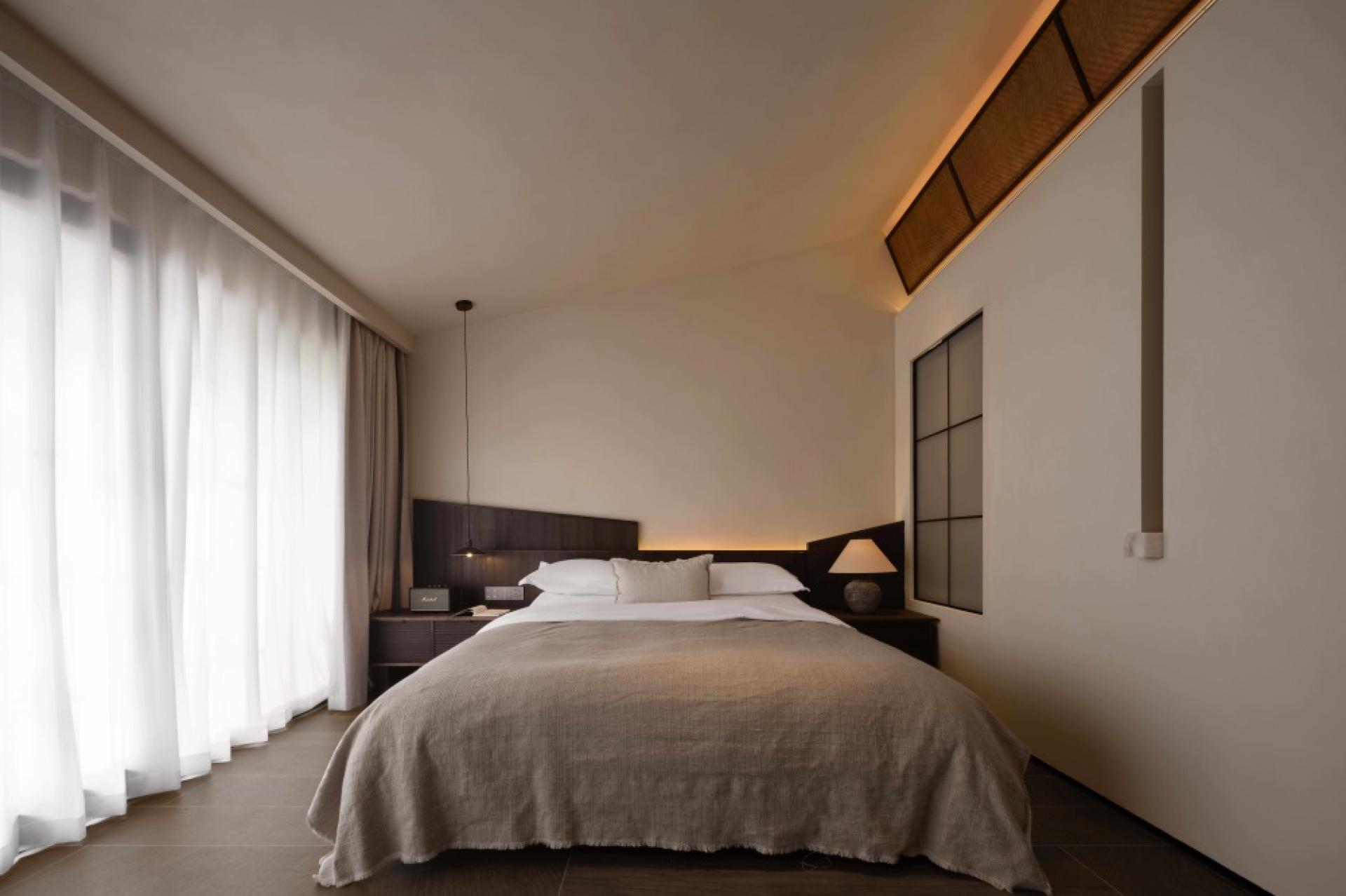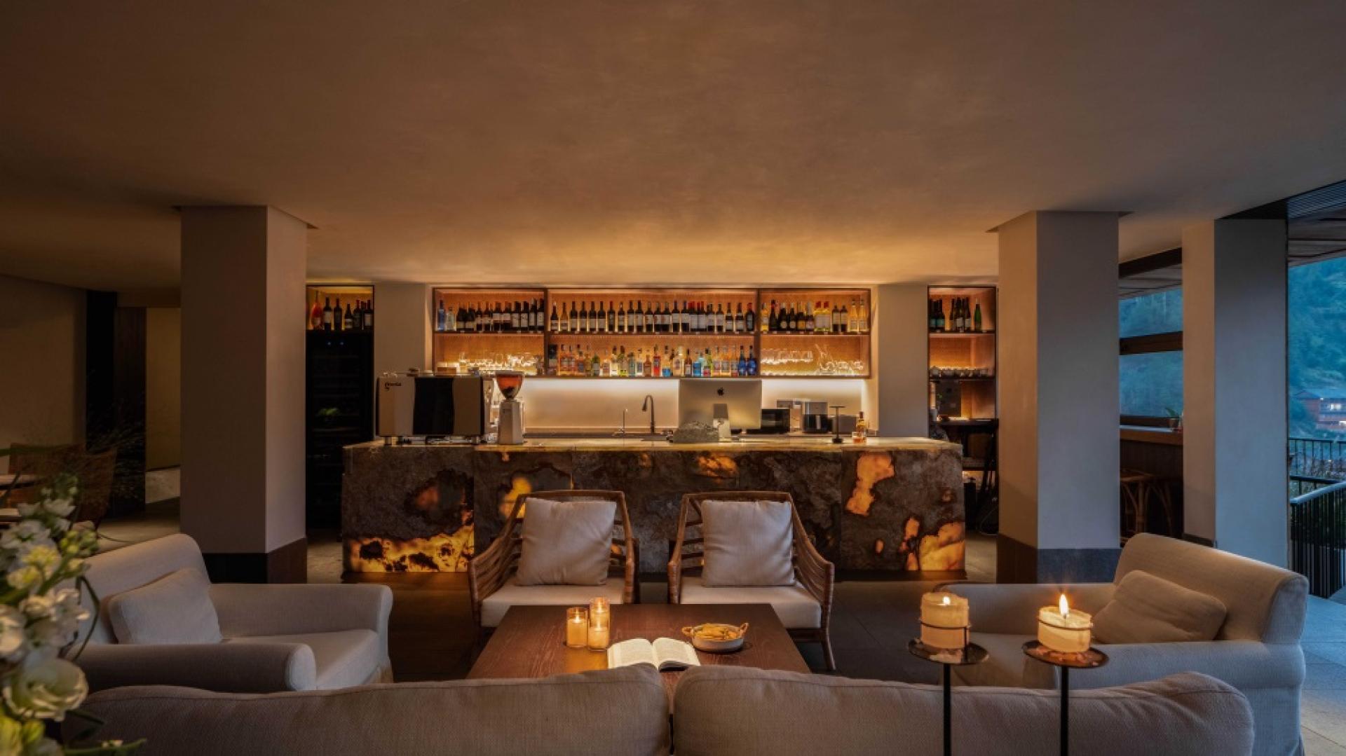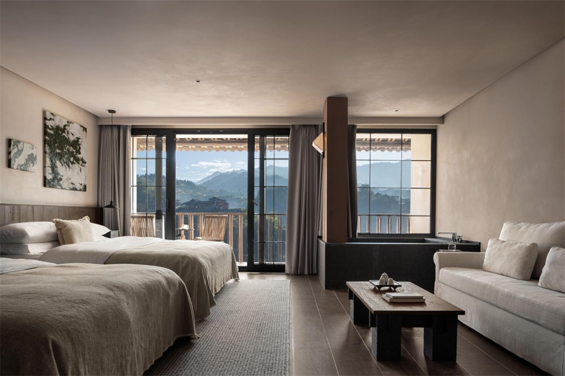 Materiality plays a pivotal role—locally sourced stone, burnt wood, old oak, bamboo weaving, and artistic finishes echo the heritage of the region while embracing contemporary expression. The spatial narrative transitions guests from the outer world into a realm of mountain serenity. Entryways are designed with subtlety, avoiding grand statements and instead inviting reflection. Upon entering, panoramic views unfold to reveal layered mountain scenes, immersing guests in light, air, and calm.