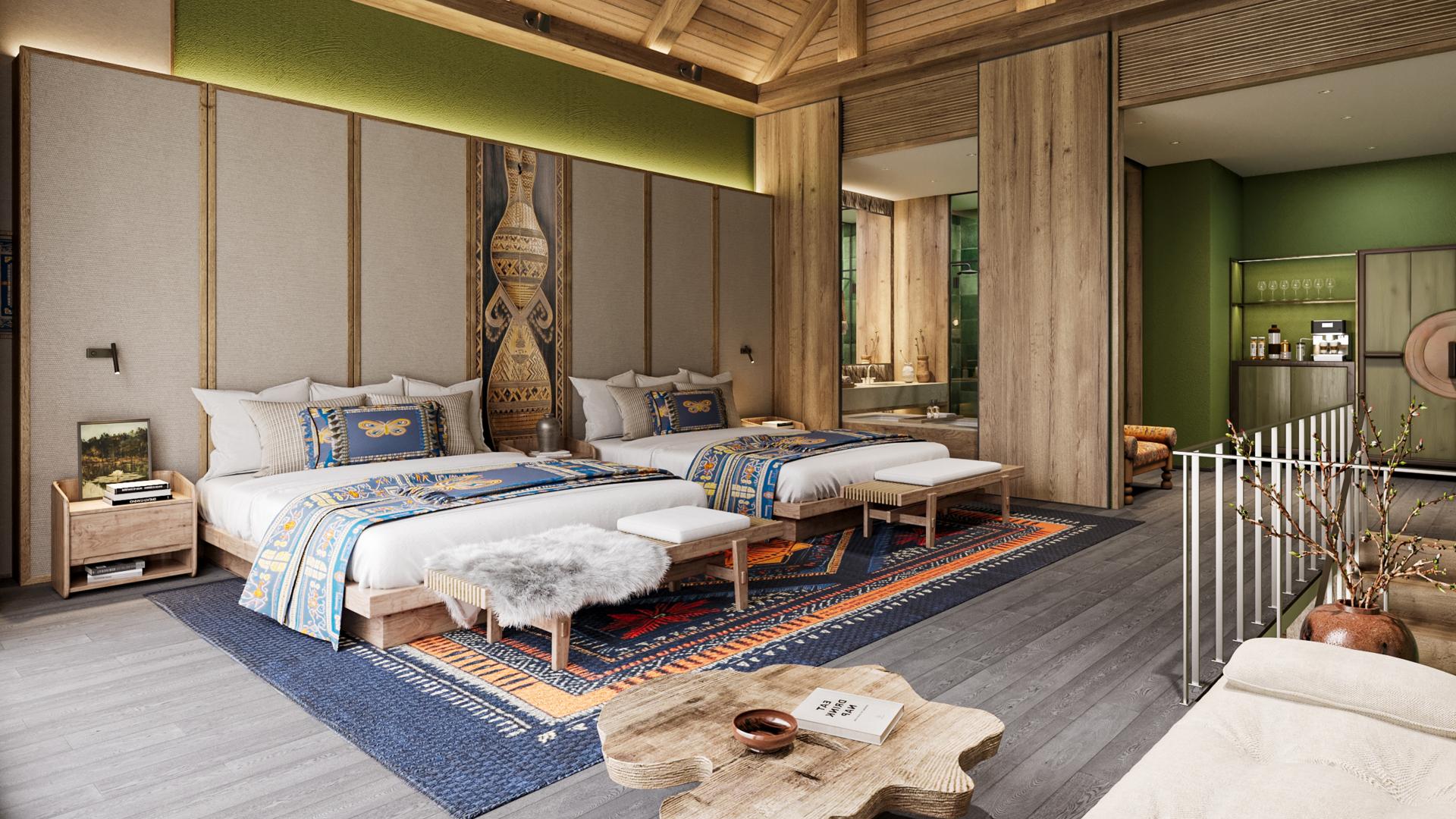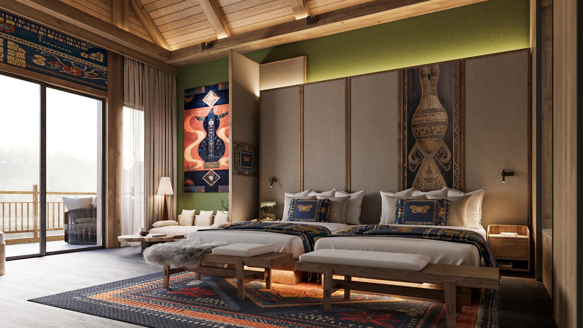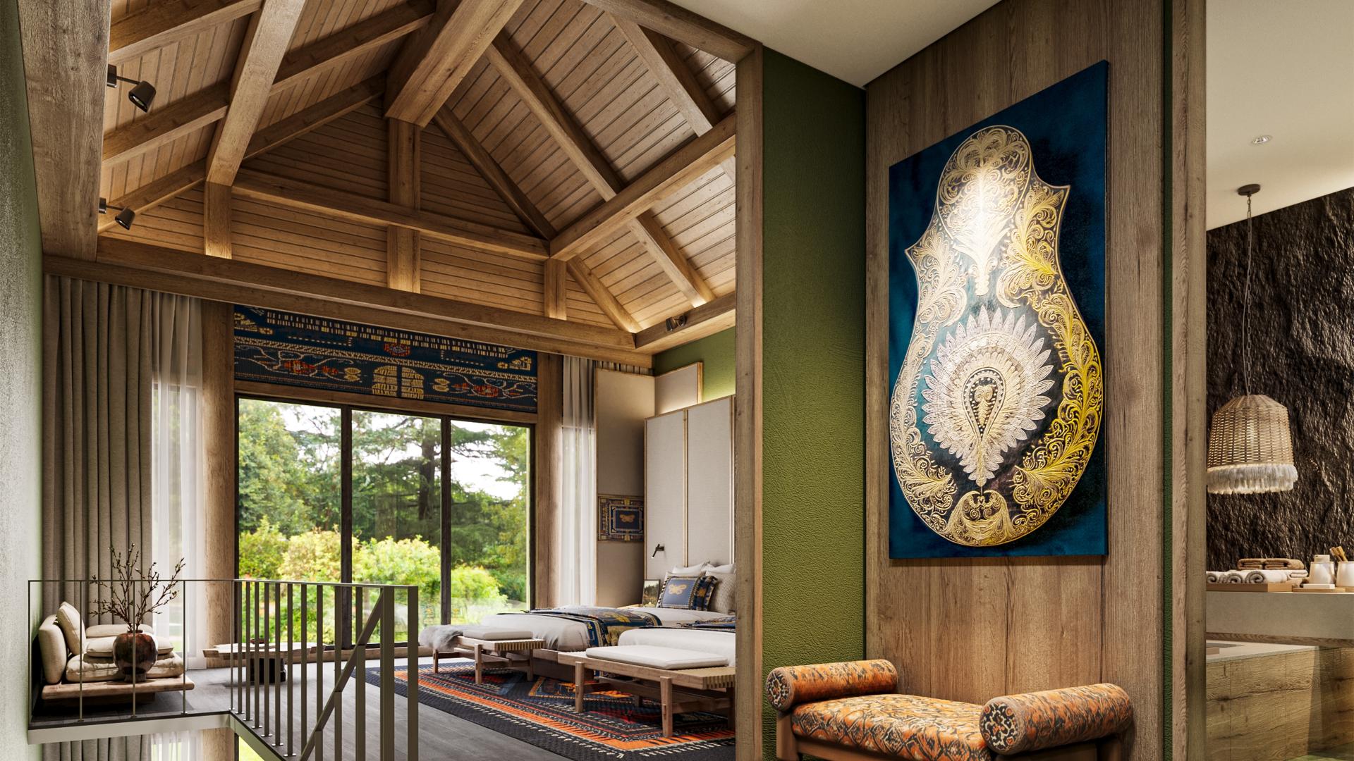 This project extensively uses local timber, bamboo, rattan, rammed-earth textured coatings, and ethnic-style stone, showcasing the warmth and simplicity of natural materials. The wooden beam structures of the ceilings, the textured coatings on the walls, and the antique-style bricks and stones on the floors all echo the architectural wisdom of traditional local dwellings. Especially in areas like the reception hall and guesthouse rooms, ethnic textiles such as Dai brocade, Lahu embroidery, and Va weaving are widely used for curtains, bedding, cushions, and tapestries. Their delicate craftsmanship and unique patterns infuse the space with a rich cultural atmosphere and a warm, human touch.