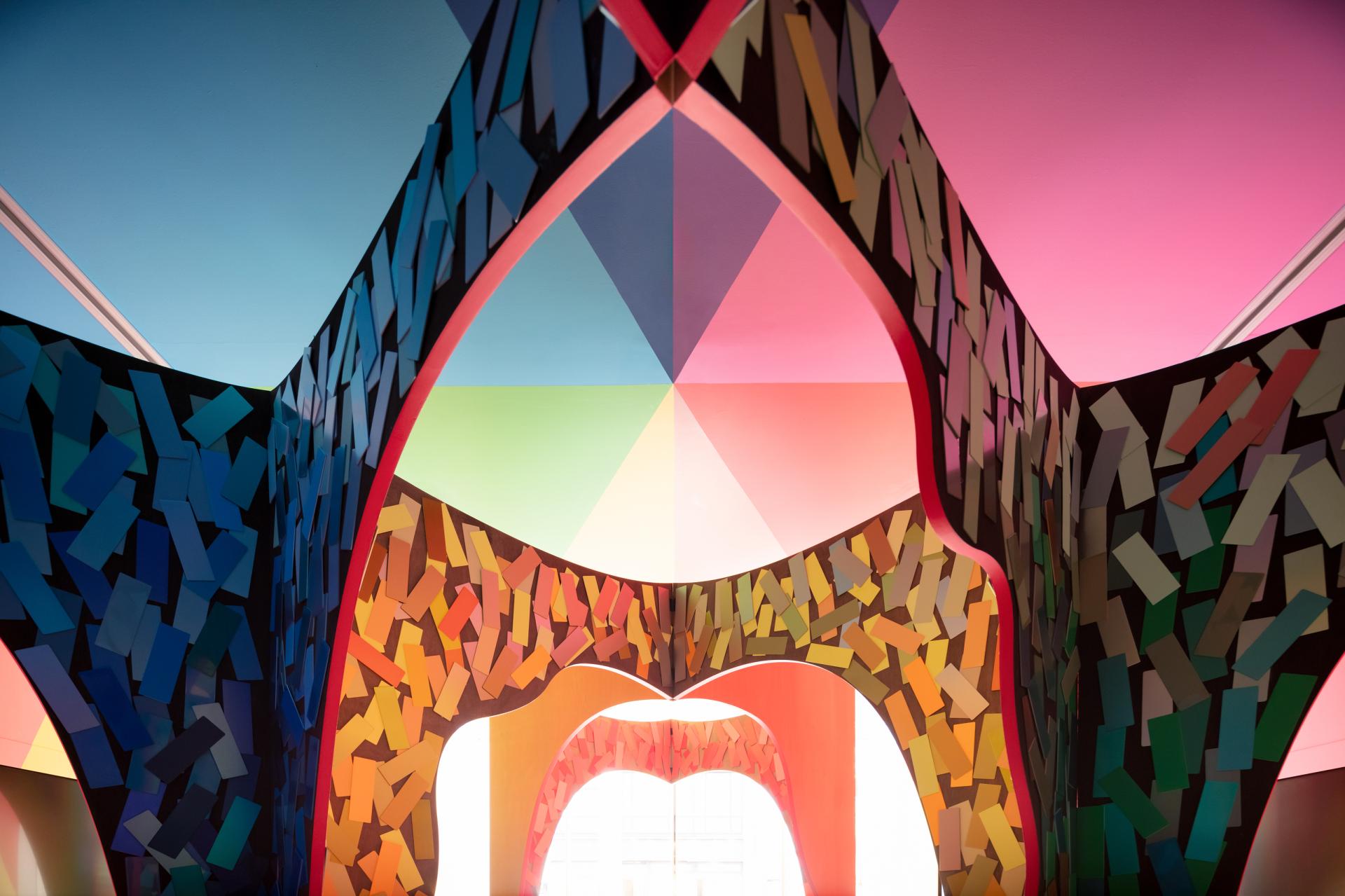 In the center of the space is a beautiful series of arches decorated with paint sample strips, creating a labyrinth-like space that naturally invites visitors to enter a world of color.