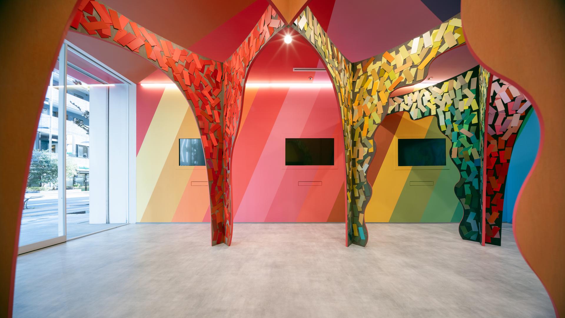 In Japan, the changes brought by each season foster a diversity of hues that liven the landscape with colors. Since the four seasons are the result of a tilt in the Earth's axis of rotation, we drew lines of various colors on the walls at an angle matching said axis, thereby rhythmically filling the space with the colors of the rainbow.