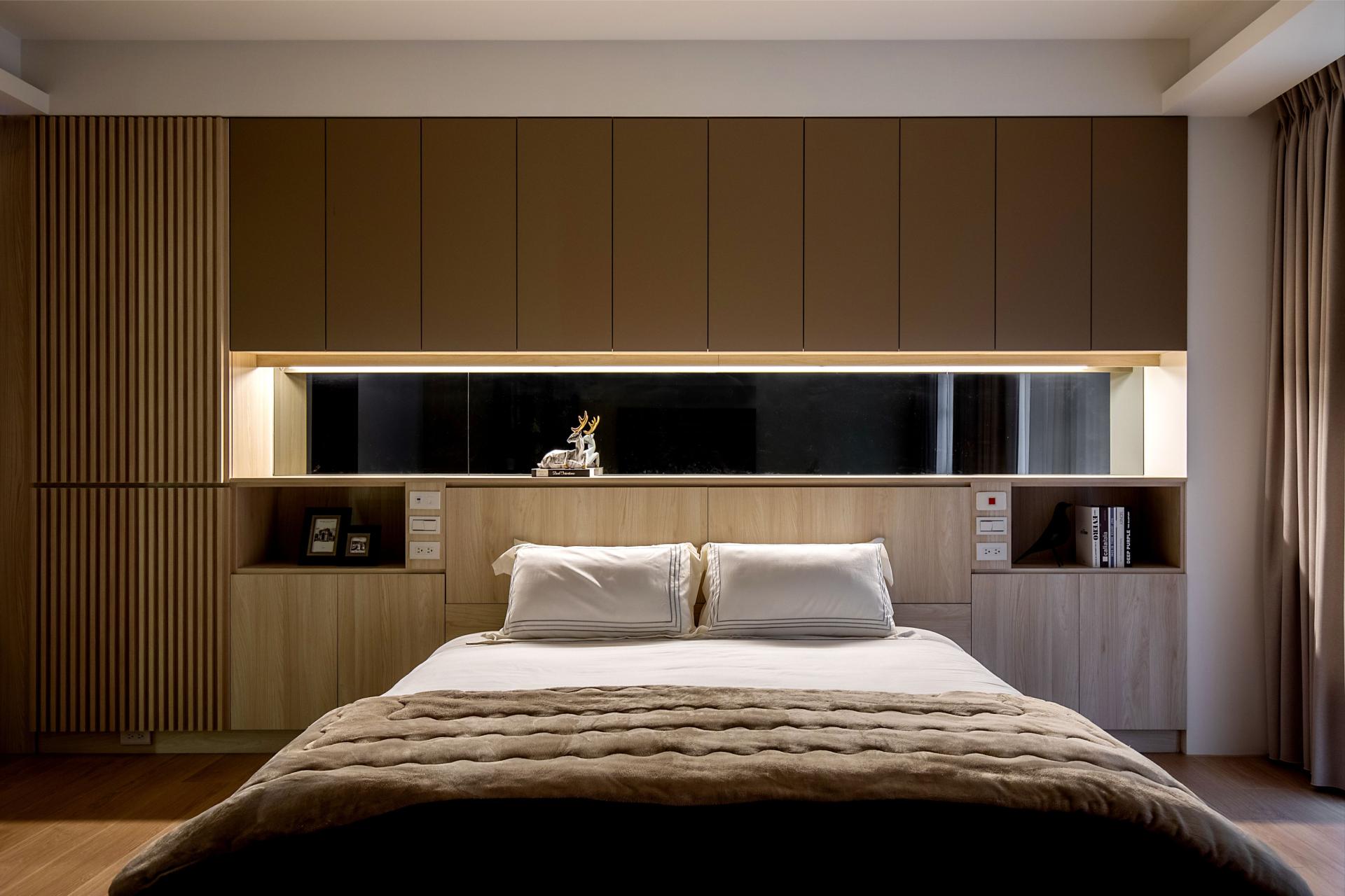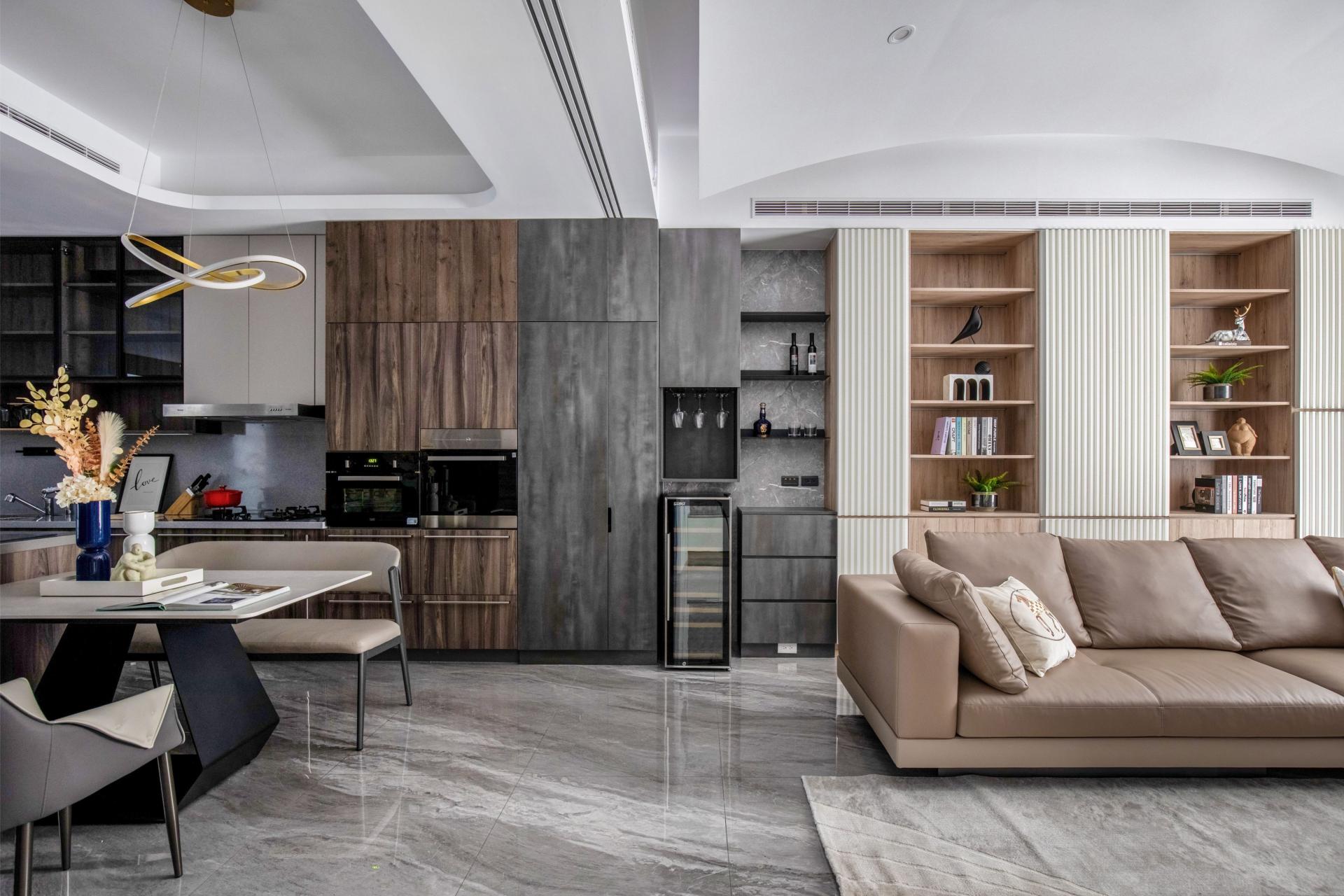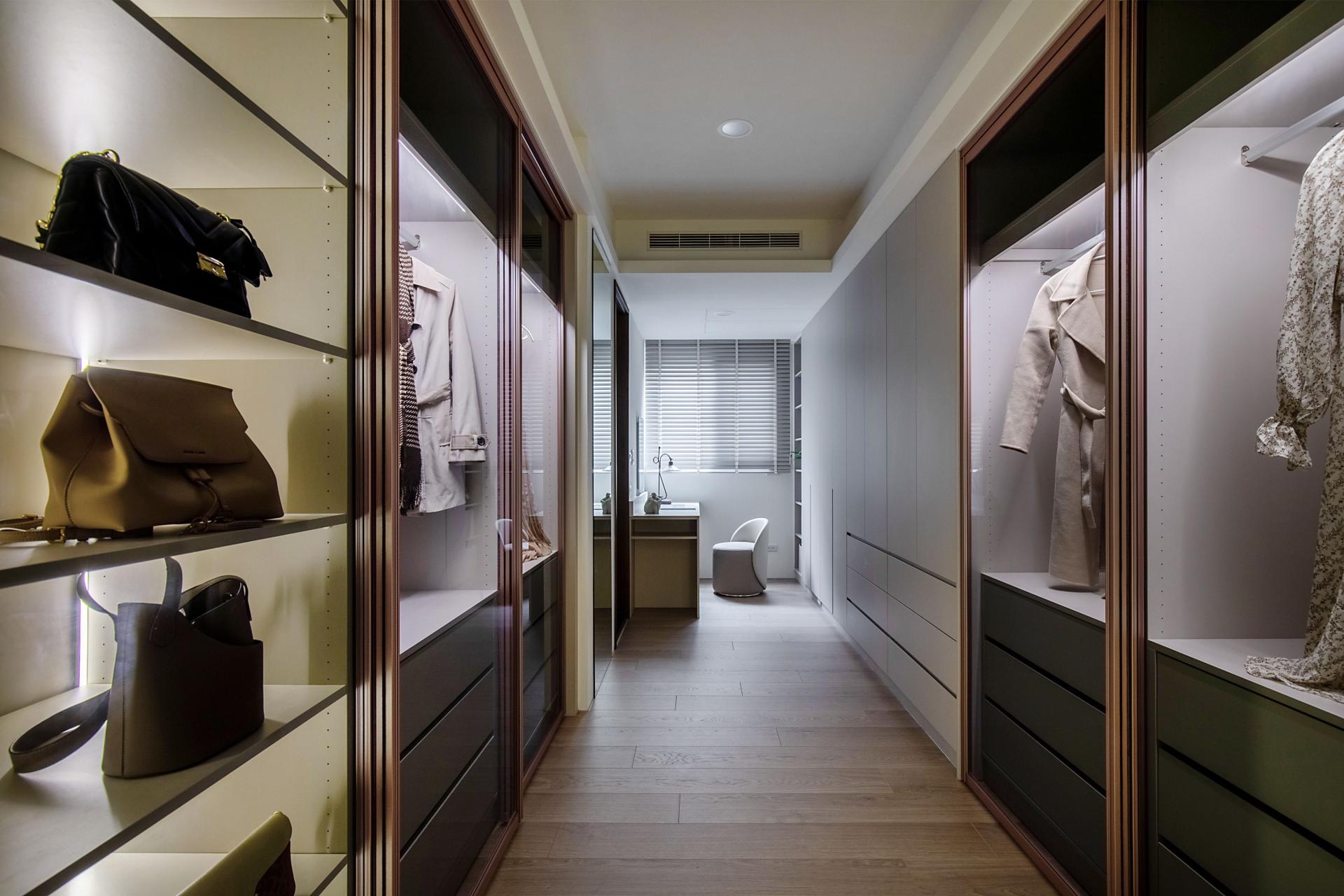 Storage is written into the architecture. Full-height matte cabinetry sets a measured vertical cadence, absorbing belongings into quietly articulated planes. Integrated pulls, concealed lighting tracks, and disciplined reveals reduce cognitive noise and let daily rituals take the foreground. Material registers remain calm such as low-sheen laminates, light wood veneers, tempered glass with softened reflection, building a tactile calm that is felt before it is seen.