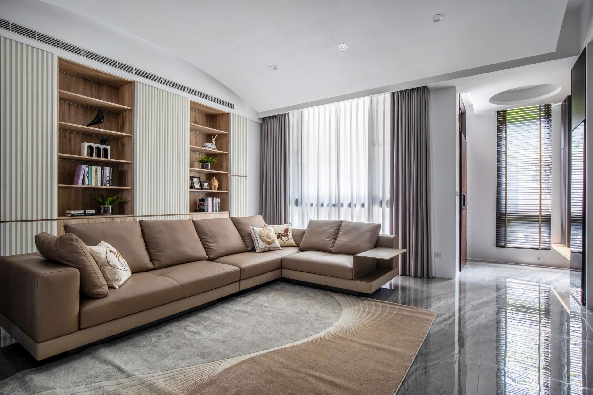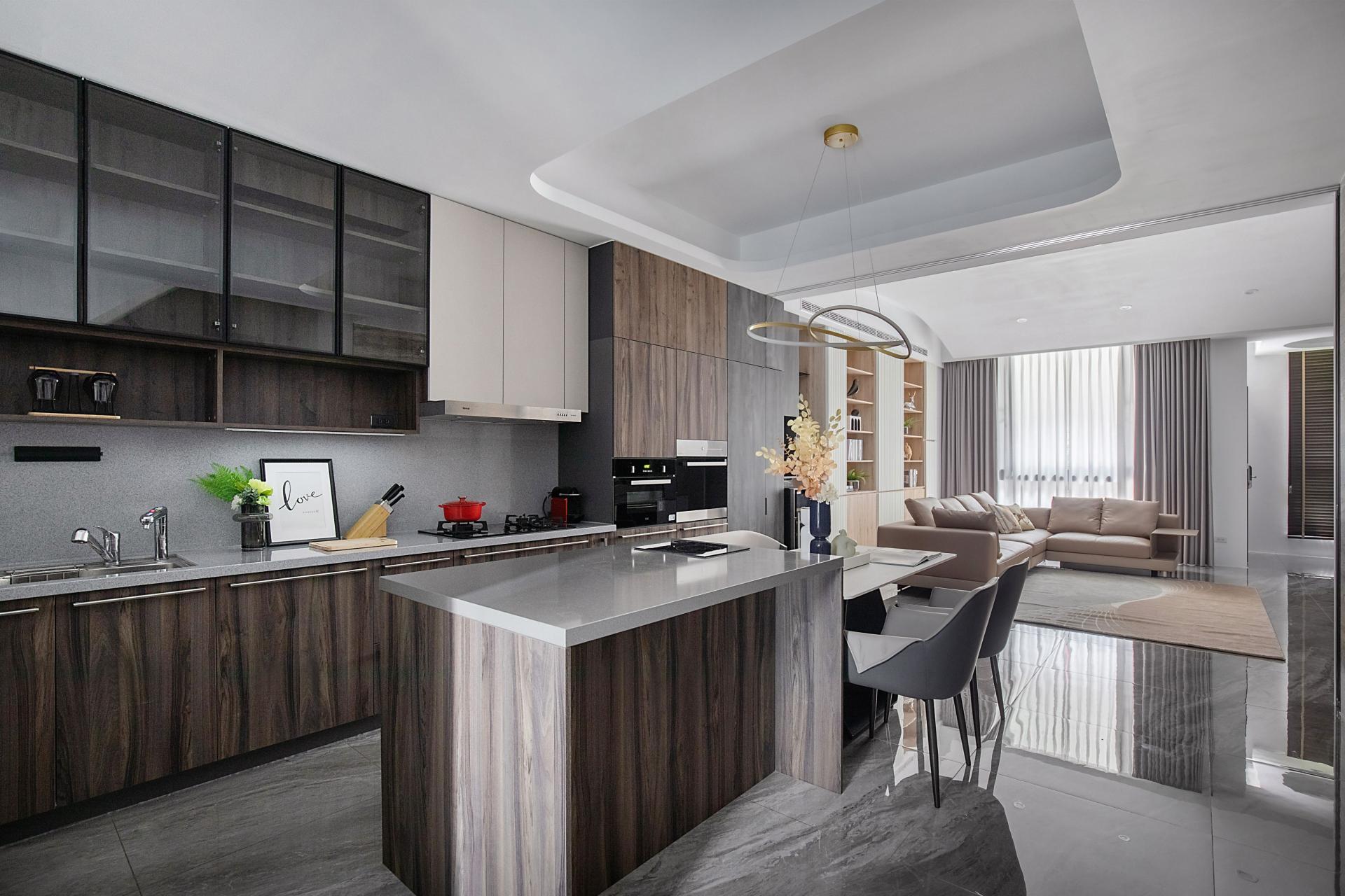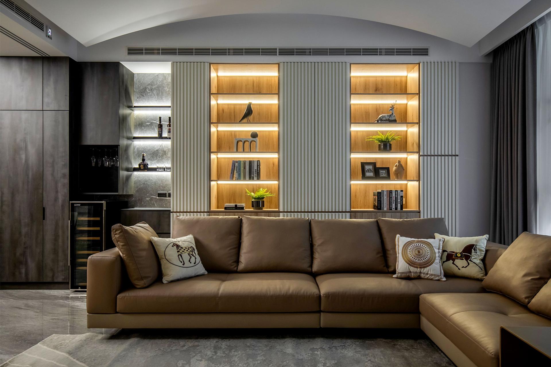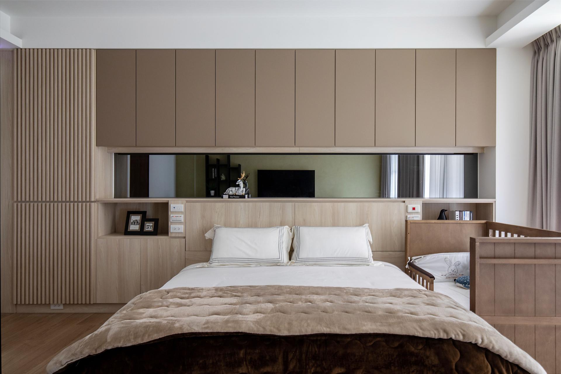Storage is written into the architecture. Full-height matte cabinetry sets a measured vertical cadence, absorbing belongings into quietly articulated planes. Integrated pulls, concealed lighting tracks, and disciplined reveals reduce cognitive noise and let daily rituals take the foreground. Material registers remain calm such as low-sheen laminates, light wood veneers, tempered glass with softened reflection, building a tactile calm that is felt before it is seen.