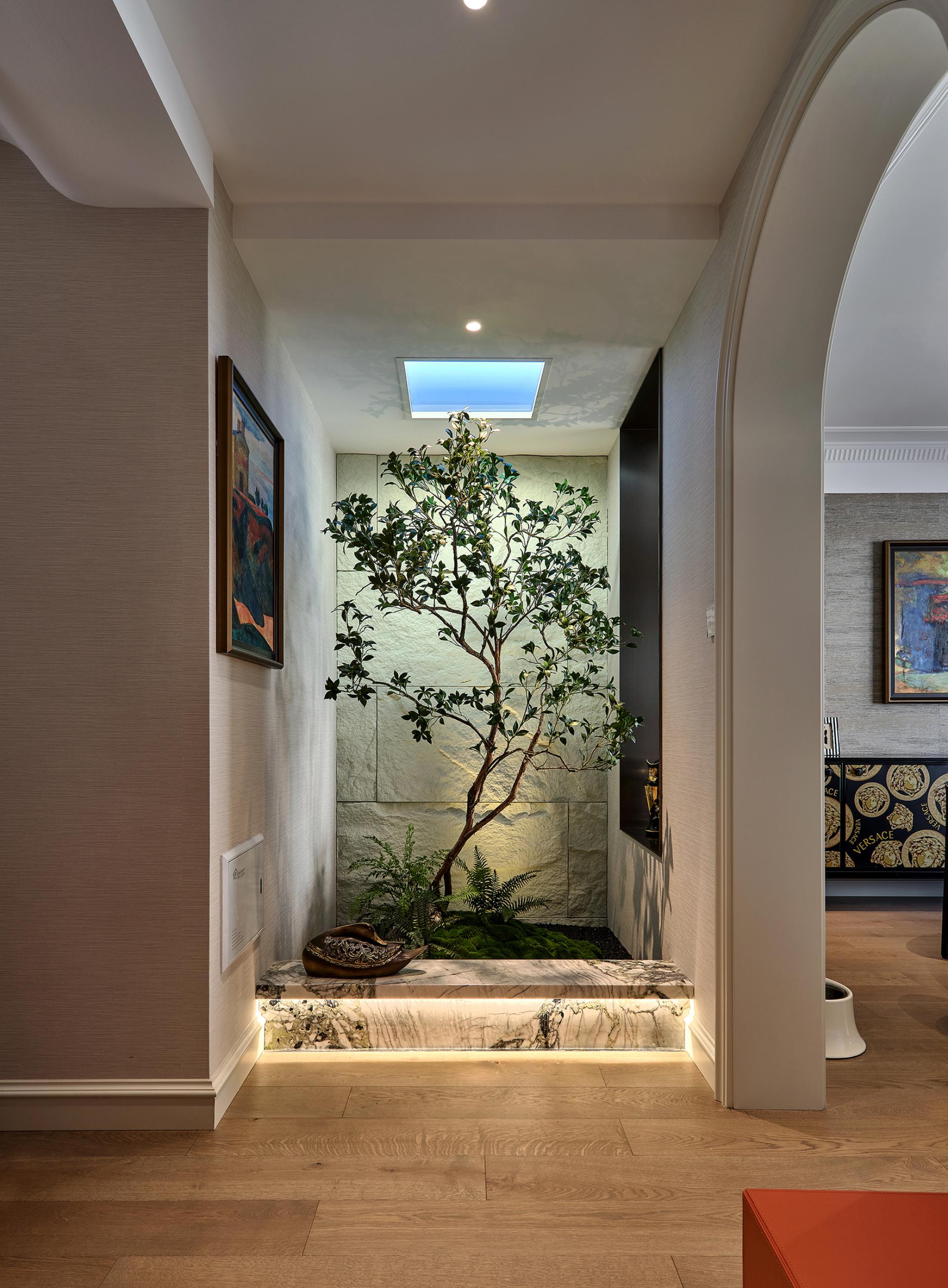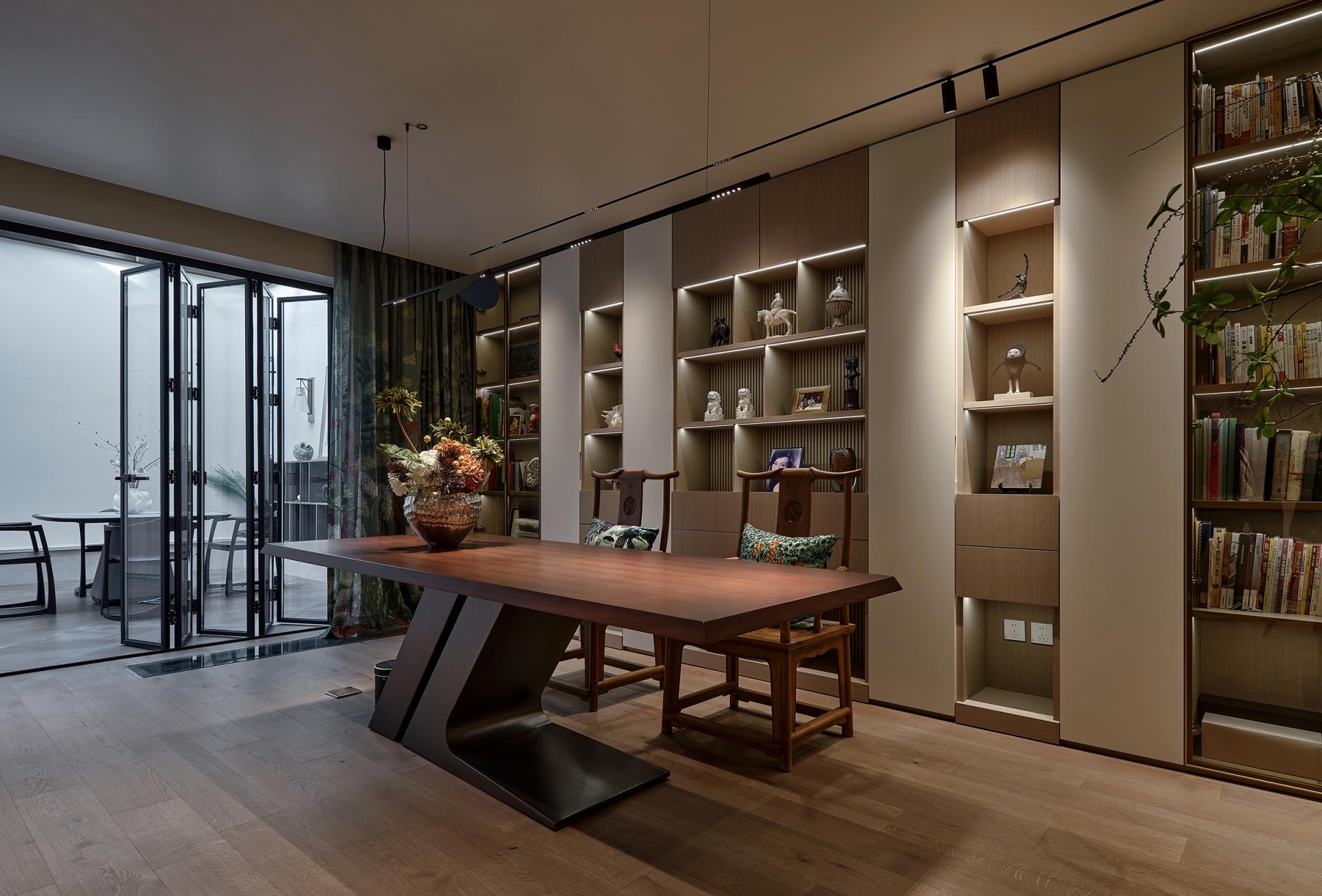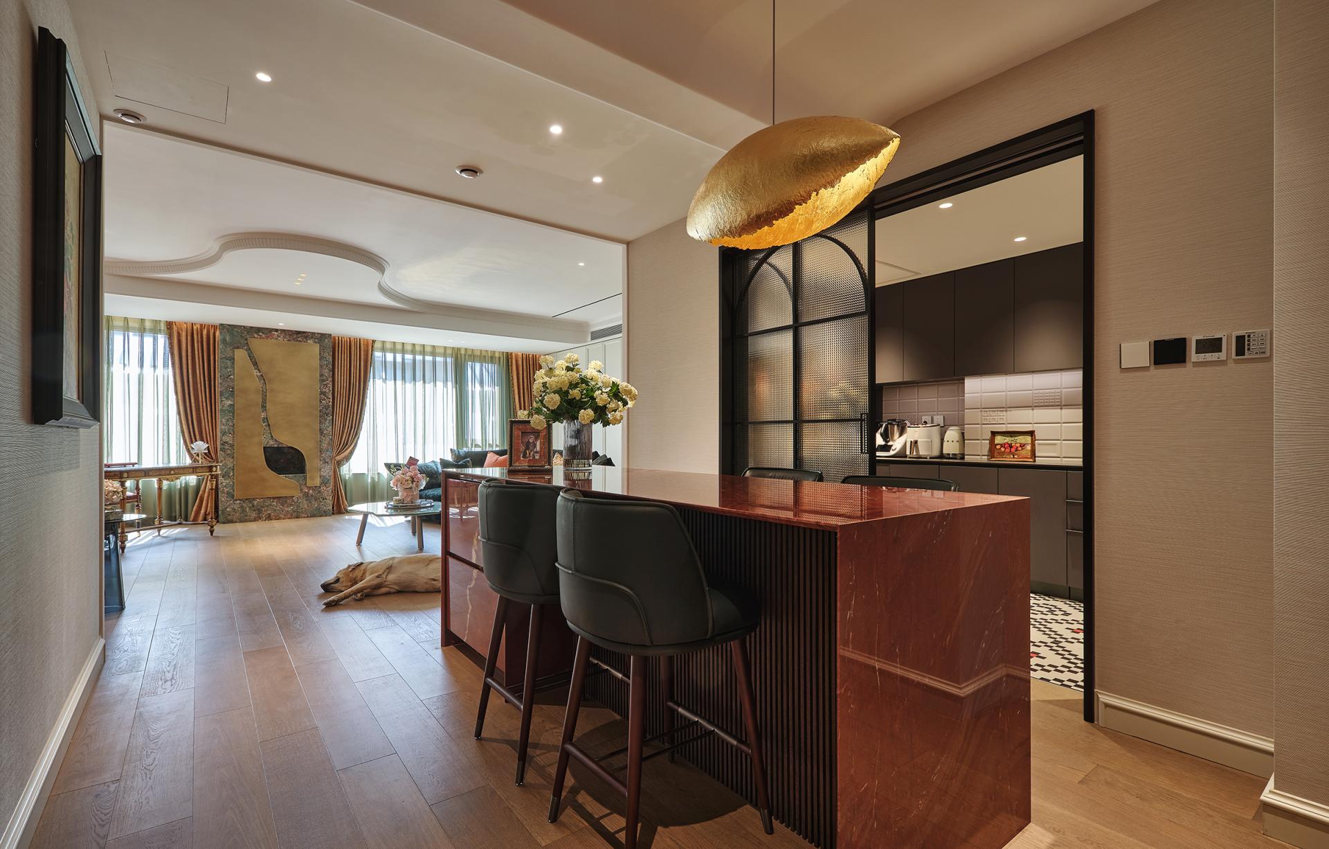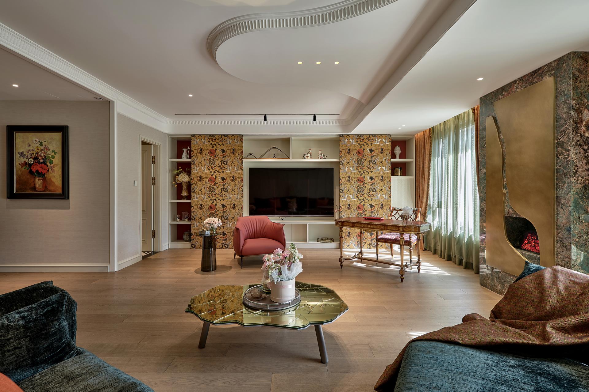 This villa project is built around the concept of “coexistence between classic and fashion,” creating a mixed-aesthetic space through bold contrasts in color, texture, and light. The palette features a dramatic interplay between black-gold and red-green hues, softened by natural gray-brown tones to create a harmonious emotional atmosphere. The material palette is equally diverse—juxtaposing cool marble and matte black steel with soft velvet, leather, and carved wood—blending luxury with warmth. Furniture and decorative elements reinforce the narrative: vintage wallpapers, bronze sculptures, and curated art installations blur the lines between tradition and modernity, expressing the owner’s individuality. Key visual focal points include emerald green sofas paired with burgundy chairs, metal and glass wall compositions, and an expressive crystal chandelier above a rustic wooden dining table. These elements work in concert to deliver a space that is both visually rich and emotionally resonant. Lighting is meticulously layered, using natural light from floor-to-ceiling windows and warm artificial lighting to create dynamic, shifting shadows across the varied materials. The result is a living environment that changes with the time of day, reinforcing the space’s emotional depth and elegance. This project goes beyond mere functionality, crafting a villa that embodies cultural richness, artistic expression, and modern comfort—setting a benchmark for personalized luxury living.