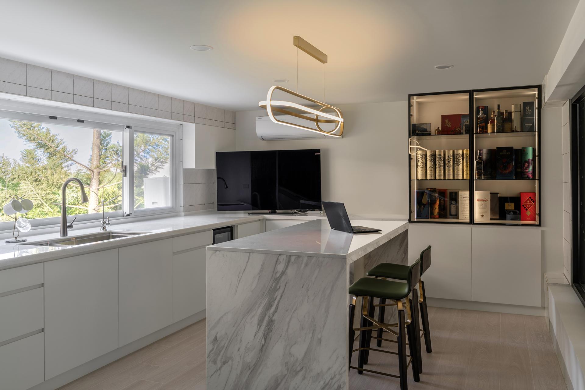 With one of the residents experiencing limited mobility, this multi-generational townhouse was redesigned with a strong emphasis on universal design that ensures all four family members can live safely and comfortably, for now and in the years to come. The ground floor now features an open layout encouraging effortless movement and seamless wheelchair accessibility. A newly added elevator greatly enhances vertical circulation, offering convenience and safety. In the kitchen area, a full-height glass partition is elegantly placed at the corner to eliminate the danger of accidental bumping while contributing to the brilliance and sleekness. This gentle design gesture enhances safety and aesthetics, visually opening the space.