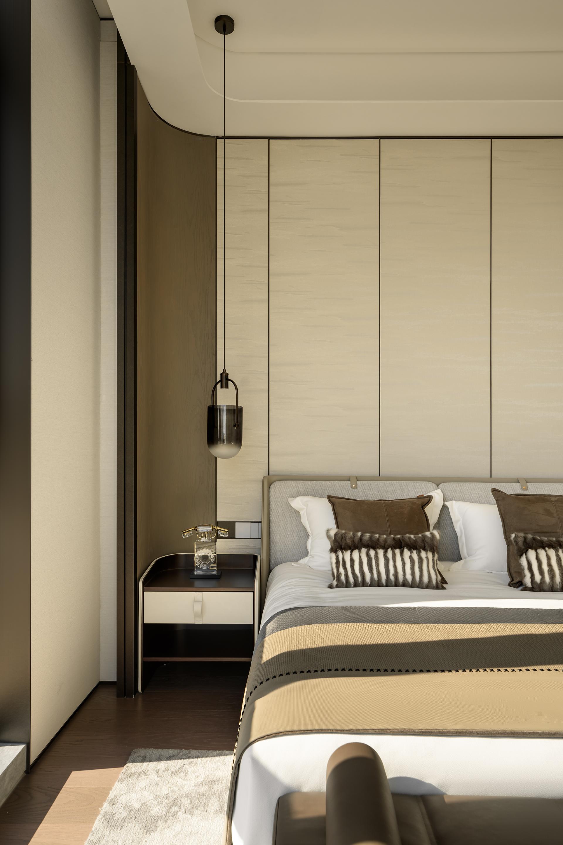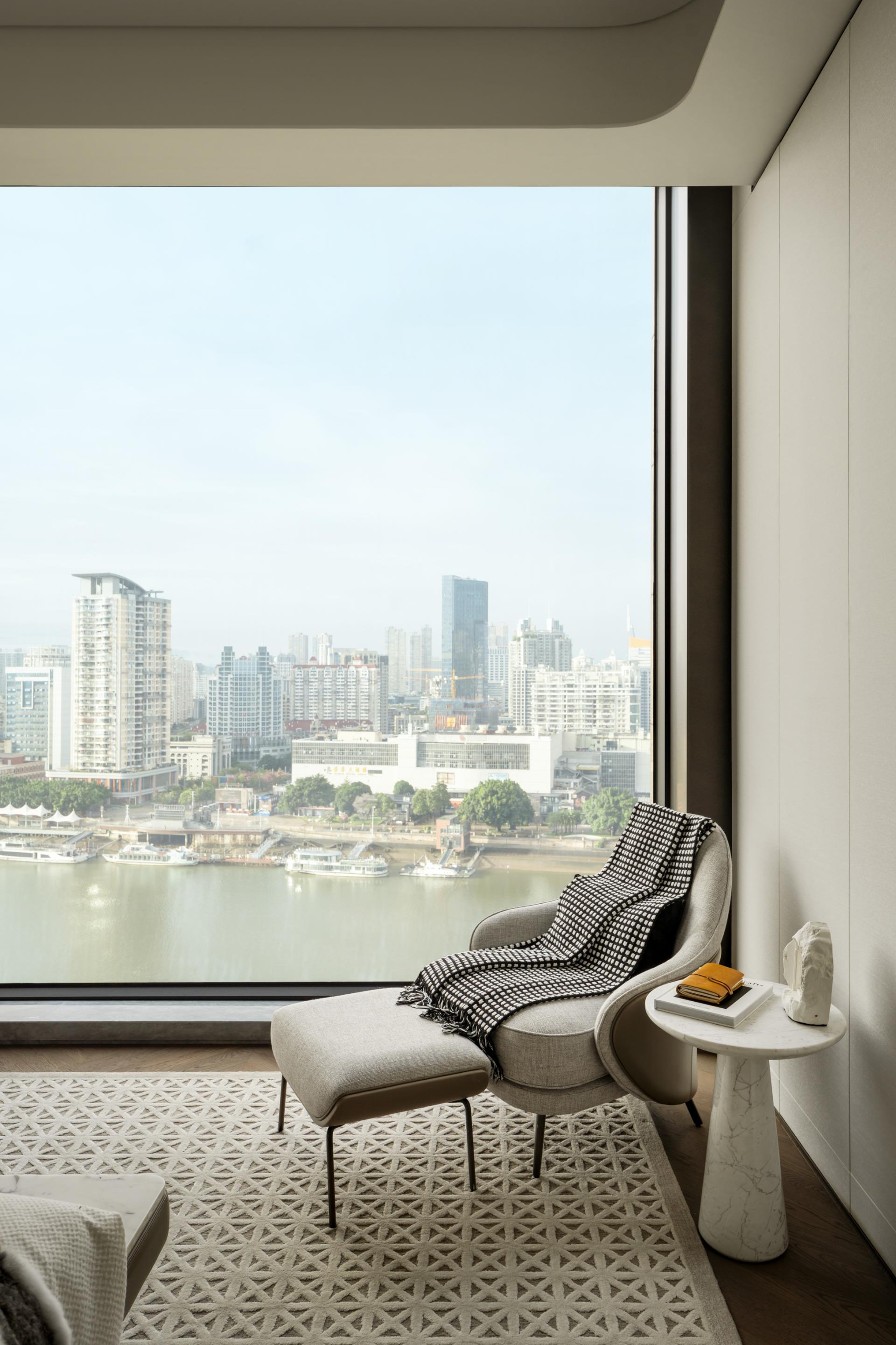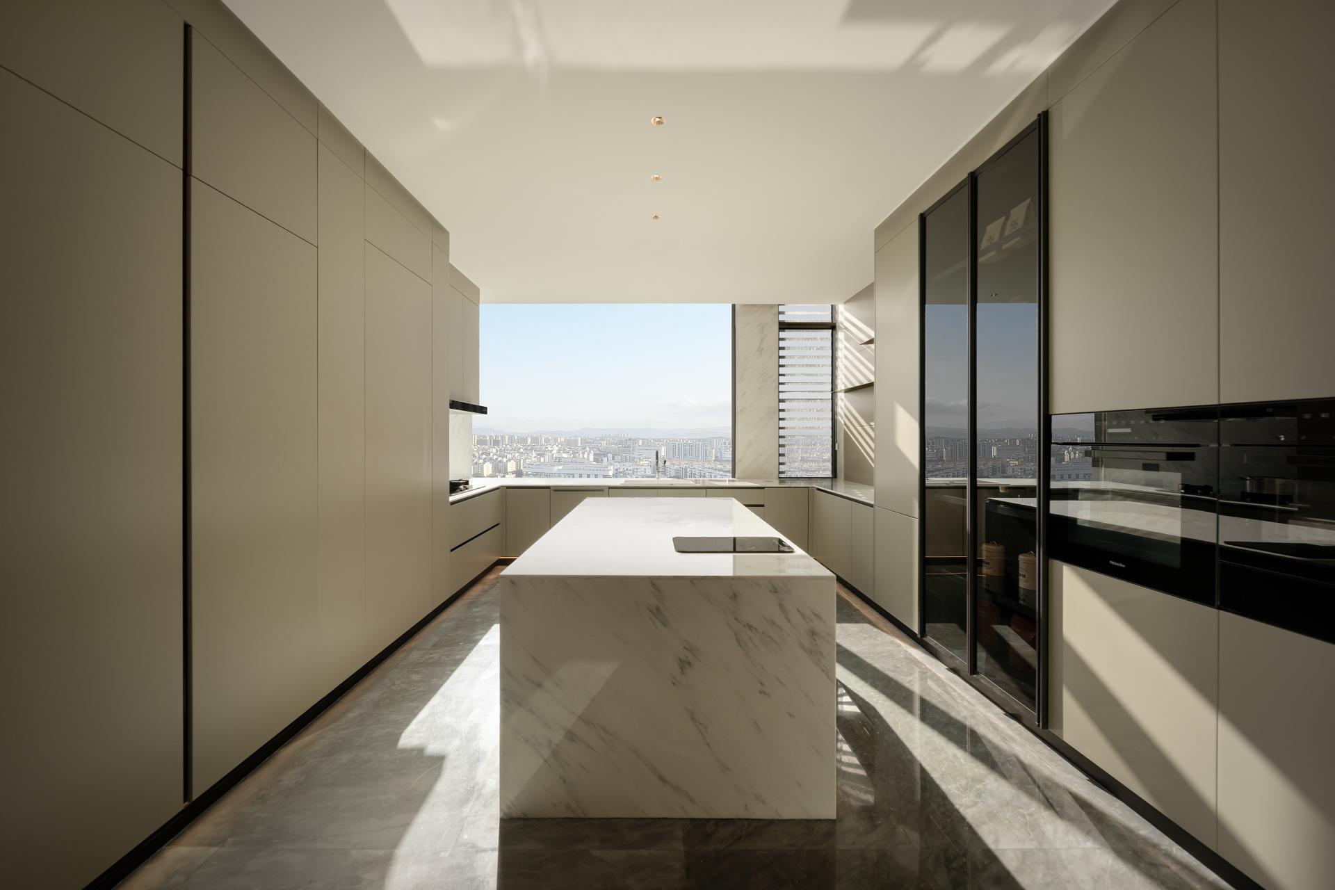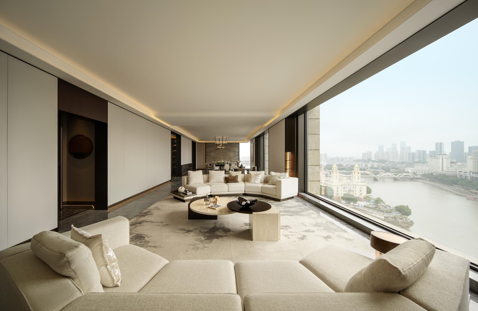 Within the show flat, expansive living spaces unfold, bathed in natural light from floor-to-ceiling windows that frame breathtaking panoramic views of the Fuzhou cityscape and serene river. A palette of sophisticated neutrals, from creamy whites to warm greys, creates an airy and tranquil environment, perfect for both relaxation and entertaining. The seamless flow leads to a state-of-the-art kitchen, where minimalist cabinetry and premium marble surfaces speak to functional elegance.