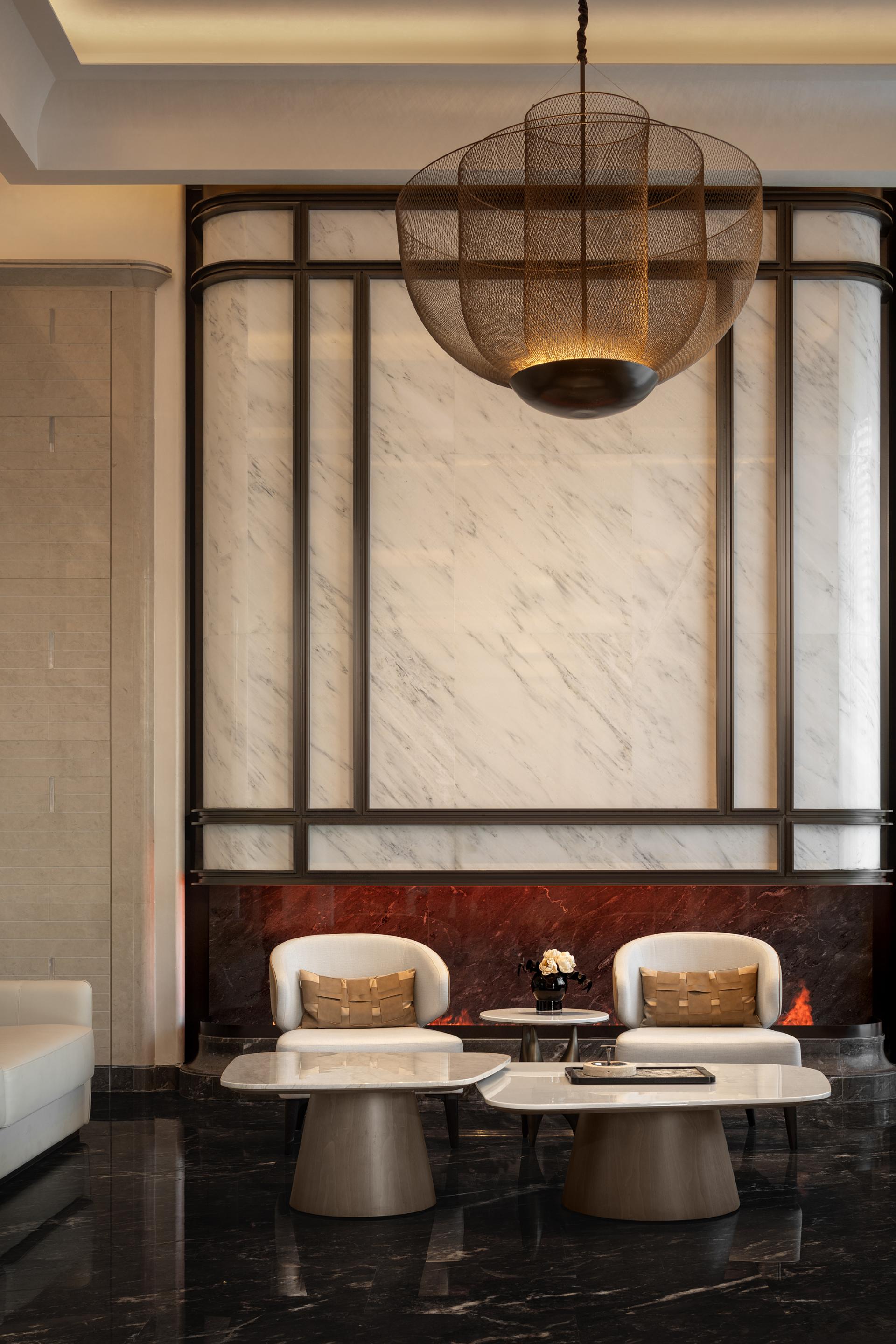 The clubhouse interiors are a masterclass in contemporary aesthetics. Rich, dark marble floors reflect bespoke lighting, creating an ambiance of warmth and exclusivity. Waiting areas blend tactile ribbed wall paneling with plush, inviting seating, punctuated by modern art and sculptural elements. Notice the dramatic mesh chandelier, a captivating centerpiece that hangs above elegantly appointed spaces, where pristine white marble walls contrast with bold metallic accents, showcasing a meticulous attention to detail.