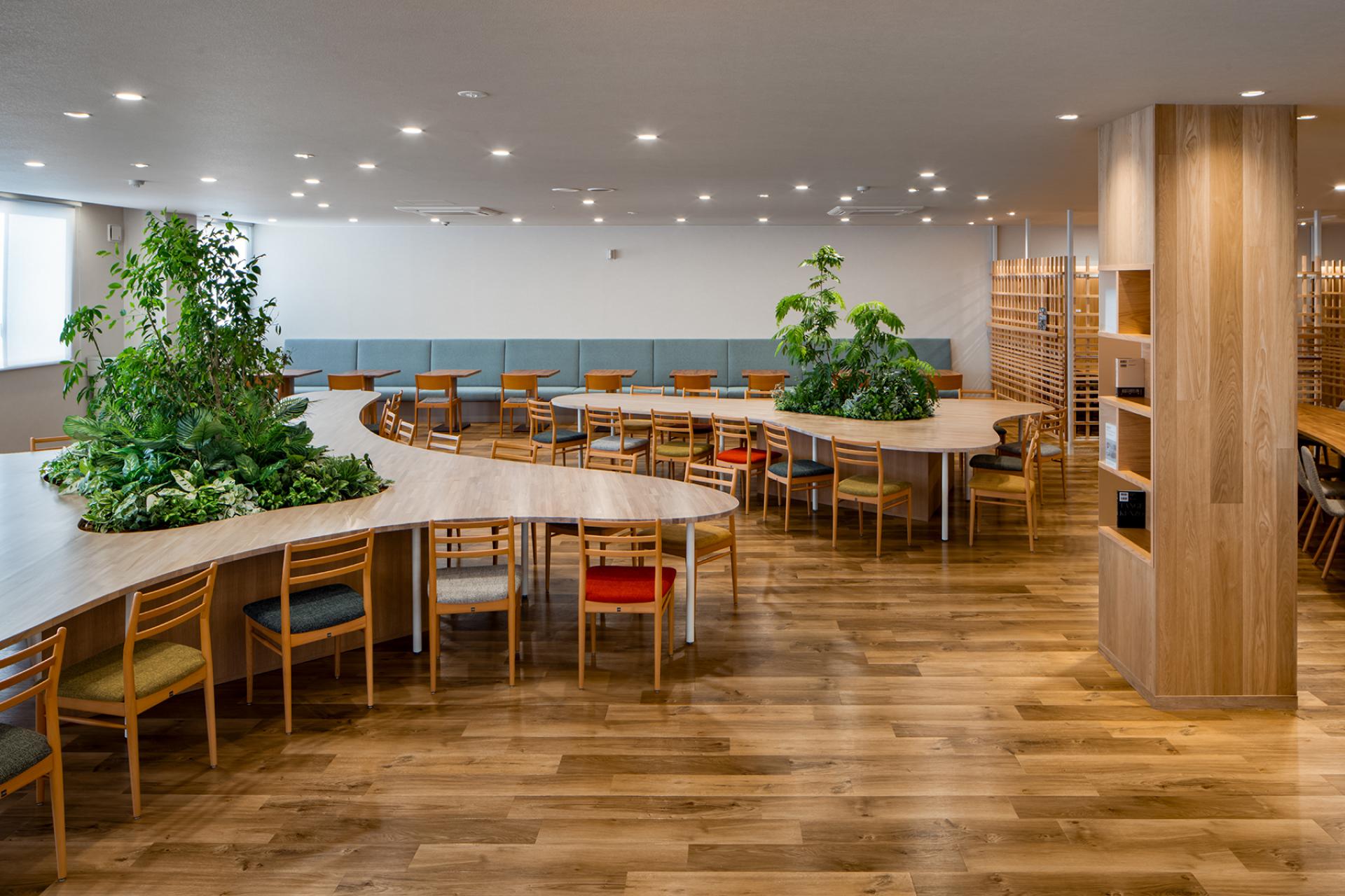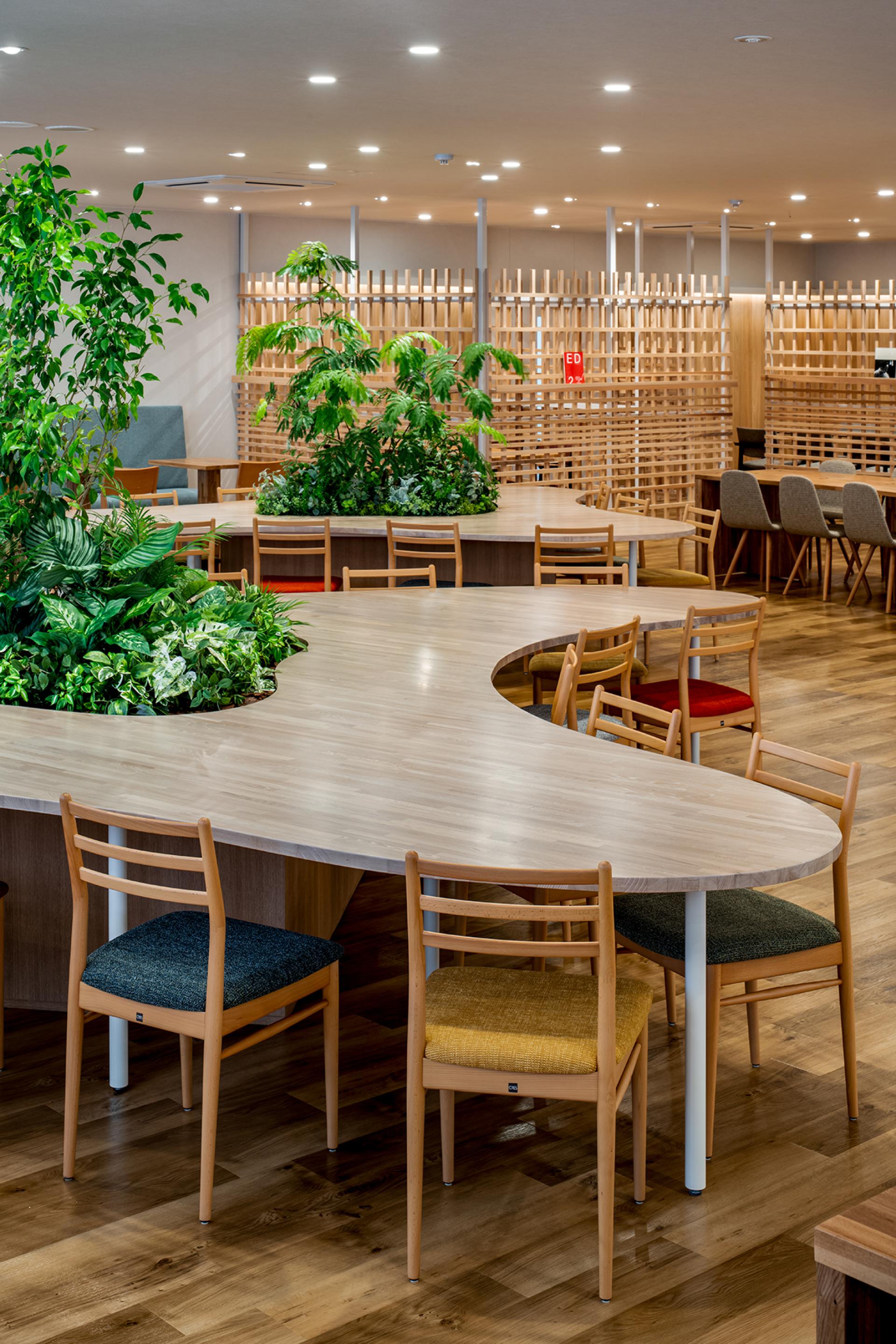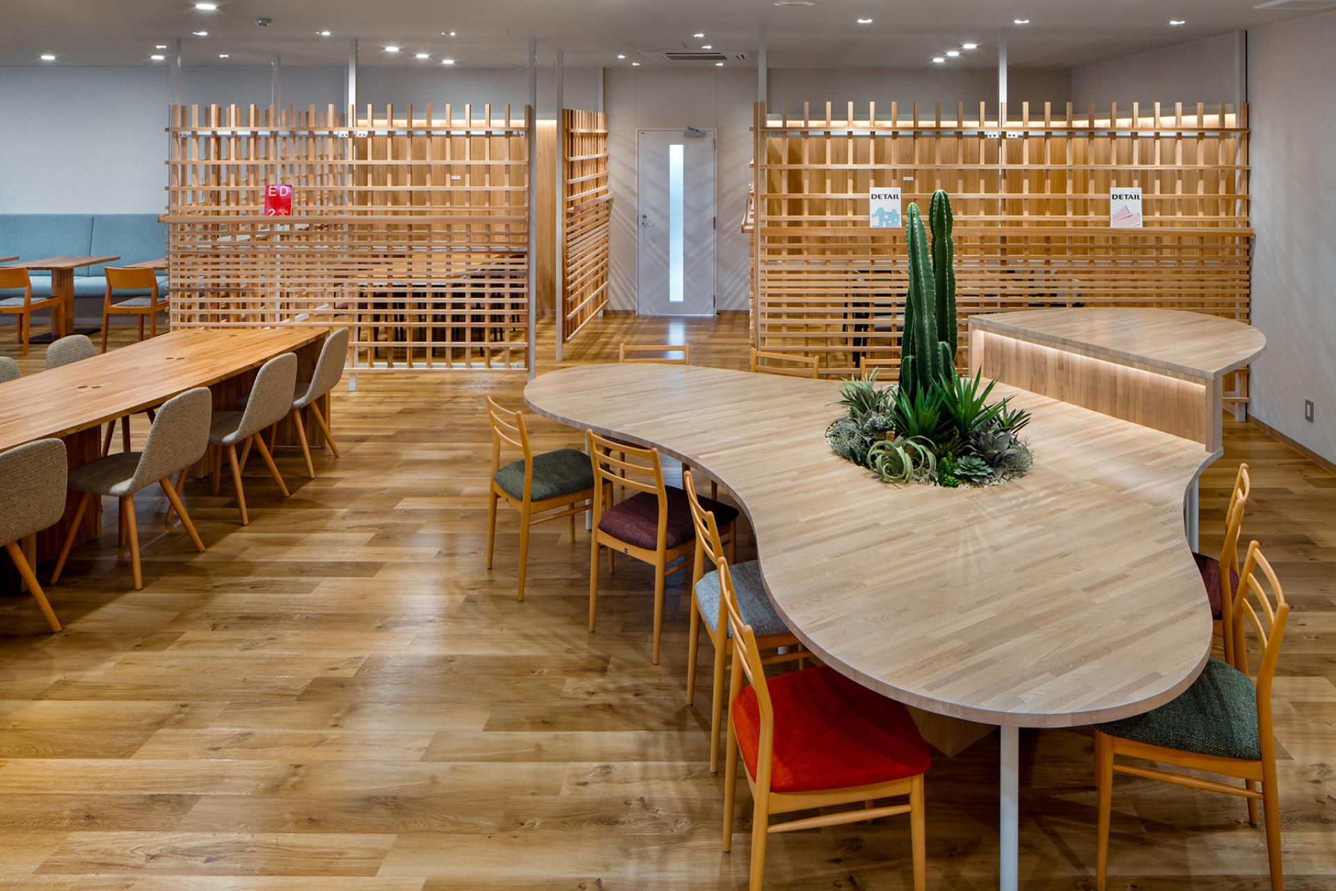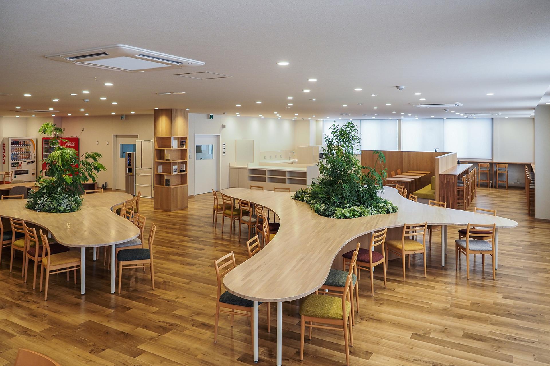 The cafeteria can accommodate approximately 120 employees during lunch time. The cafeteria can be used not only as a place to eat meals, but also as a meeting room outside of lunchtime. 3 irregularly shaped tables are arranged around a main table 8m long x 6m wide that seats 23 people, with a decorative plant in the center of the table. The irregular shape of the tables has the effect of removing the eyes from each other, and the design can accommodate from one to several people.