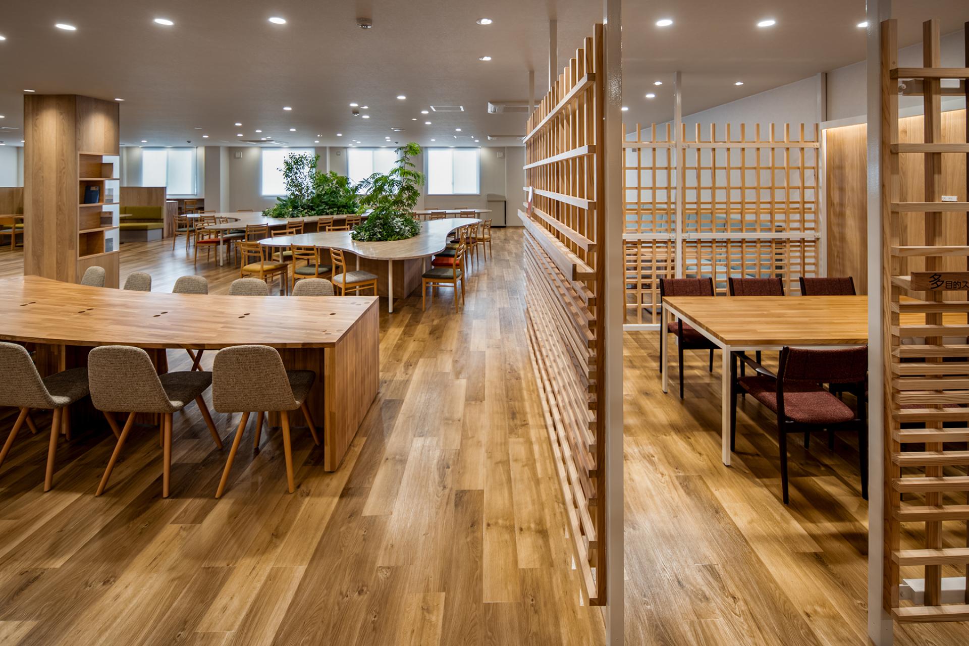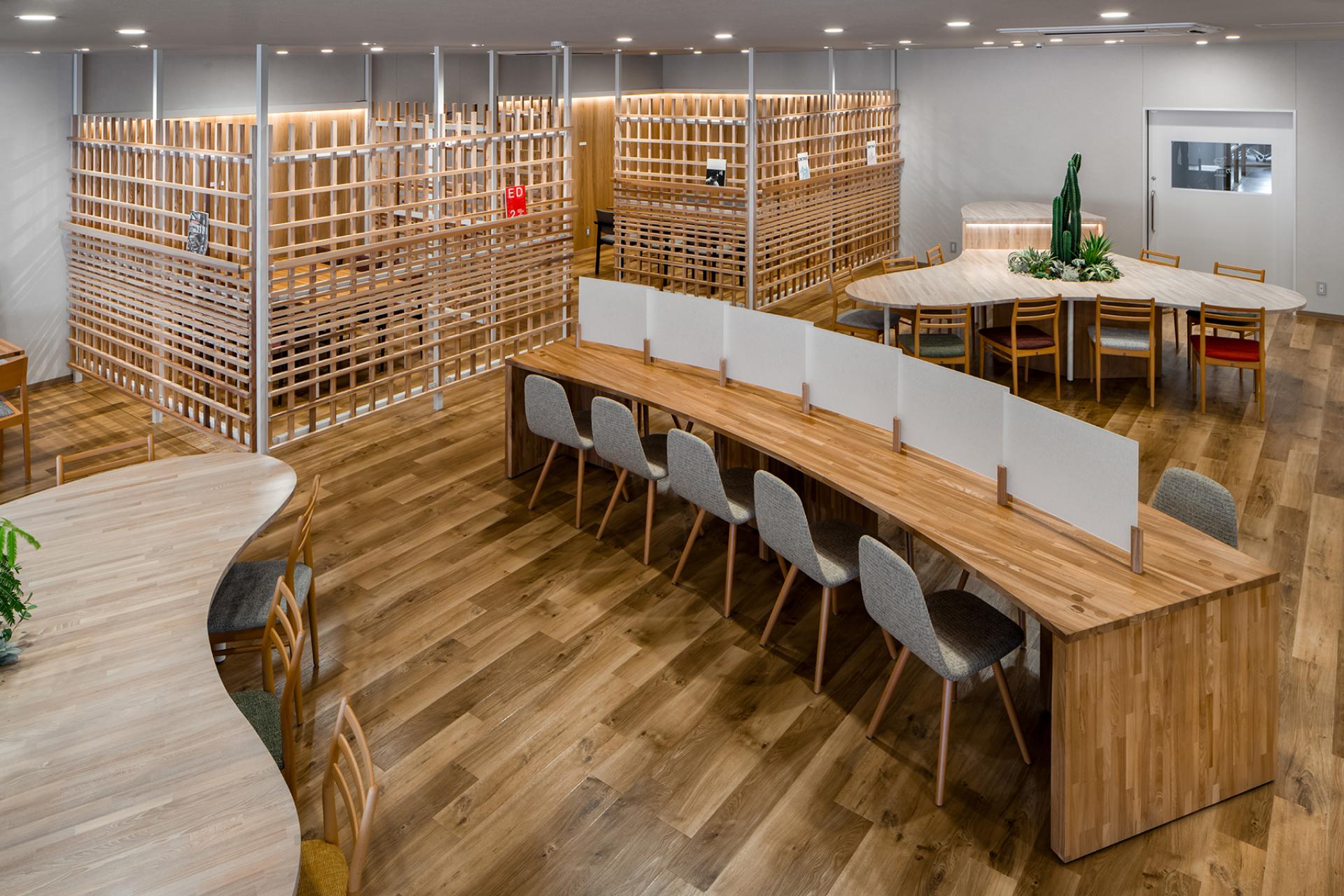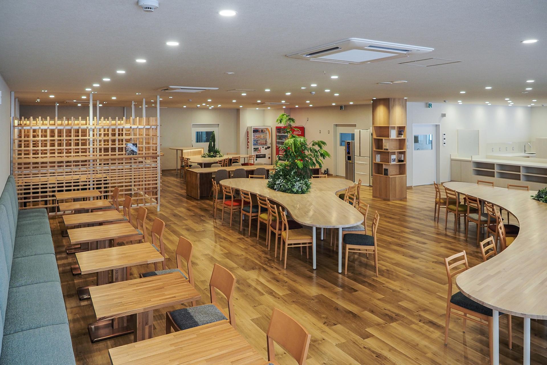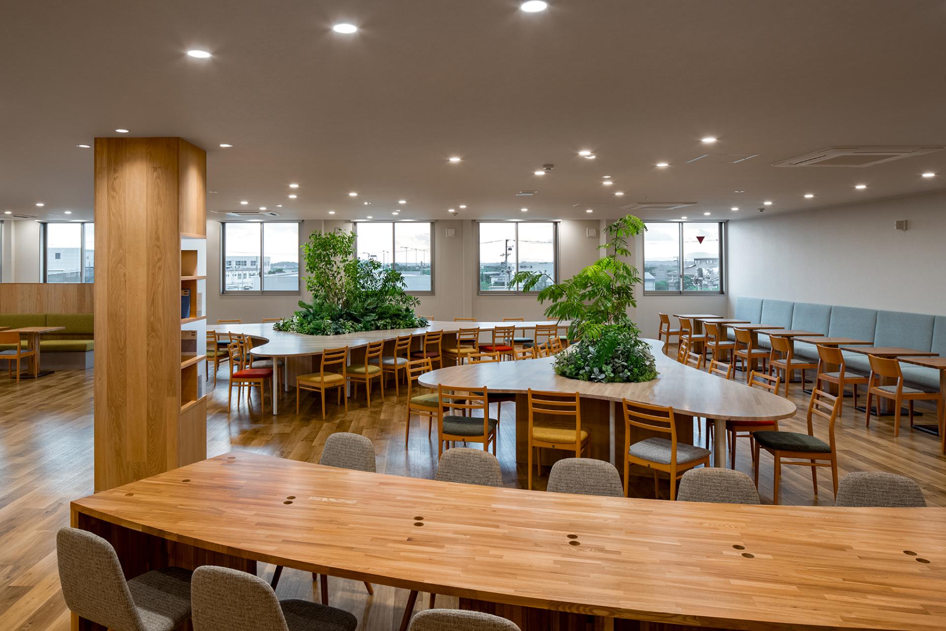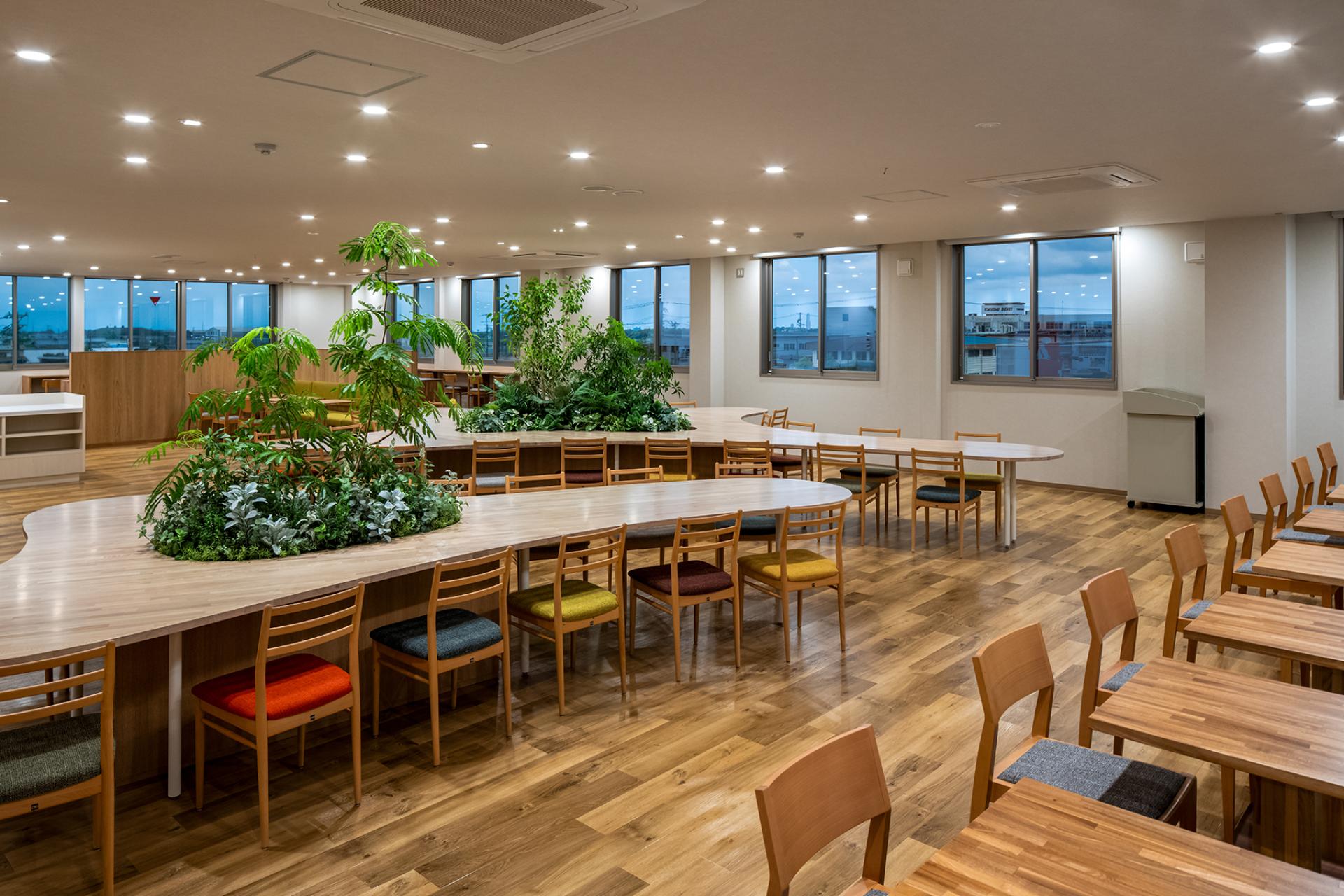 The cafeteria can accommodate approximately 120 employees during lunch time. The cafeteria can be used not only as a place to eat meals, but also as a meeting room outside of lunchtime. 3 irregularly shaped tables are arranged around a main table 8m long x 6m wide that seats 23 people, with a decorative plant in the center of the table. The irregular shape of the tables has the effect of removing the eyes from each other, and the design can accommodate from one to several people.