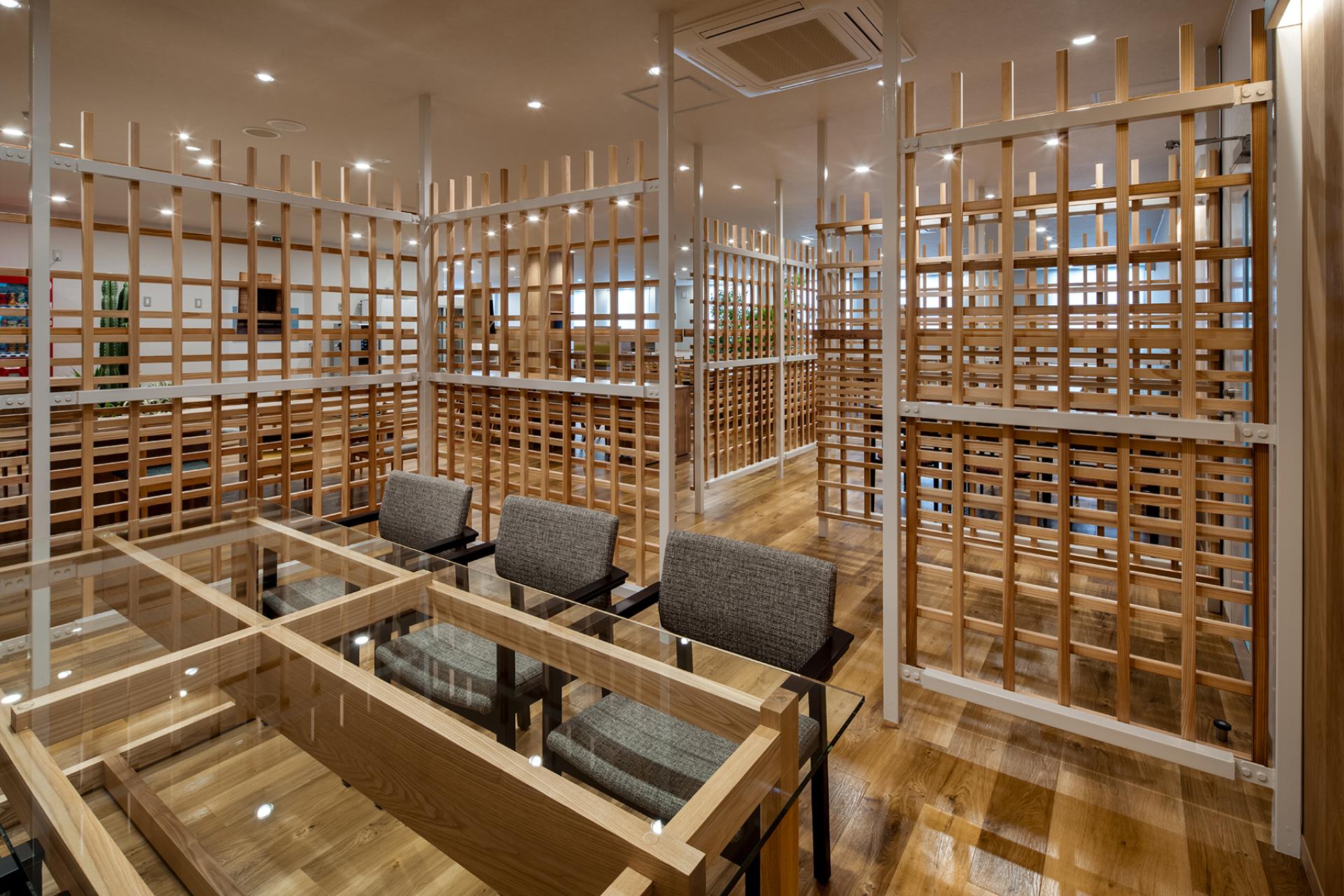 Seating with a high counter, tables for two, and wooden lattice frames were designed to create a sense of a private room that is both visible and hidden.