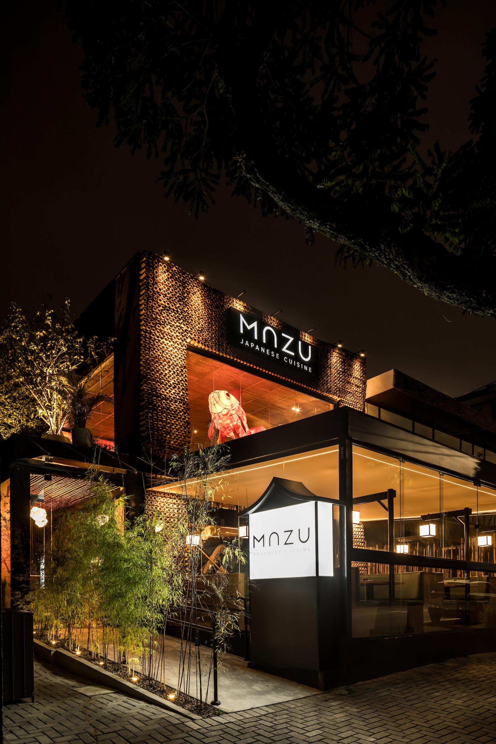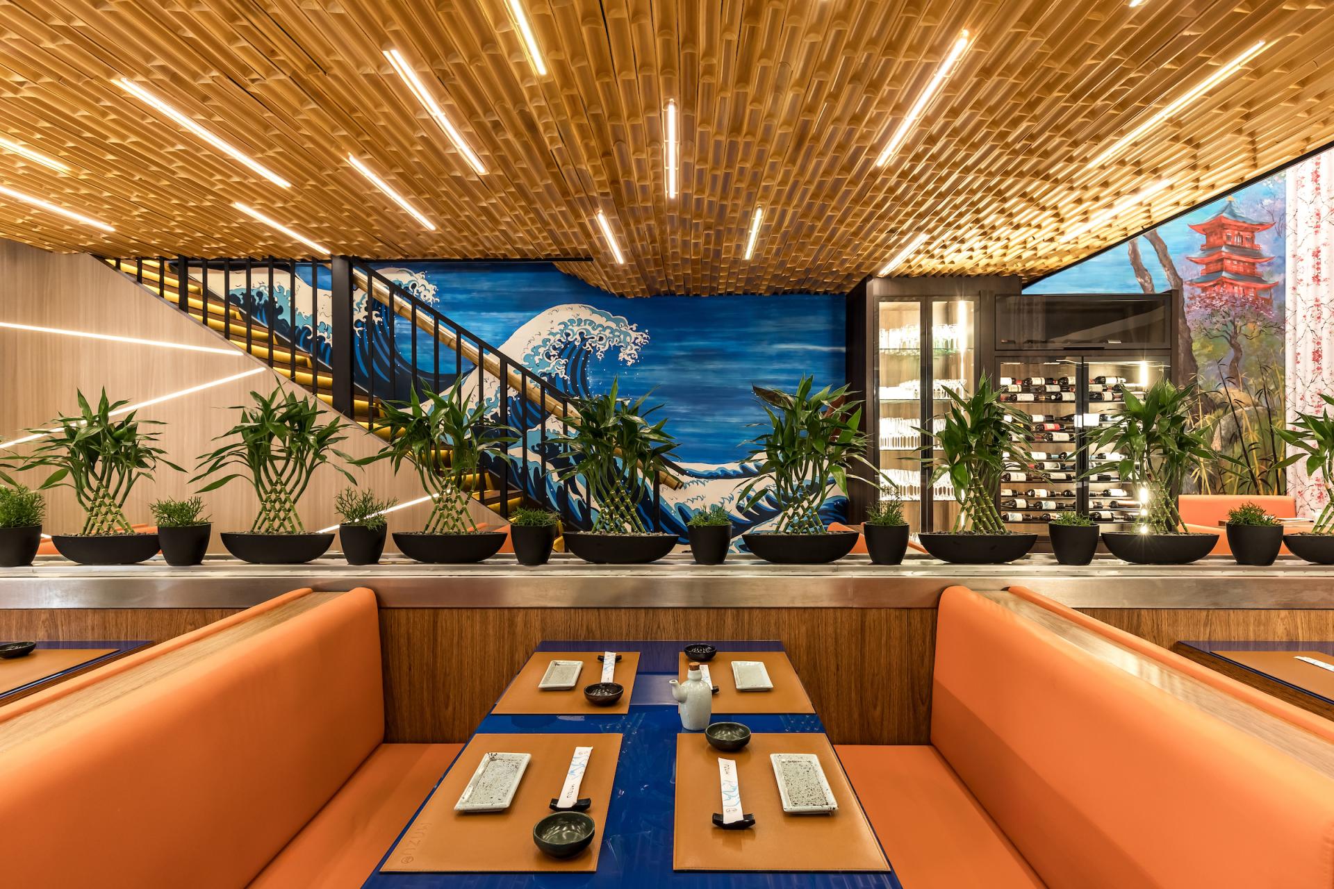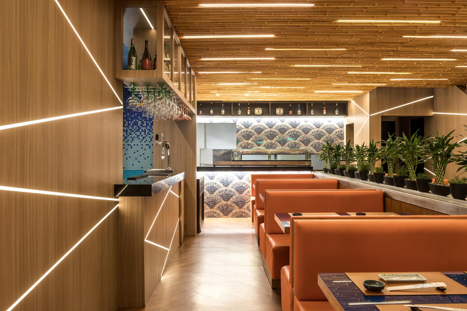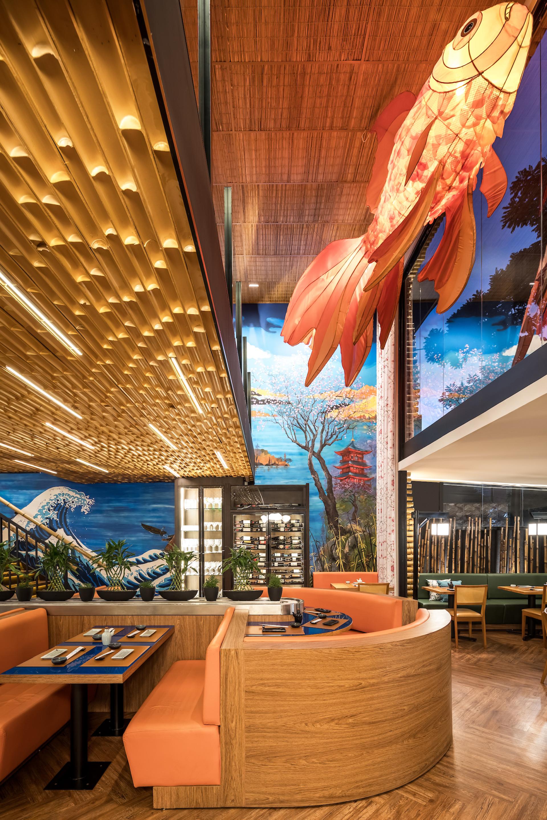 Mazu in Japanese means “first, before anything else”. The restaurant is an immersion in Japanese culture with traditional elements contemporarily applied to it. On Mazu’s ground floor there is an entrance hall, a front room, and a main room with a central conveyor belt (kaiten) that rotates and transports dishes allowing customers to pick them up at will. On the upper floor there is a mezzanine for events and private parties. Natural elements such as bamboo are one of the project protagonists. On the facade, bamboo is employed in circular shapes in different sizes creating a slight undulation. At the restaurant entrance, bamboo appears on the ceiling, wall and reception counter in linear black half-circle shapes. On the ceiling of the main room it emerges in linear inverted half-circle shapes, called “bamboo soul”, in a honey tone with built-in lighting. Furthermore, large bamboos have been used on the handrail of the staircase that leads to the mezzanine. The landscaping of the internal flower box has also been made of bamboo, in its natural form, with lighting coming from the ground. Welcoming our customers, the giant translucent four-meter-long orange fish is one of the restaurant highlights.”Floating” and lit from within it creates, alongside with a local artist hand-painted wall, an impression of waves originating in the Japanese seas. Luminaires reminiscent of Japanese lanterns were designed for the room. A custom fan-shaped coating has been installed at the sushi bar. The cocktail bar also features gradients with glass tiles in shades of blue. The furniture exclusively designed for the restaurant is made of solid wood, fabrics and blue glass. Curtains textured with pink cherry trees fall from the double-height ceiling. Additionally, a Japanese paper pendant illuminates the arrival of customers in the entrance hall. Another mezzanine highlight is a large backlit fabric panel with an image of a geisha. On the upper floor we can, through a glass skin, contemplate the external landscaping which brings Japanese natural elements such as the cherry tree, an illuminated bamboo among other plants.