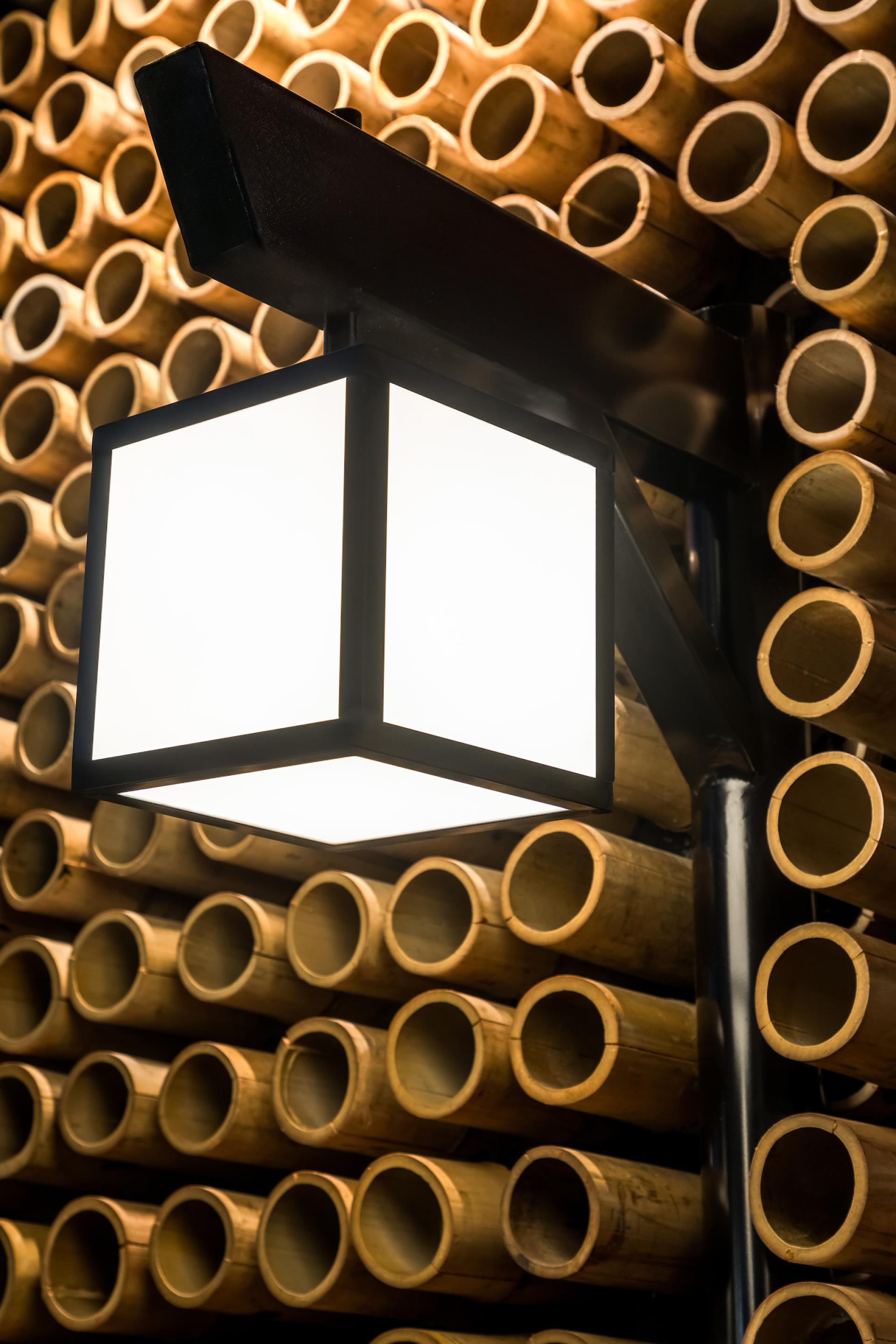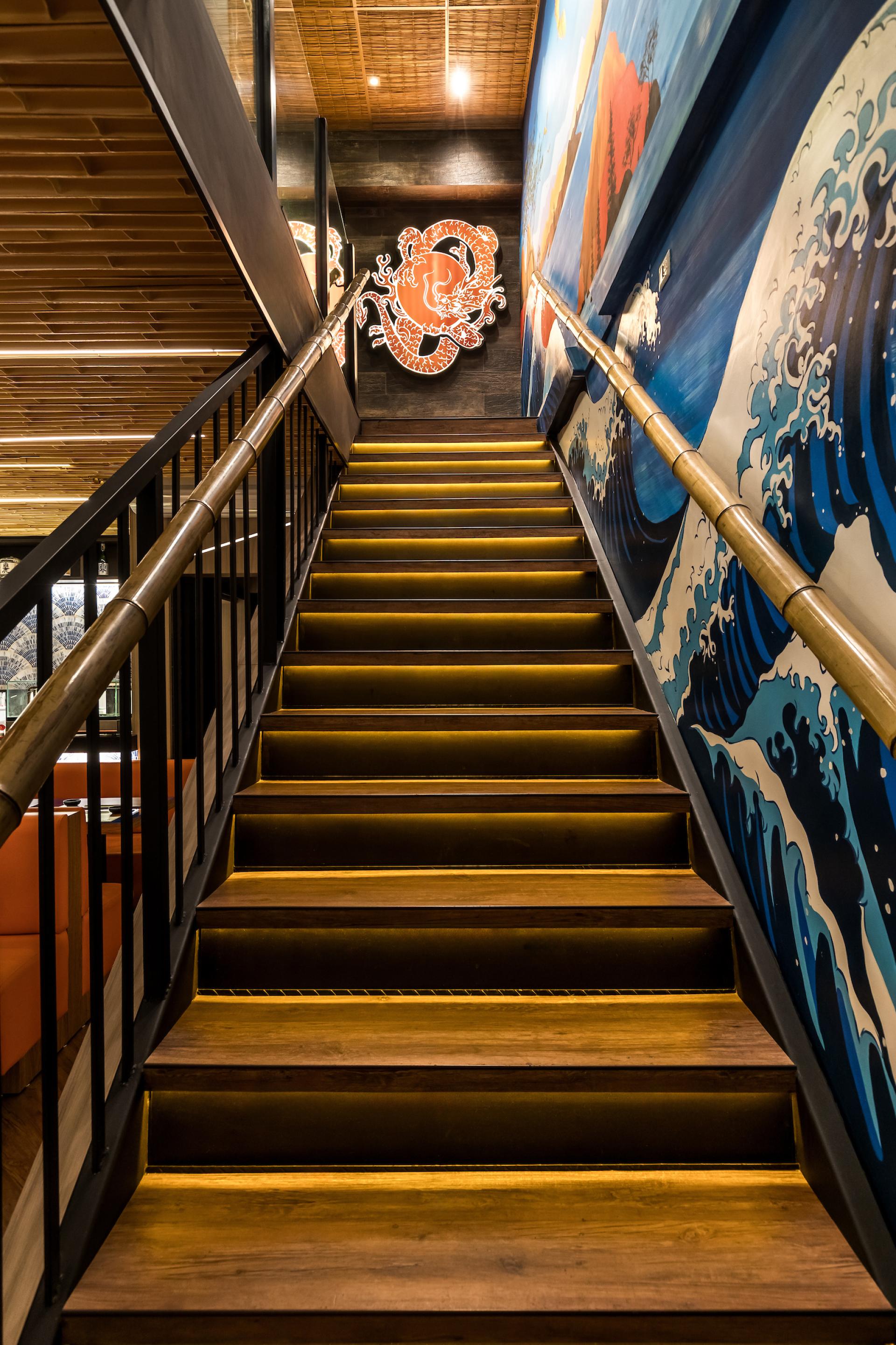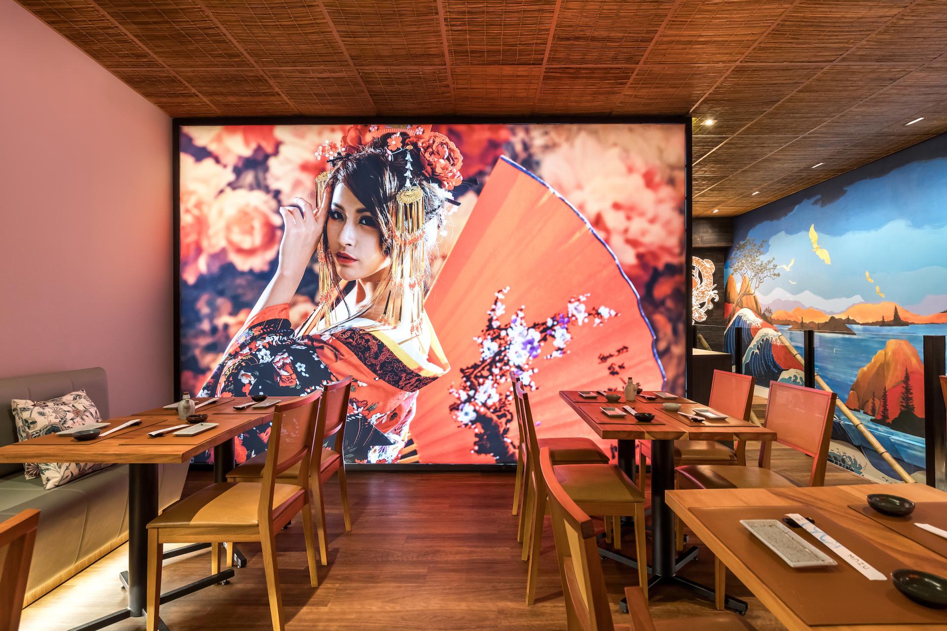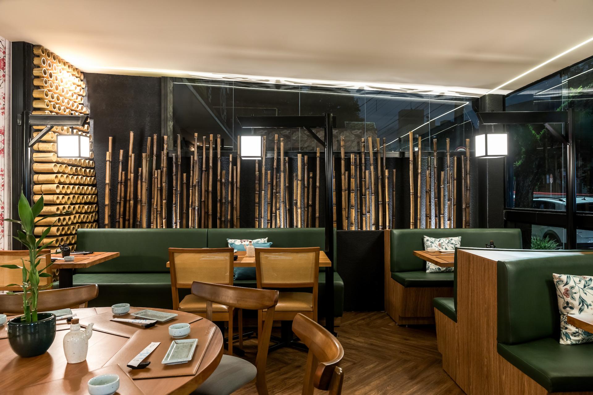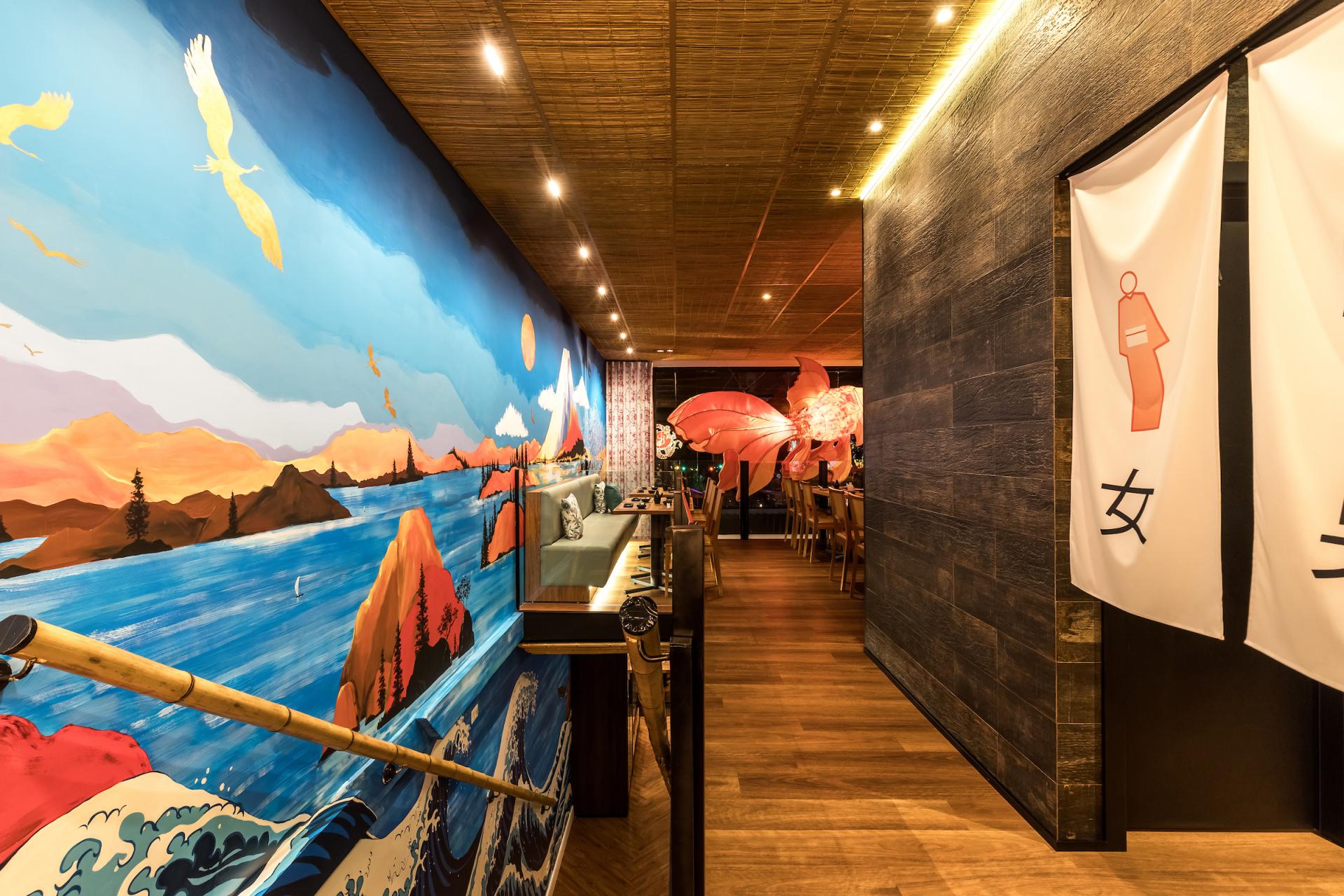 Mazu in Japanese means “first, before anything else”. The restaurant is an immersion in Japanese culture with traditional elements contemporarily applied to it. On Mazu’s ground floor there is an entrance hall, a front room, and a main room with a central conveyor belt (kaiten) that rotates and transports dishes allowing customers to pick them up at will. On the upper floor there is a mezzanine for events and private parties. Natural elements such as bamboo are one of the project protagonists. On the facade, bamboo is employed in circular shapes in different sizes creating a slight undulation. At the restaurant entrance, bamboo appears on the ceiling, wall and reception counter in linear black half-circle shapes. On the ceiling of the main room it emerges in linear inverted half-circle shapes, called “bamboo soul”, in a honey tone with built-in lighting. Furthermore, large bamboos have been used on the handrail of the staircase that leads to the mezzanine. The landscaping of the internal flower box has also been made of bamboo, in its natural form, with lighting coming from the ground. Welcoming our customers, the giant translucent four-meter-long orange fish is one of the restaurant highlights.”Floating” and lit from within it creates, alongside with a local artist hand-painted wall, an impression of waves originating in the Japanese seas. Luminaires reminiscent of Japanese lanterns were designed for the room. A custom fan-shaped coating has been installed at the sushi bar. The cocktail bar also features gradients with glass tiles in shades of blue. The furniture exclusively designed for the restaurant is made of solid wood, fabrics and blue glass. Curtains textured with pink cherry trees fall from the double-height ceiling. Additionally, a Japanese paper pendant illuminates the arrival of customers in the entrance hall. Another mezzanine highlight is a large backlit fabric panel with an image of a geisha. On the upper floor we can, through a glass skin, contemplate the external landscaping which brings Japanese natural elements such as the cherry tree, an illuminated bamboo among other plants.