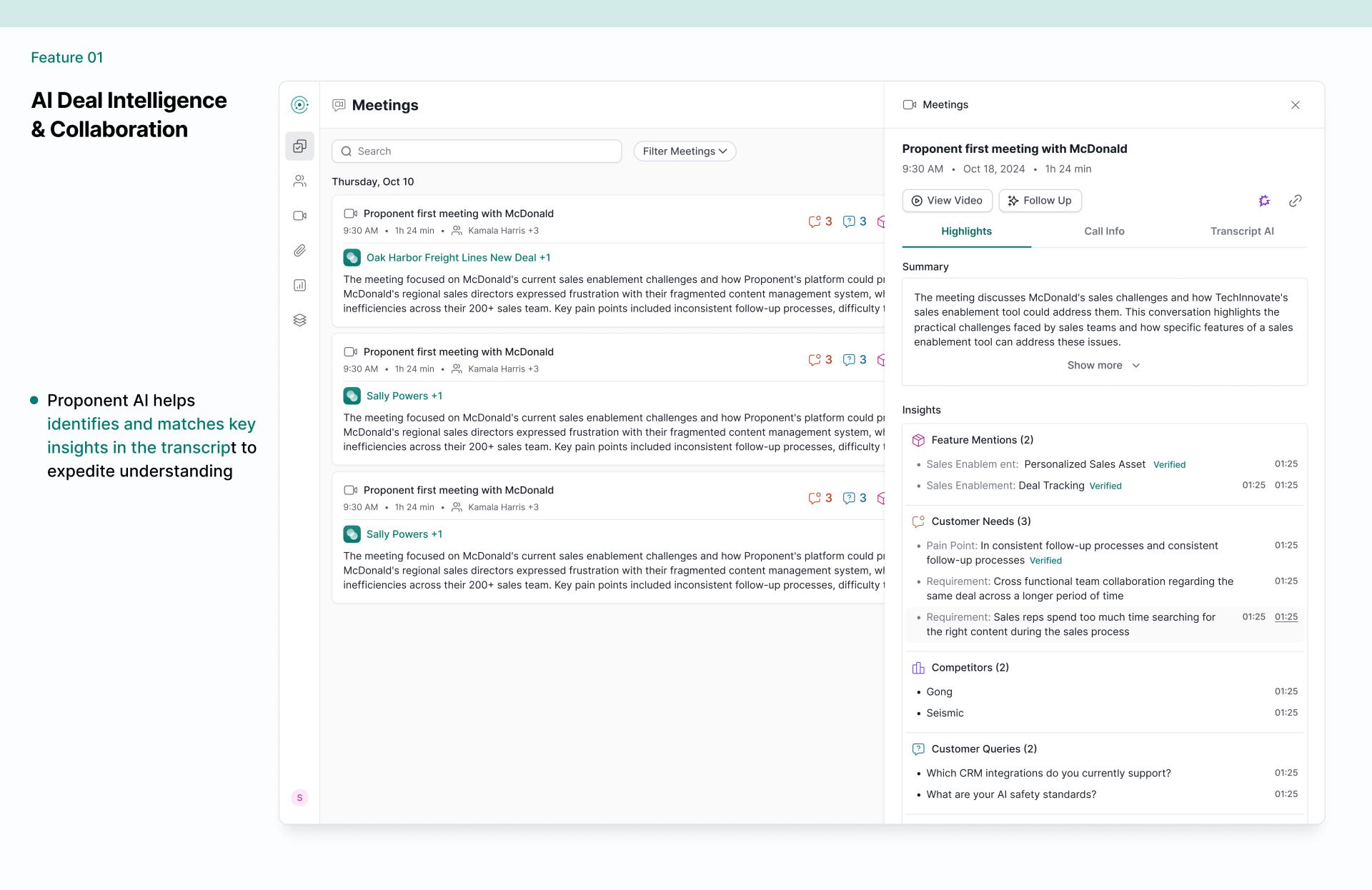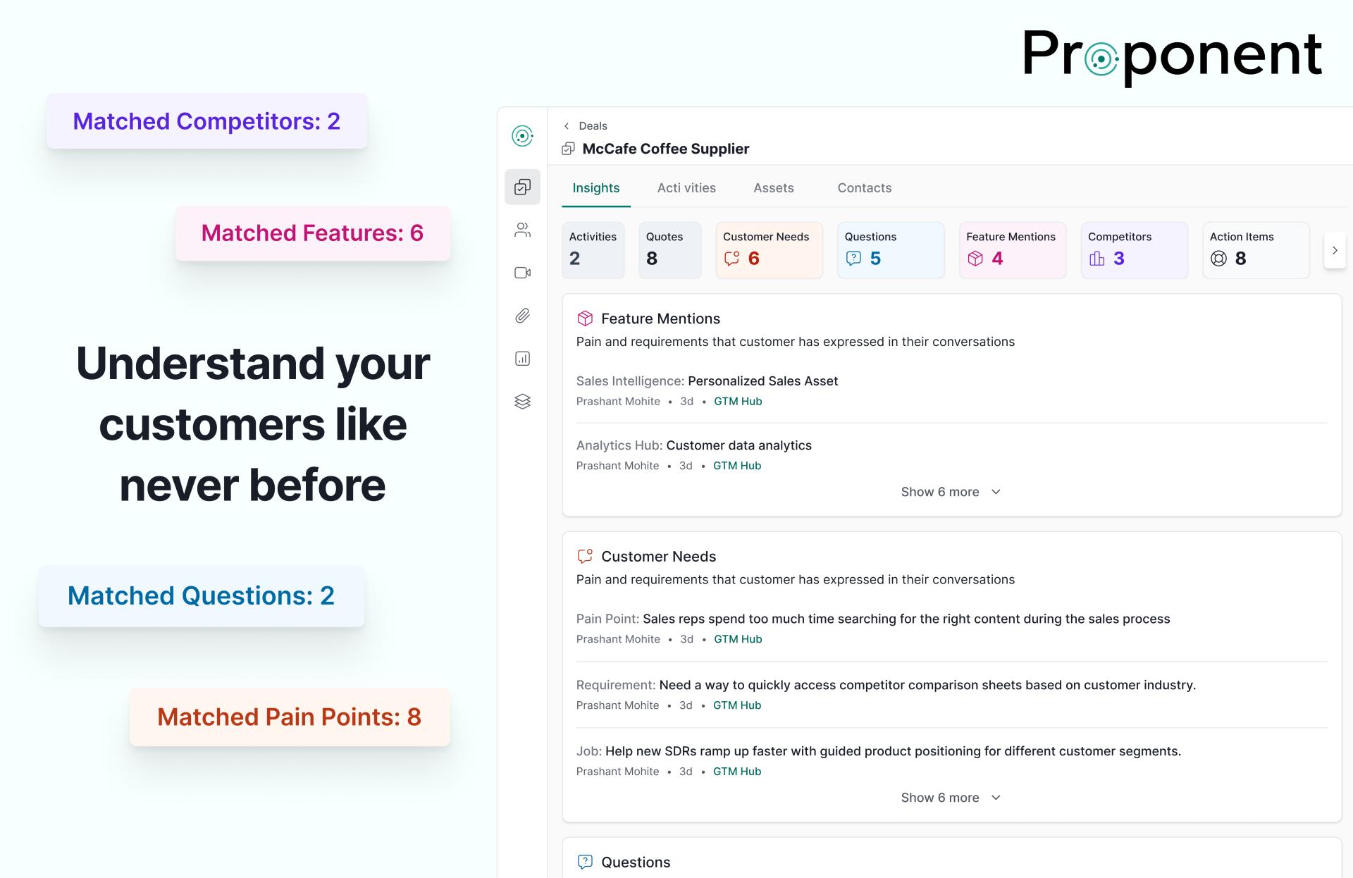 Proponent transforms this landscape through a closed-loop intelligence system that captures, analyzes, and operationalizes customer conversations. Our platform creates an institutional memory that preserves valuable context and delivers actionable intelligence to multiple stakeholders.