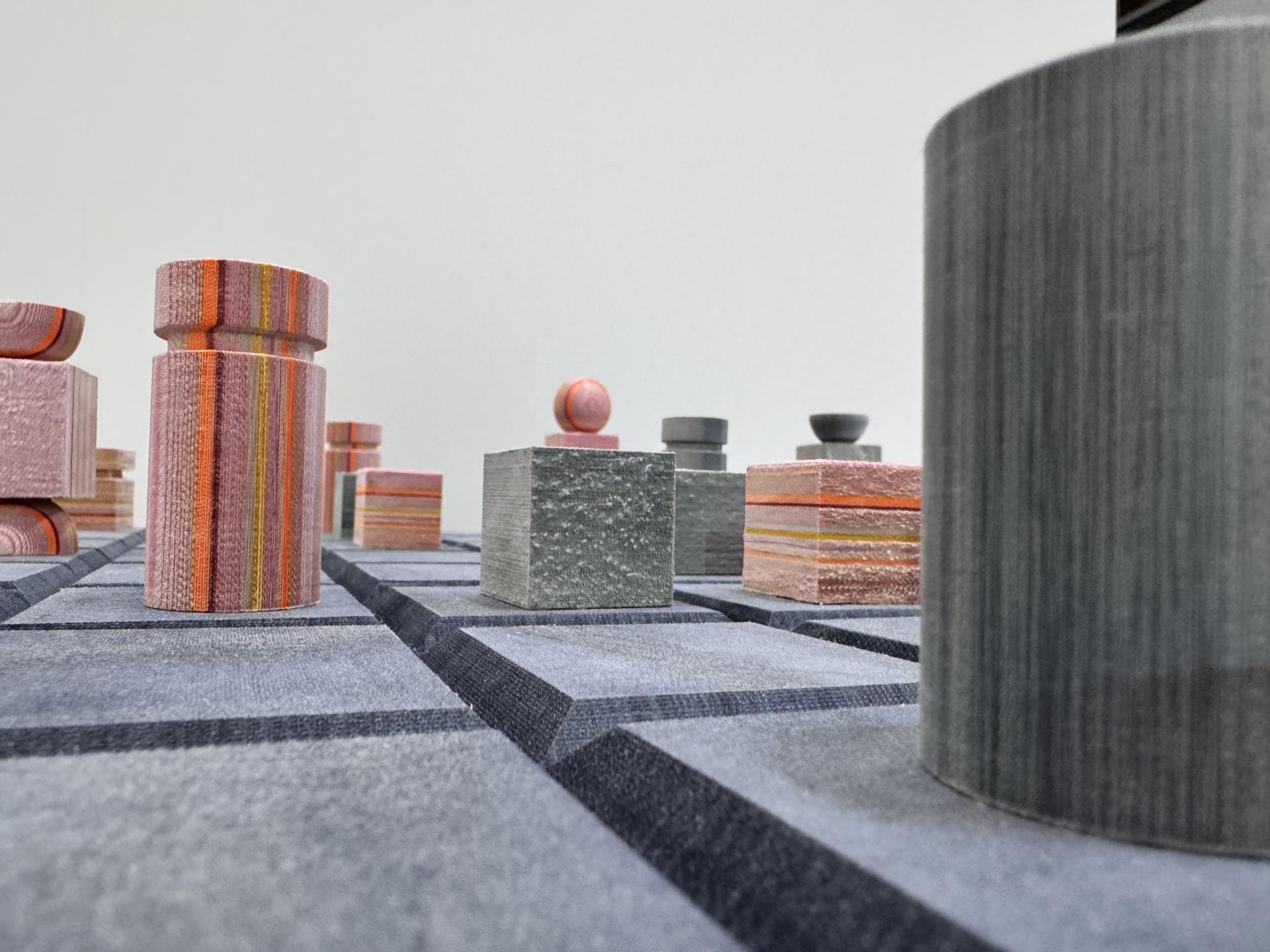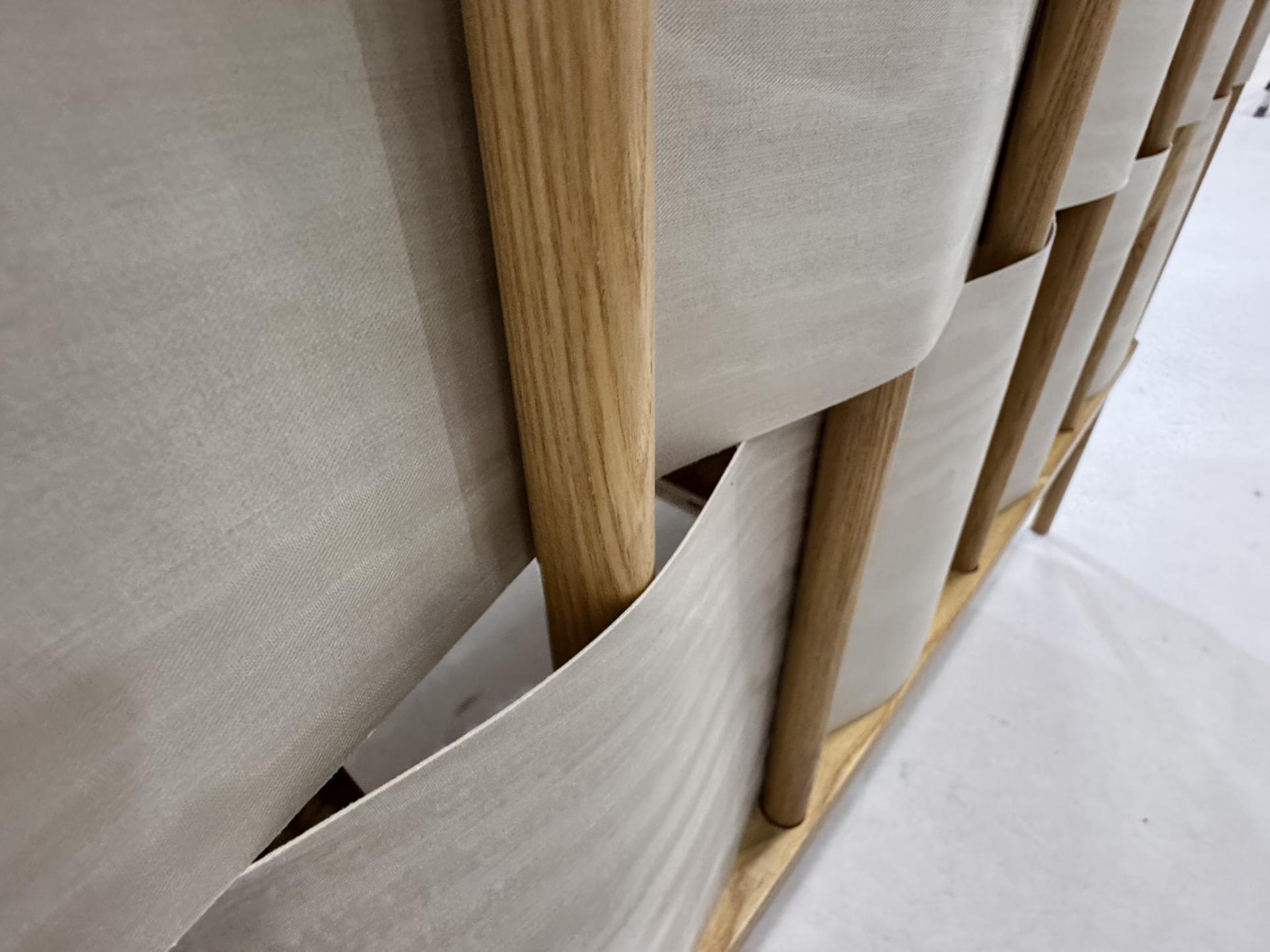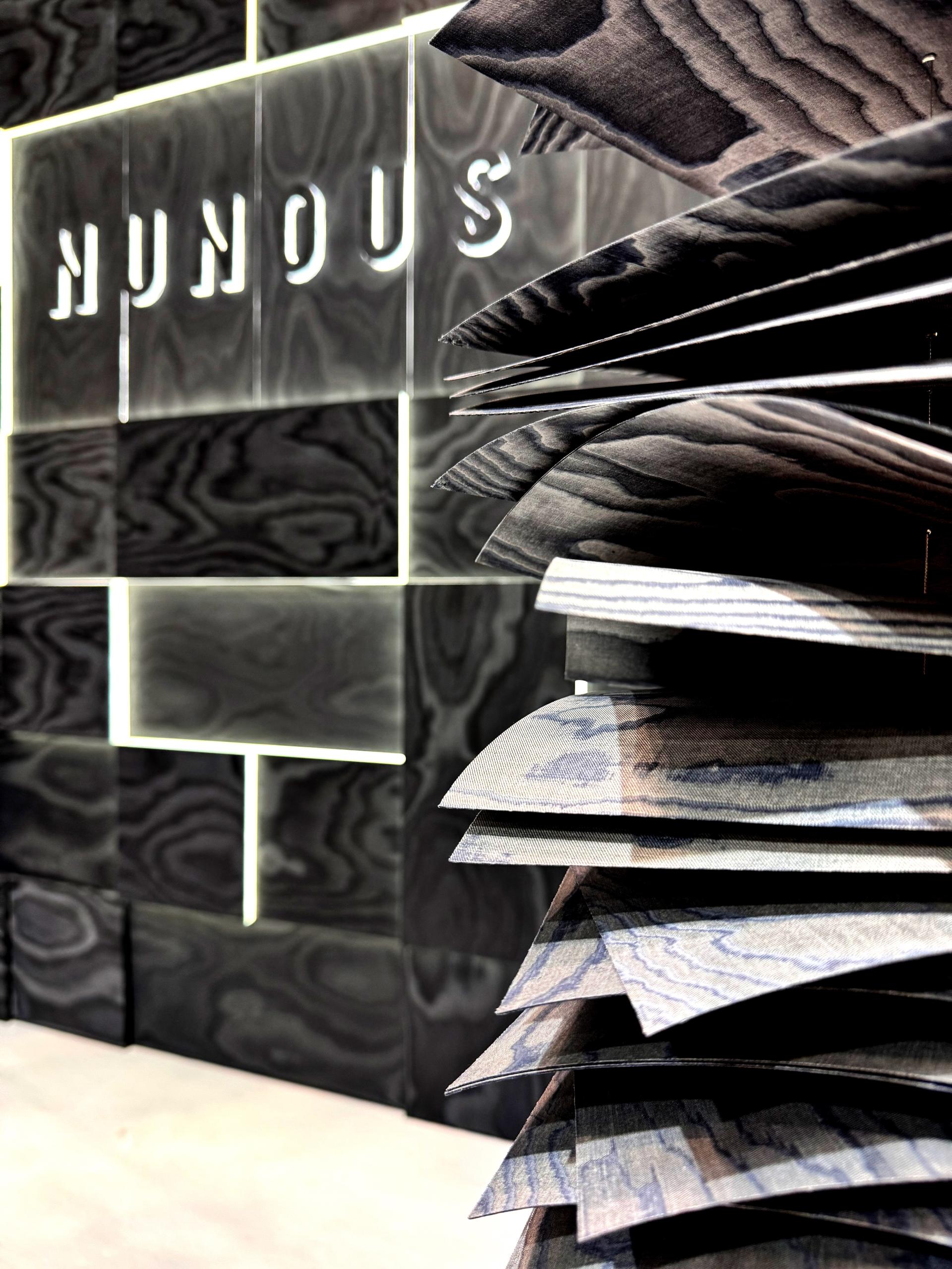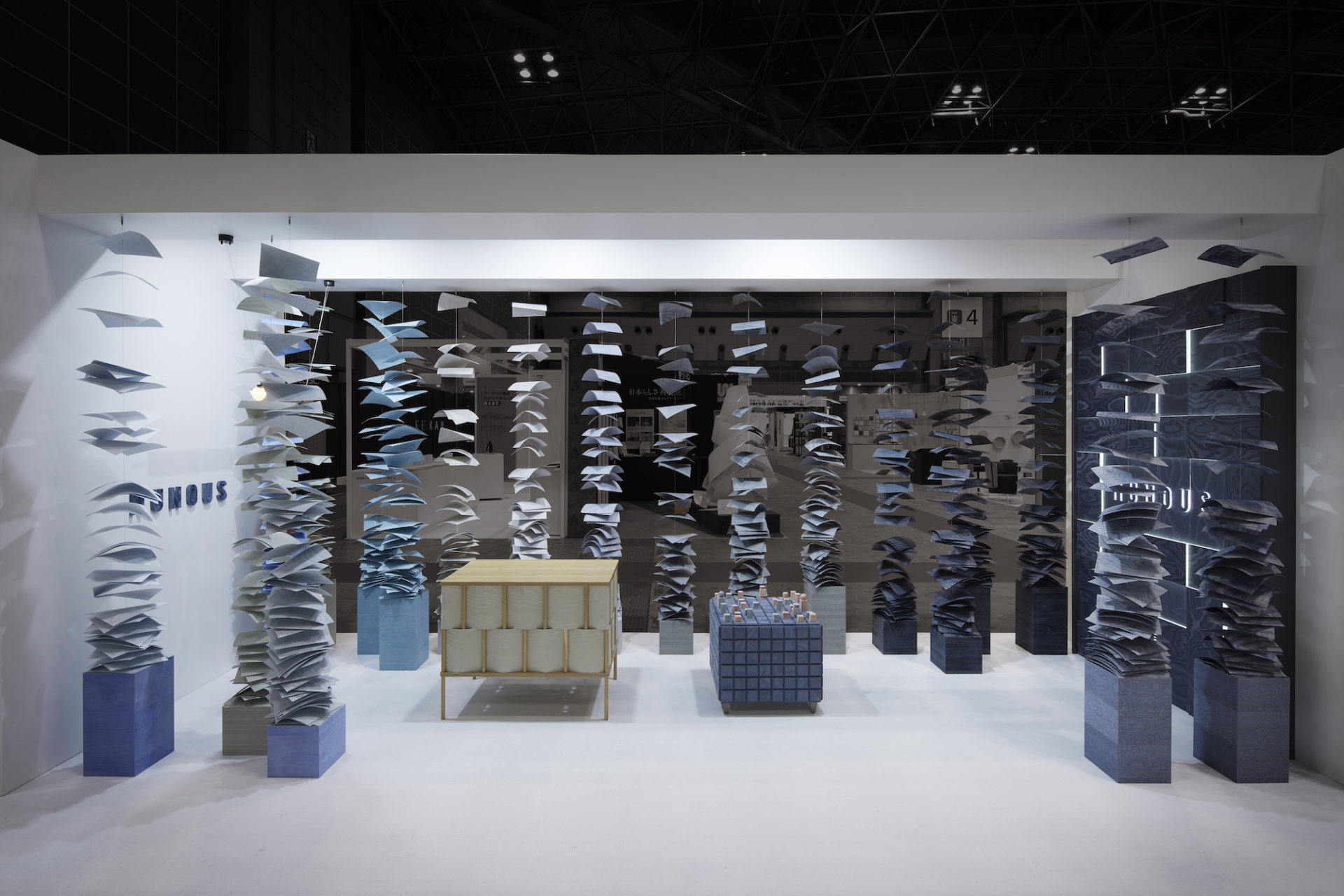 NUNOUS is a completely new upcycled material derived from cloth. By making possible an upcycling method that does not damage the color or texture of the cloth, NUNOUS is a product that “makes beautifully visible” the "large amount of invisible waste. Plant-derived resin is inserted between hundreds of pieces of cut waste cloth, pressed, and re-sliced. The exhibition is a straightforward representation of its origins.
