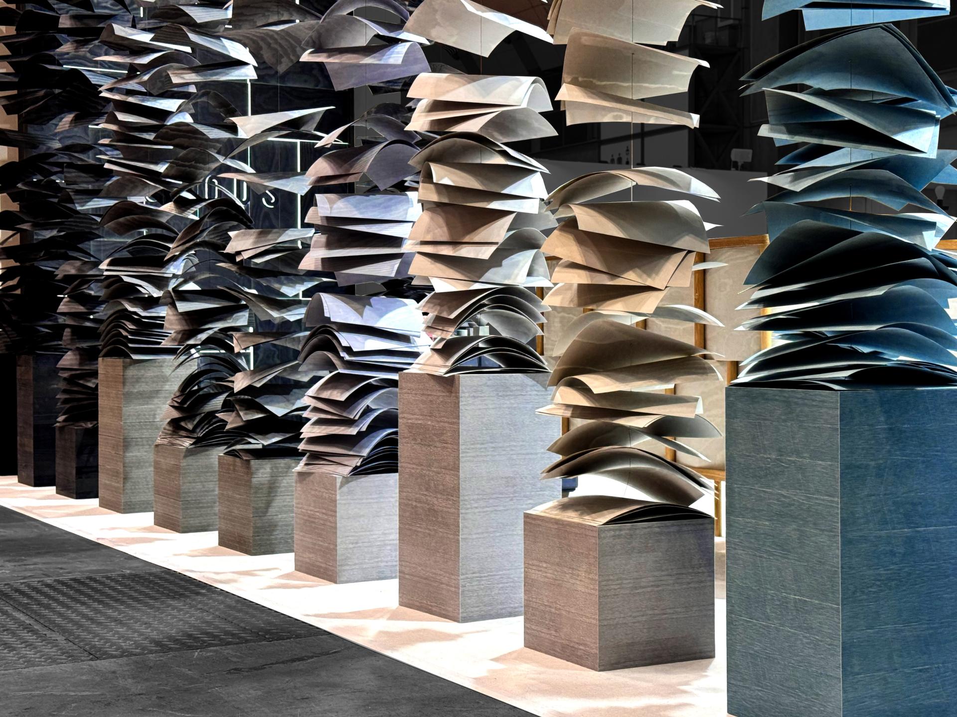 Just like carving veneer from a log, I wanted to express the lightness of something sliced from a pile of piled up pieces in a simple way.