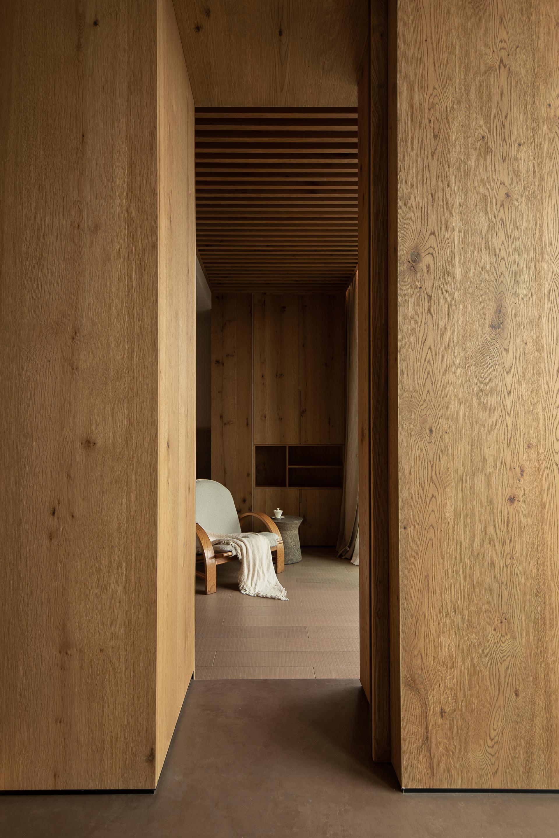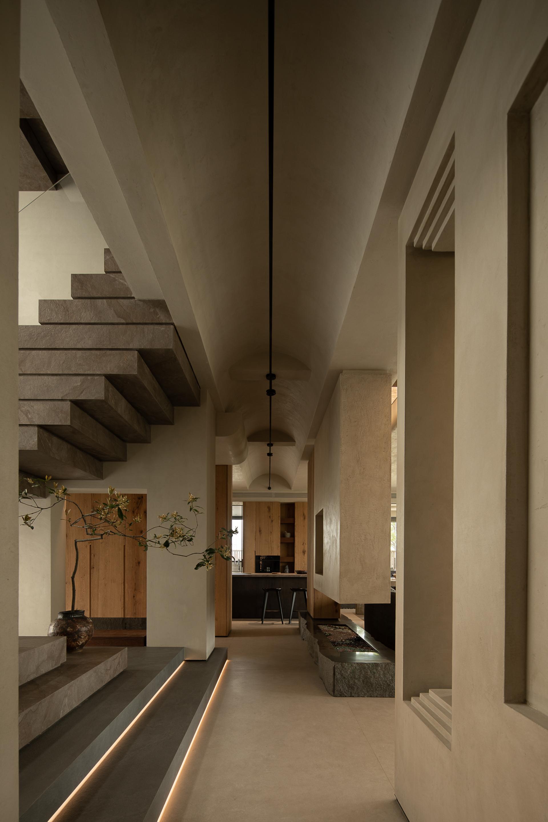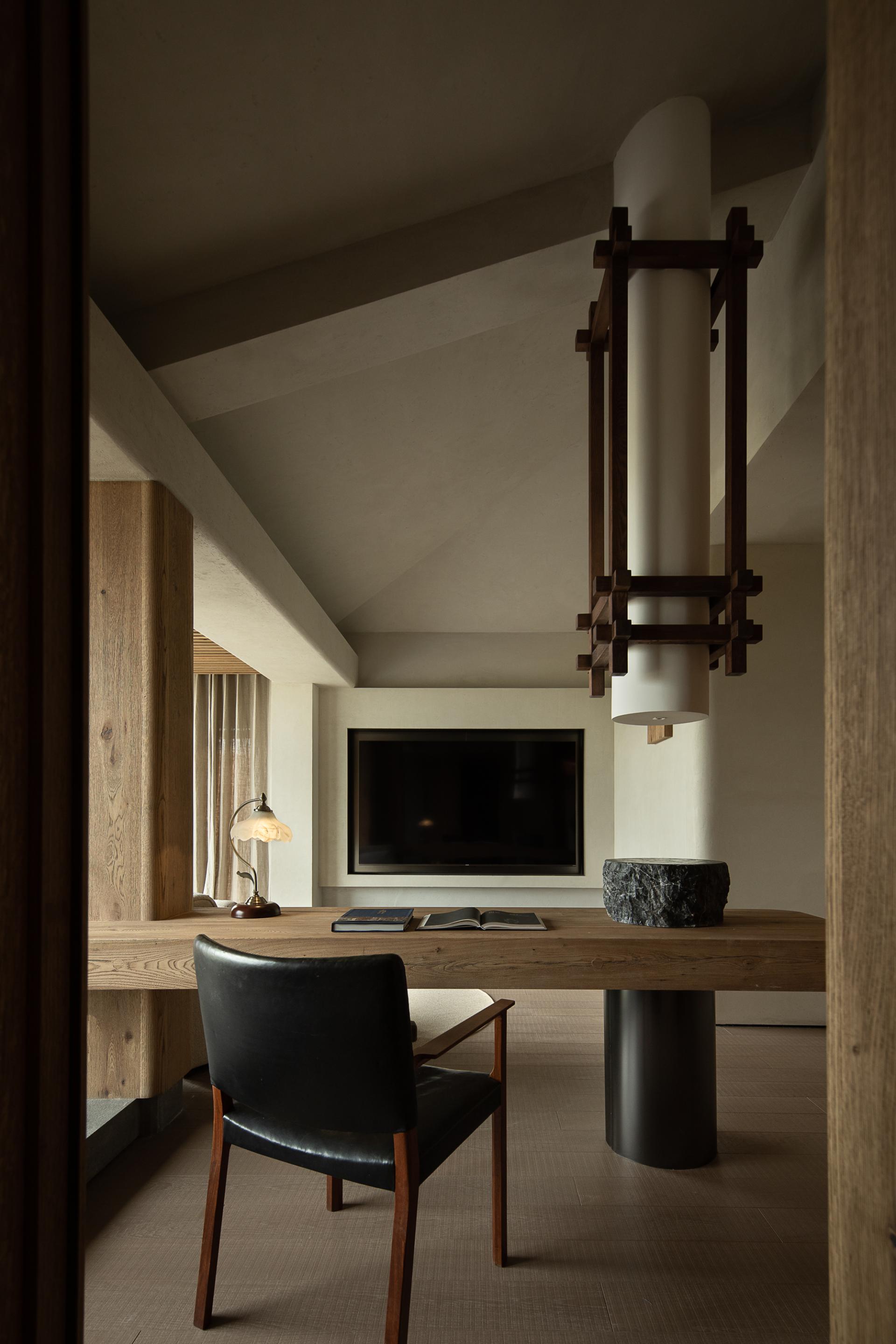 The designer said, "I have worked on so many projects, and I have never been so moved by the joy of the homeowners after any of them landed This joy does not come from the designer's "sense of completion", but from the homeowner's "sense of use" of the space - she began to slowly read this home, seeing it as an extension of her body, a rhythm of daily life, and living with it as a natural state. The first floor is an open horizontal living area, with no boundaries between the tea room, restaurant, and reception area. A room without functional segmentation, without a "background wall" pointing, only a freely arranged and flowing flow. Life is not arranged, but rather stretched out in harmony. Whether a space is upscale or not is never judged by whether the materials are expensive or the furniture is neat, but by whether the homeowner is willing to stay and open their heart to coexist with the space. And she, willing. Not only was she willing, but she also entrusted her emotions, stories, memories, and even silence to this space. She is not 'using' it, but 'conversing' it. And this space did not disappoint her either. The room on the third floor has no ceiling and retains the original roof structure. Although the space is small, it has the widest view and is her favorite place to be alone. She said that the wind is very light, but it can also soften people's hearts. The wooden floor is made of teak wood, which has not been decorated with any cuts or patterns; Anti corrosion wood is burnt black, stable and heavy; The wall is coated with artistic paint, without patterns or color jumps - simple and heavy, this is the bone of space. And the stone stools, wooden coffee tables, and small items she collects are dynamic and breathing. The end of design is not the work, but whether the person who truly lives in it, from morning till night, always coexists with the space in a comfortable, peaceful, and relaxed manner.