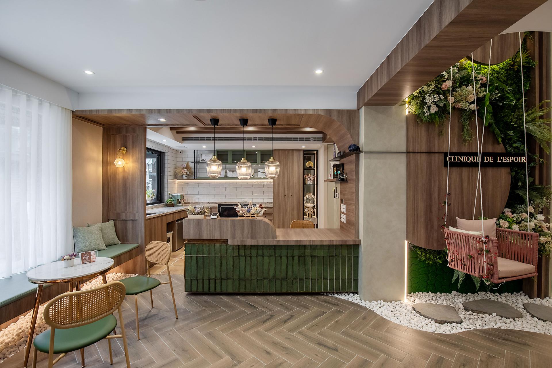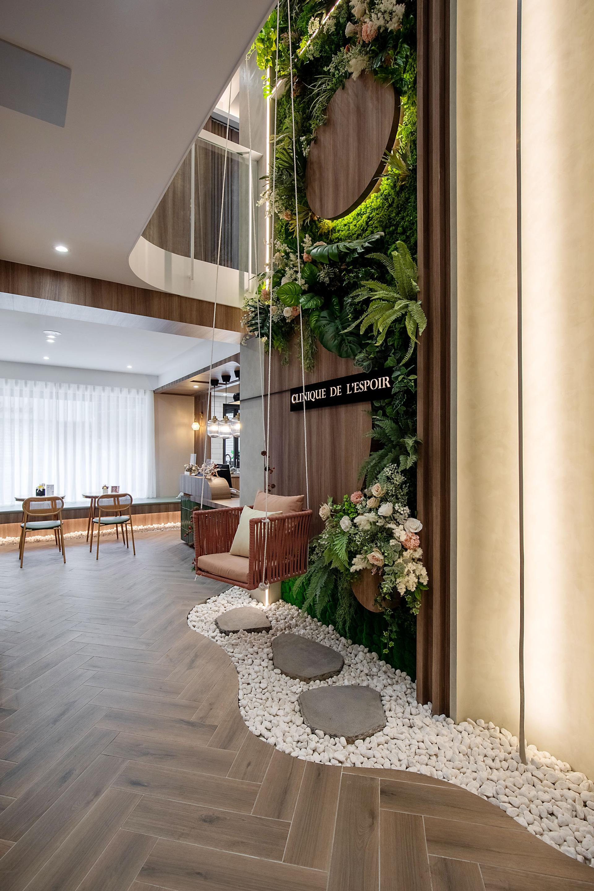 The Healing Oasis is a holistic reimagining of the Aesthete Medical Clinic, transforming a dated, two-building structure into a serene and rejuvenating sanctuary that prioritizes patient well-being and biophilic design principles. The design challenges the conventional sterility of medical spaces, embracing natural light, organic materials, and flowing curves to create a calming environment that fosters relaxation and healing. This project demonstrates how thoughtful design can elevate the patient experience, seamlessly blending functionality with a tranquil atmosphere that alleviates anxiety and promotes a sense of peace. Design Solution: Central to the design is a dramatic, double-height atrium punctuated by a repurposed existing staircase, transforming it into a sculptural centerpiece. This architectural intervention not only preserves the building's original character but also allows natural light to flood the interiors, nourishing a curated selection of lush greenery that winds its way through the clinic. The central staircase acts as a vertical axis around which the entire space revolves, guiding patients on a journey through a verdant landscape that connects all three levels. This cyclical flow, reminiscent of a department store layout, encourages exploration and discovery while maximizing visual connections to the central green core. The first and second floors evoke the warmth and intimacy of a café, incorporating herringbone wood flooring, retro-inspired counters crafted from imported tiles, and comfortable seating areas bathed in natural light filtered through gauzy curtains. The deliberate use of warm, earthy tones and natural textures, such as wood and stone, further reinforces the connection to nature. This biophilic approach extends to the lighting design, which prioritizes natural light and incorporates soft, diffused artificial lighting to mimic the gentle transitions of sunlight throughout the day. In contrast, the third floor, housing staff offices and a break room, adopts a more industrial aesthetic, reflecting the client's personal preference and overseas experience. This stylistic shift is intentional, providing a distinct separation between public and private spaces while maintaining a cohesive design language through the consistent use of natural materials and the continuation of the central atrium's visual influence.