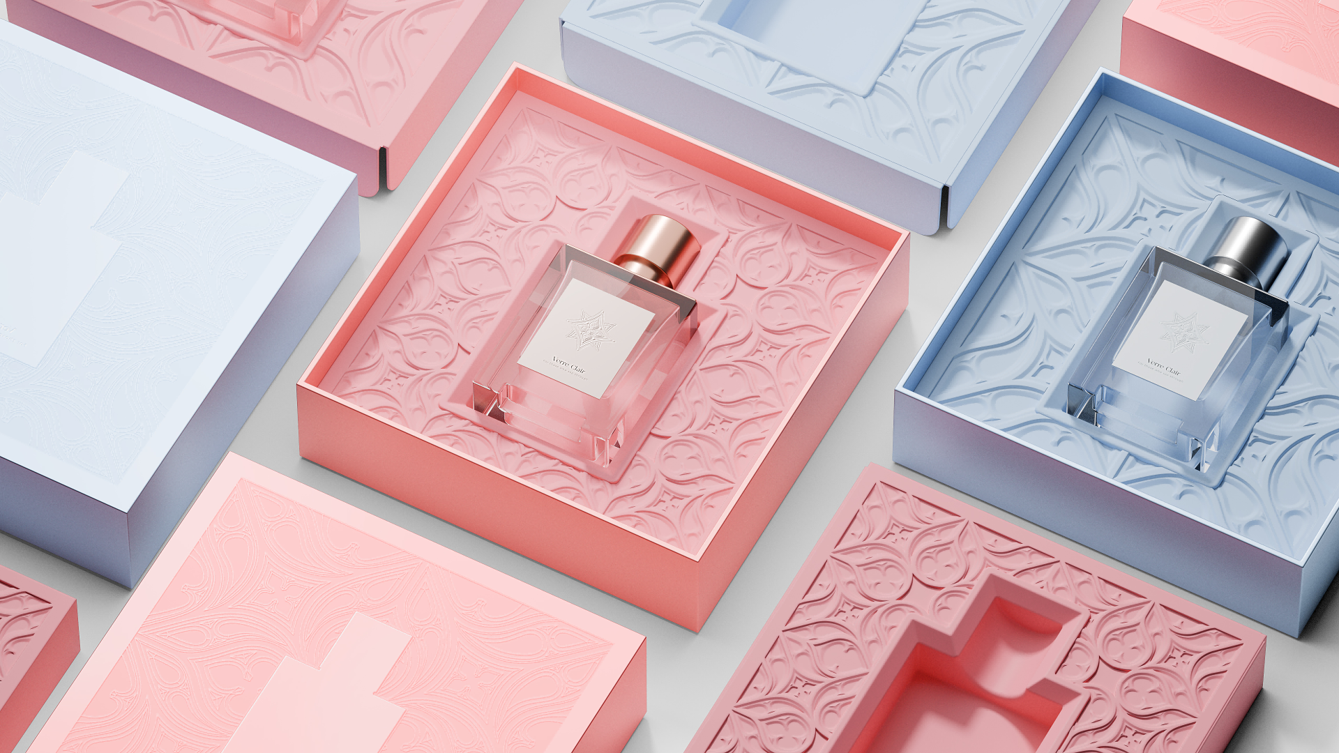 This perfume packaging design cleverly integrates environmental concepts with elegant artistic styles. Inspired by "Verre Clair" (clear glass), it uses eco-friendly paper-plastic inner trays to effectively reduce plastic usage, conveying the brand's strong sense of responsibility for sustainable development. The exterior design features minimalist European-style window grilles, with delicate embossing craftsmanship adding three-dimensionality and depth to the packaging, showcasing a noble and elegant temperament that makes every detail exude a sense of refinement and artistry.