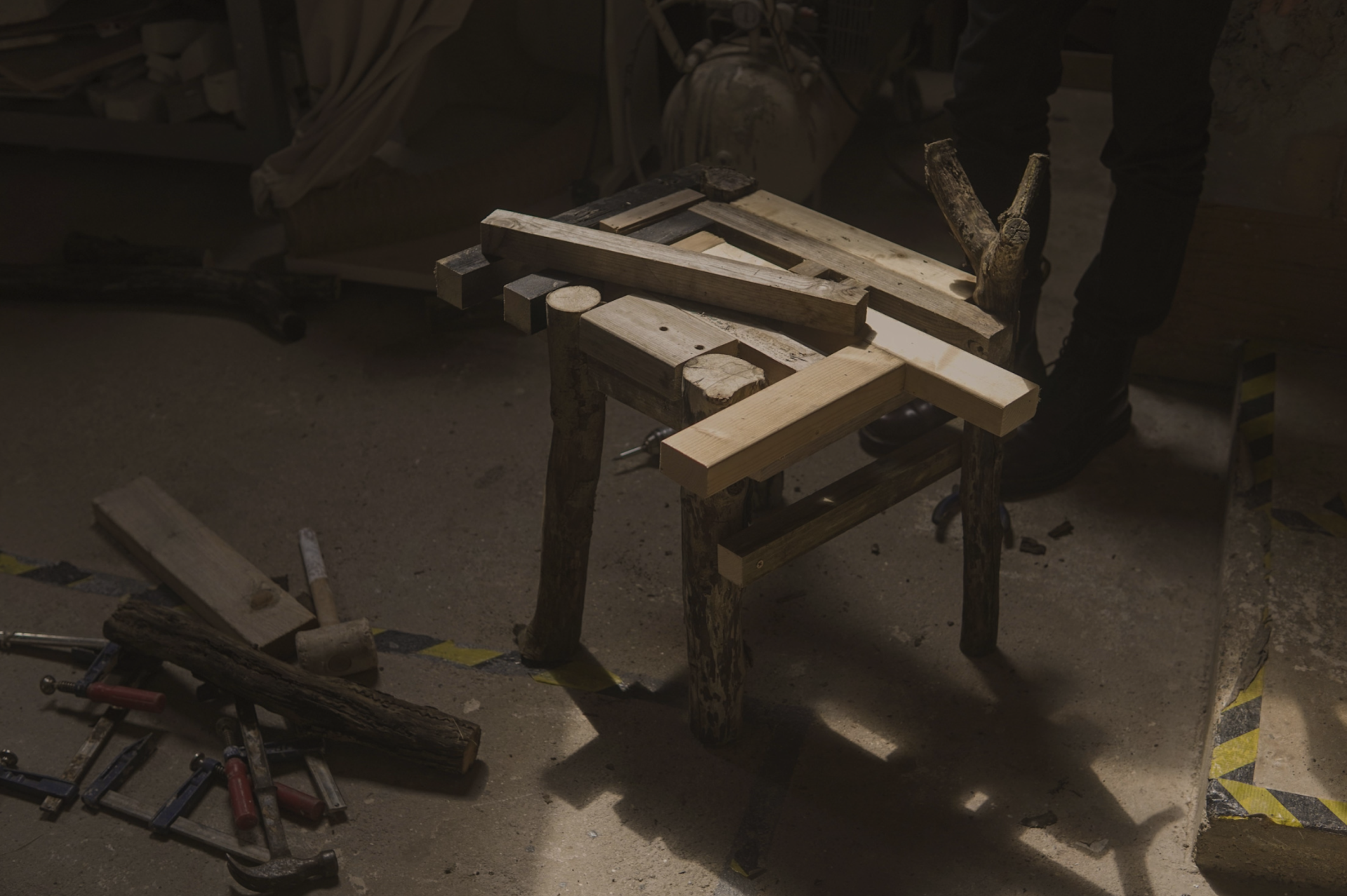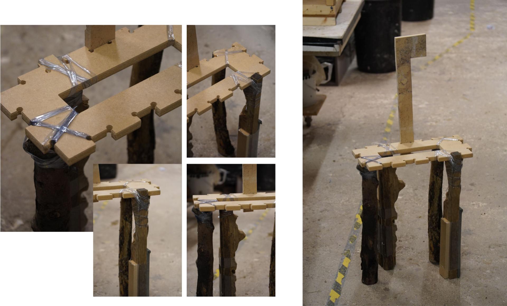 Off-cut wood is first categorised by sectional dimensions and modularised into standardised lengths. These are digitally transformed into voxel sets and aggregated using the Wave Function Collapse (WFC) algorithm—a constraint-based programming method for solving 3D combinatorial problems. Voxels are arranged by design typology, and design parameters are used to control their spatial configurations. The resulting formations are joined with folded metal connectors, allowing flexible assembly and reconfiguration.