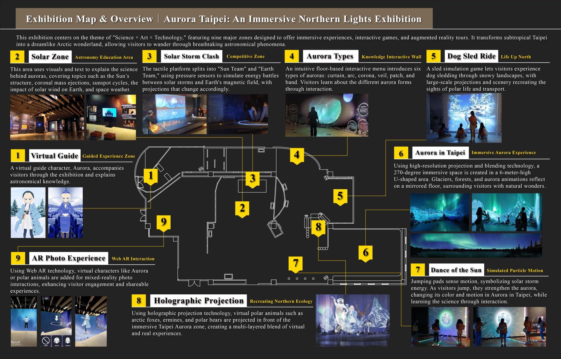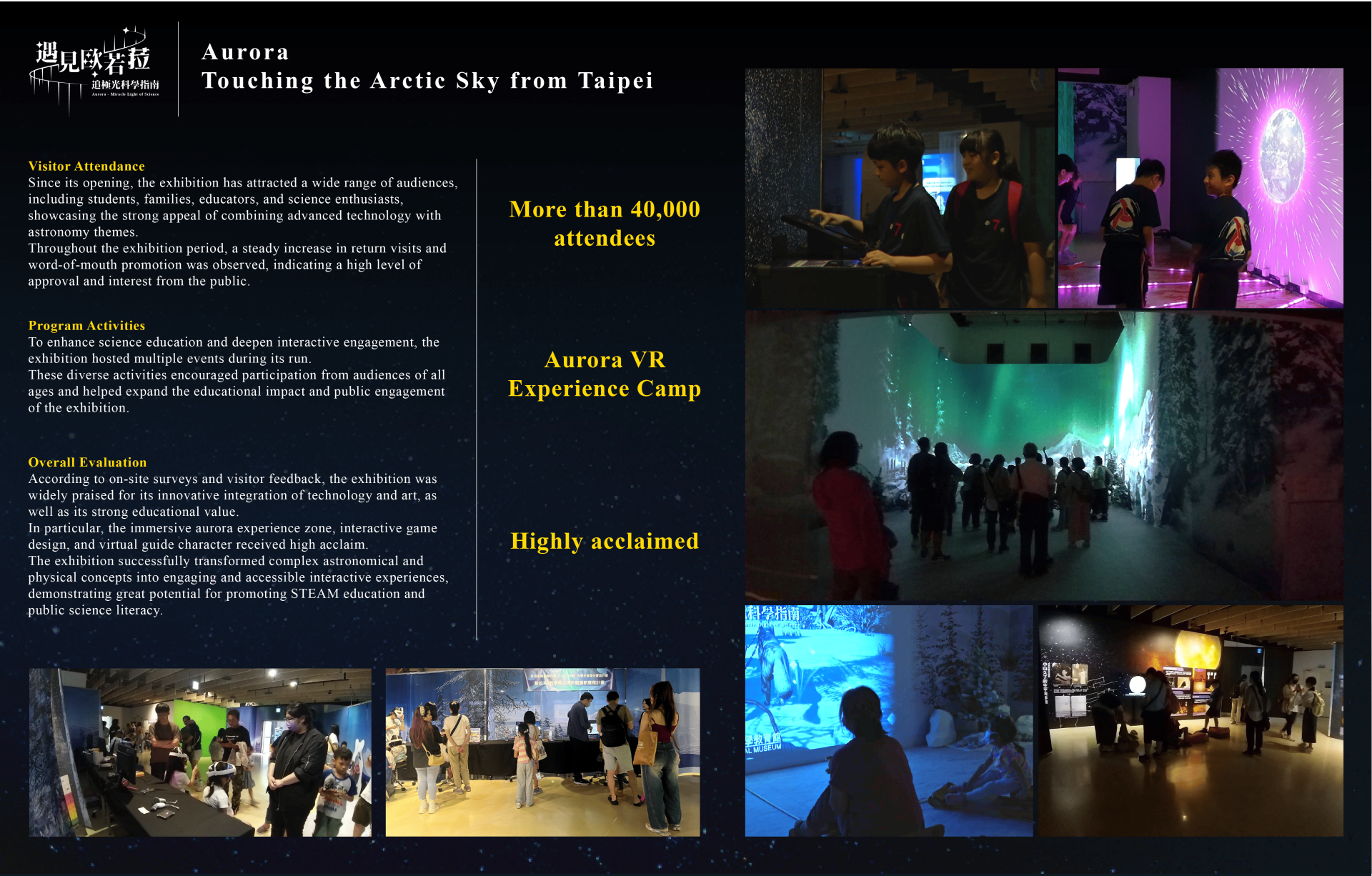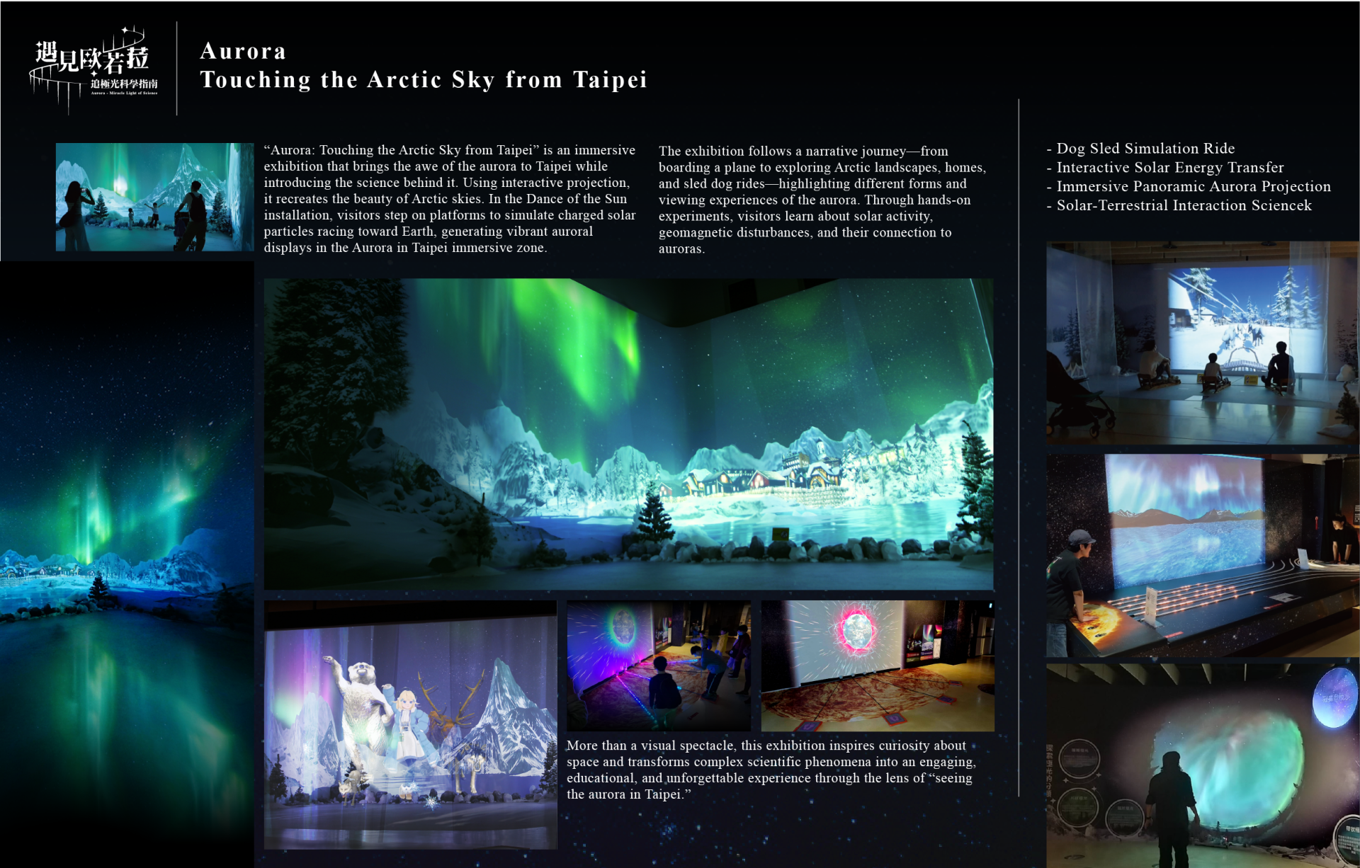 Aurora: “Capturing the Aurora in Taipei” is an immersive exhibition that brings the awe-inspiring spectacle of the aurora to the heart of Taipei, seamlessly blending breathtaking visuals with scientific discovery. Through advanced interactive projection technology, the exhibition vividly recreates the vibrant colors of the Arctic sky, offering visitors an authentic journey into the world of auroral phenomena.
