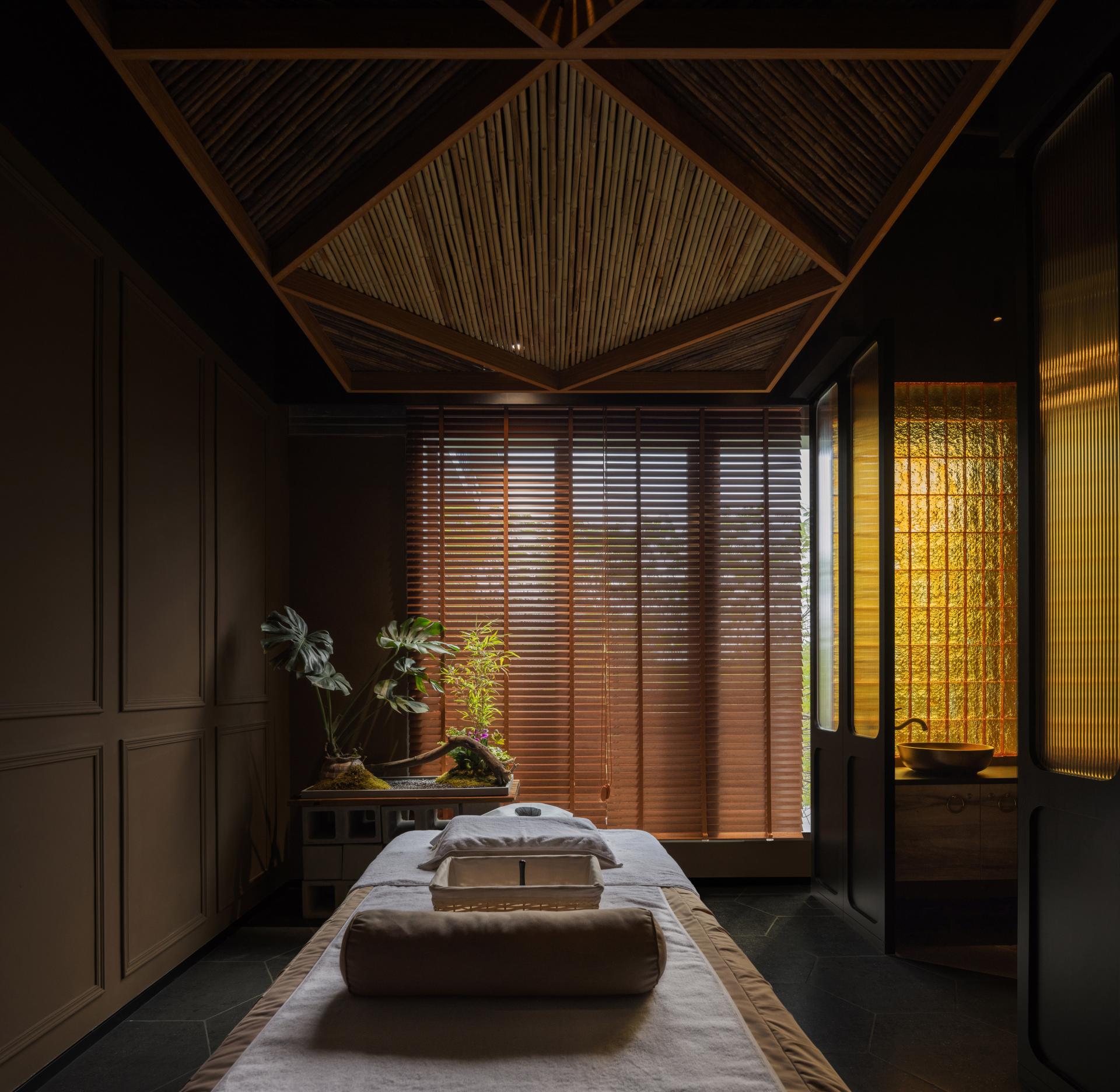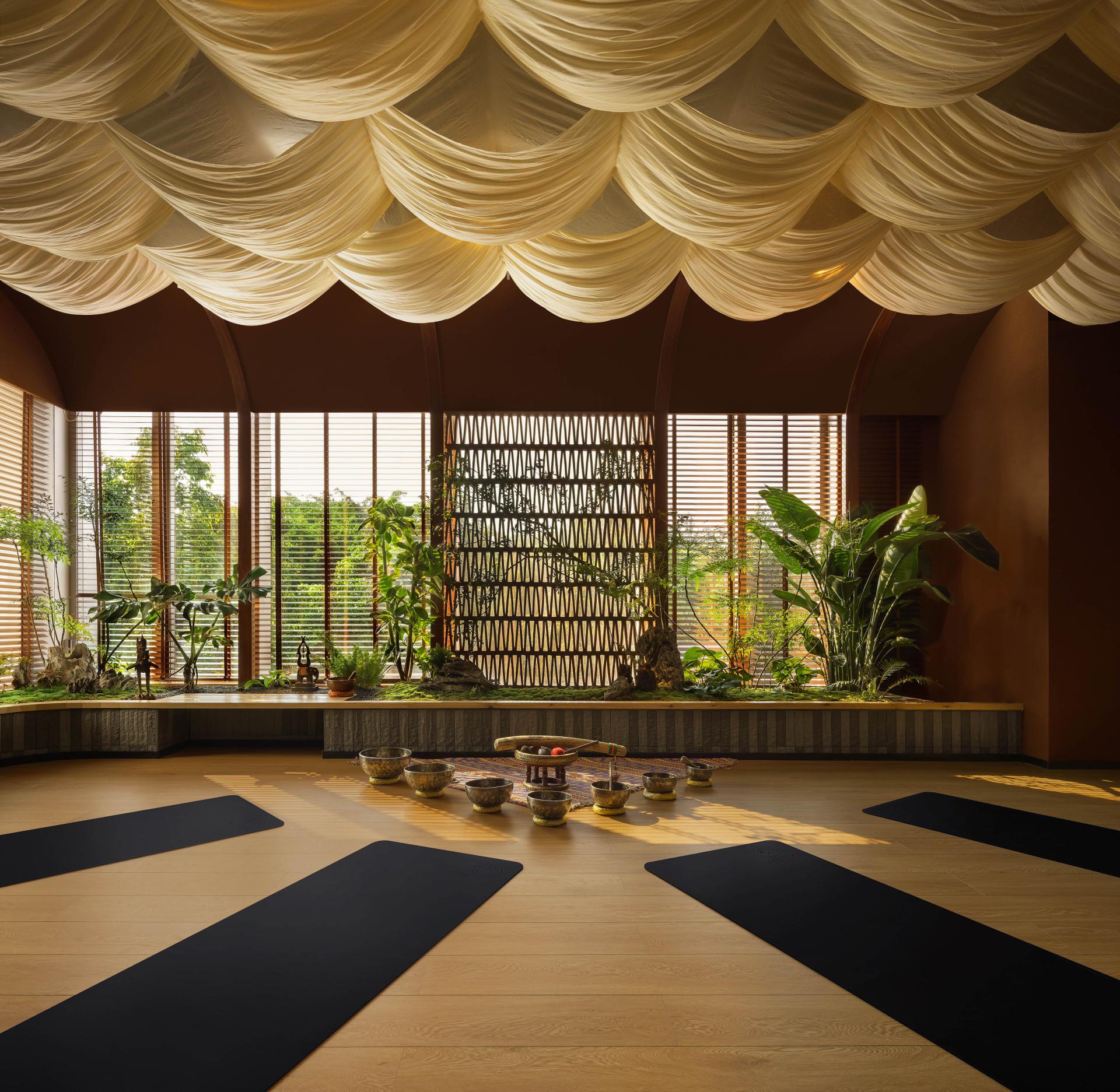 The yoga and meditation room continues this narrative. Billowing ceiling drapes suggest clouds, while lush plants blur the line between indoors and out, forming a serene cocoon for stillness and mindful practice. Private treatment rooms extend this intimacy, with layered textures and subdued lighting ensuring complete physical and mental release. Even the corridors are thoughtfully crafted as calming transitions, preparing the senses for healing.