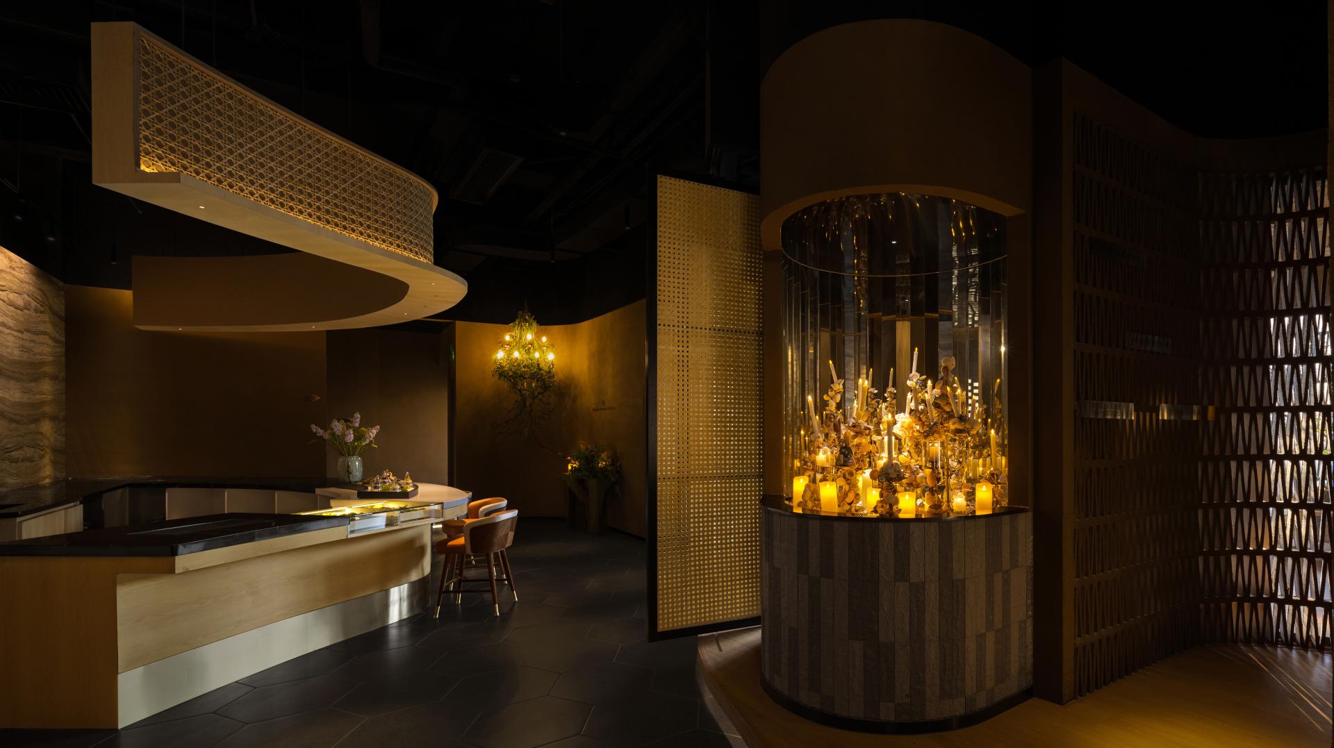 From the moment guests enter, they’re drawn into a sensory journey. The reception features mirrored reflections, a jade counter inlaid with natural elements, and sculptural displays of shells and candles—an overture to tranquility. Light filters through wooden louvers, casting shifting patterns that invite contemplation.