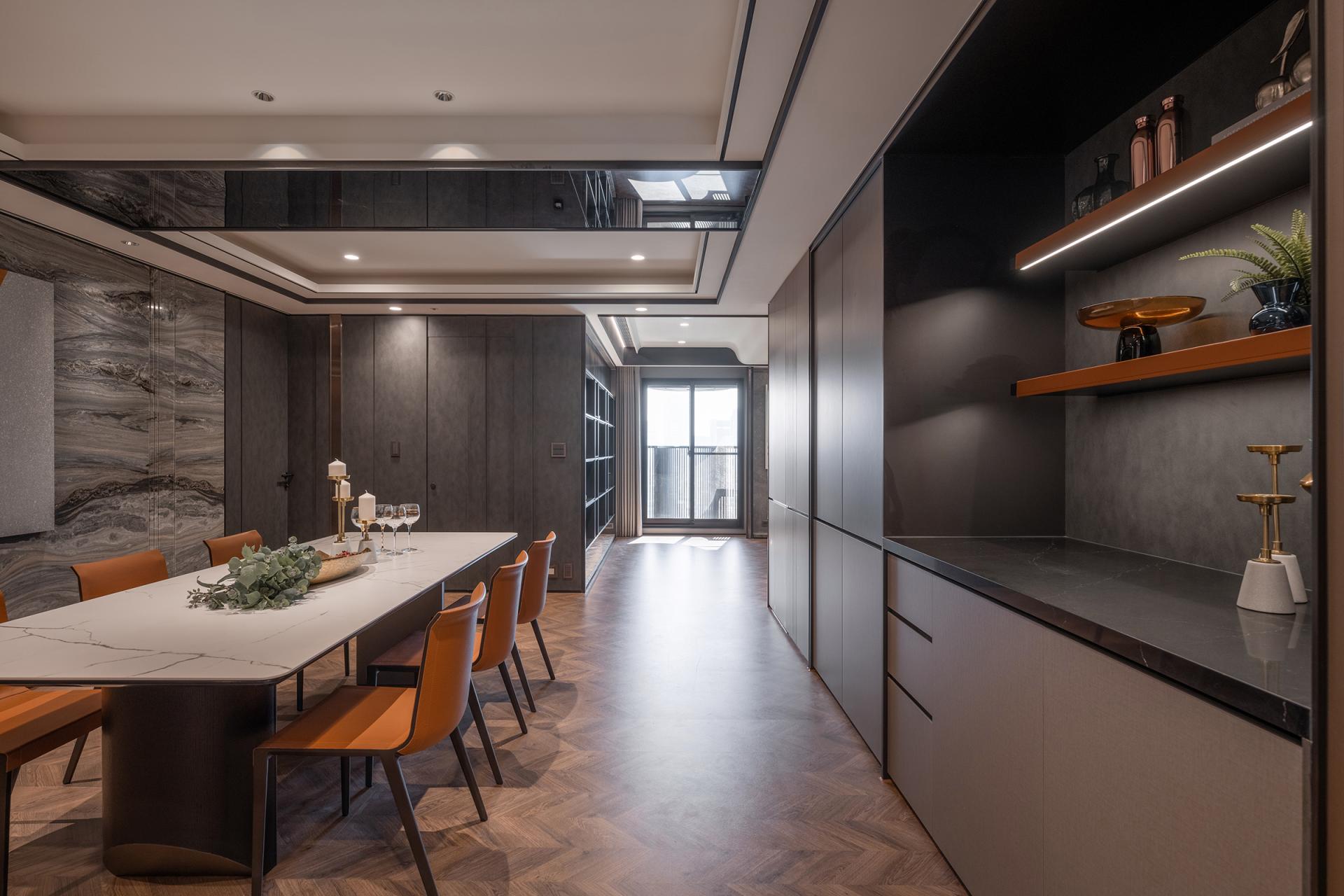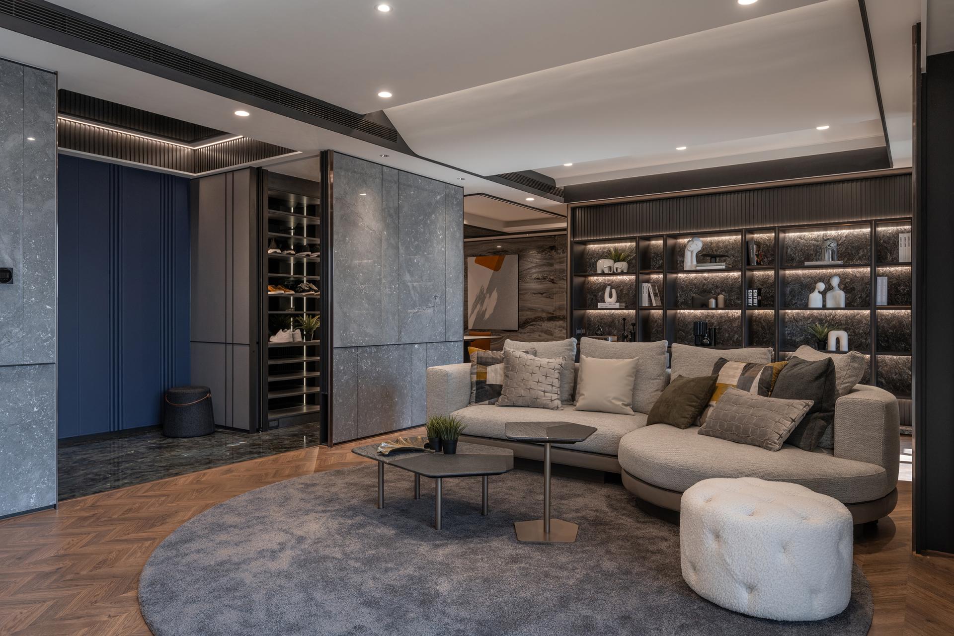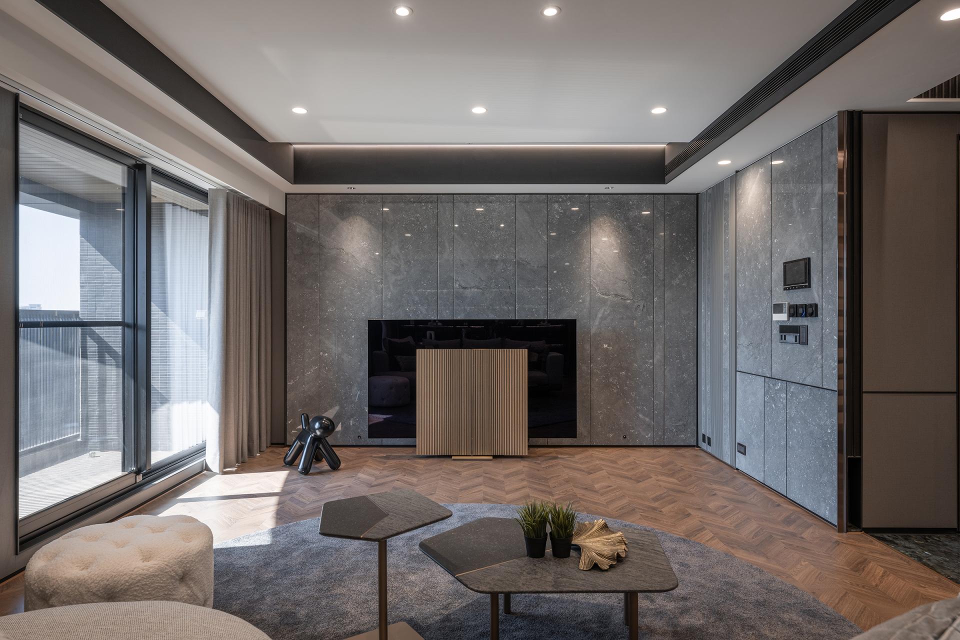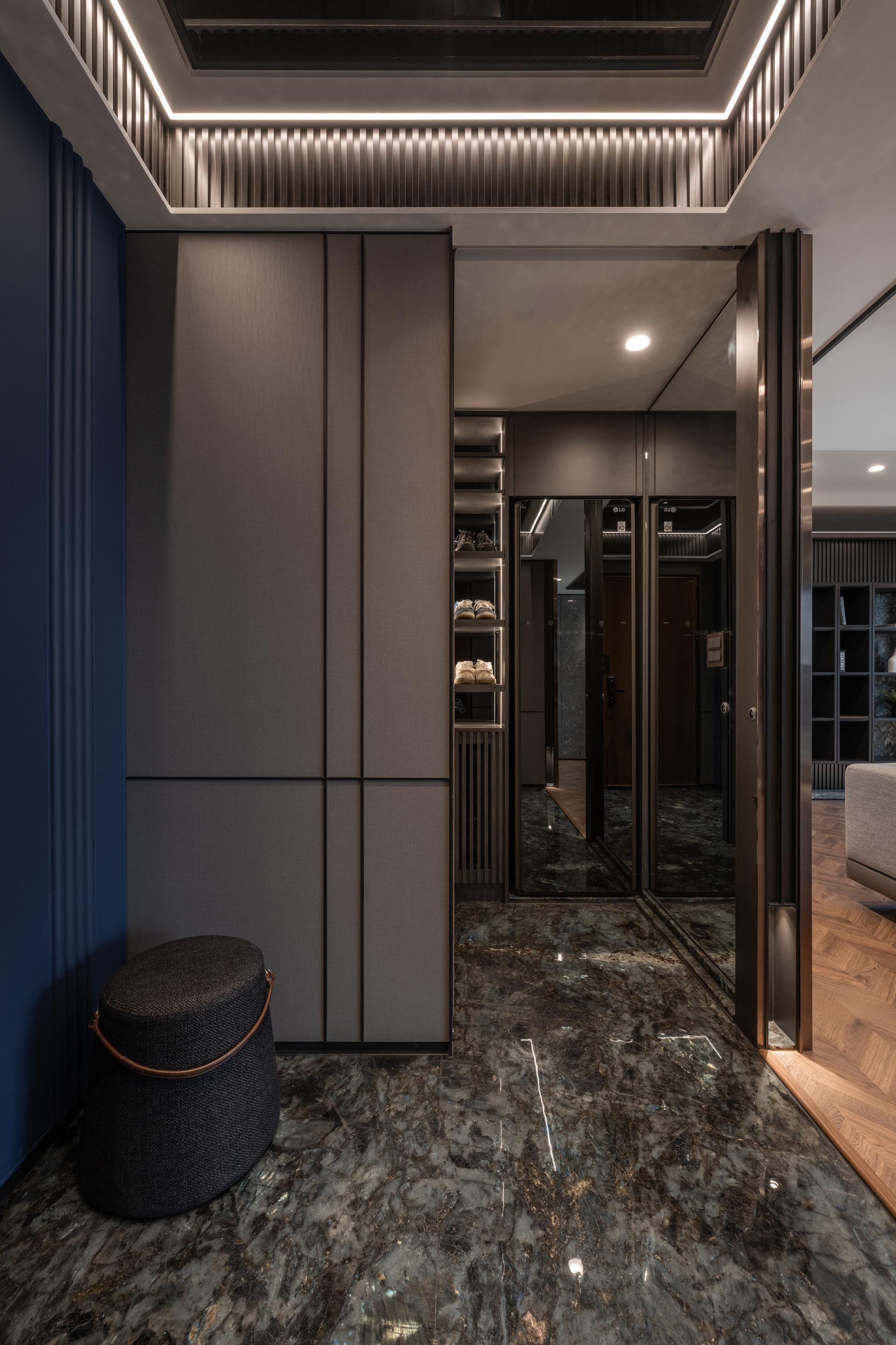 This project involves a newly built approximately 1,600 square feet residence, designed with the vision of creating a tasteful urban home for a modern man. The overall style follows a modern luxury approach, with three main design highlights: the use of stone, the application of contrasting colors throughout the space, and the integration of large beams and structural columns.