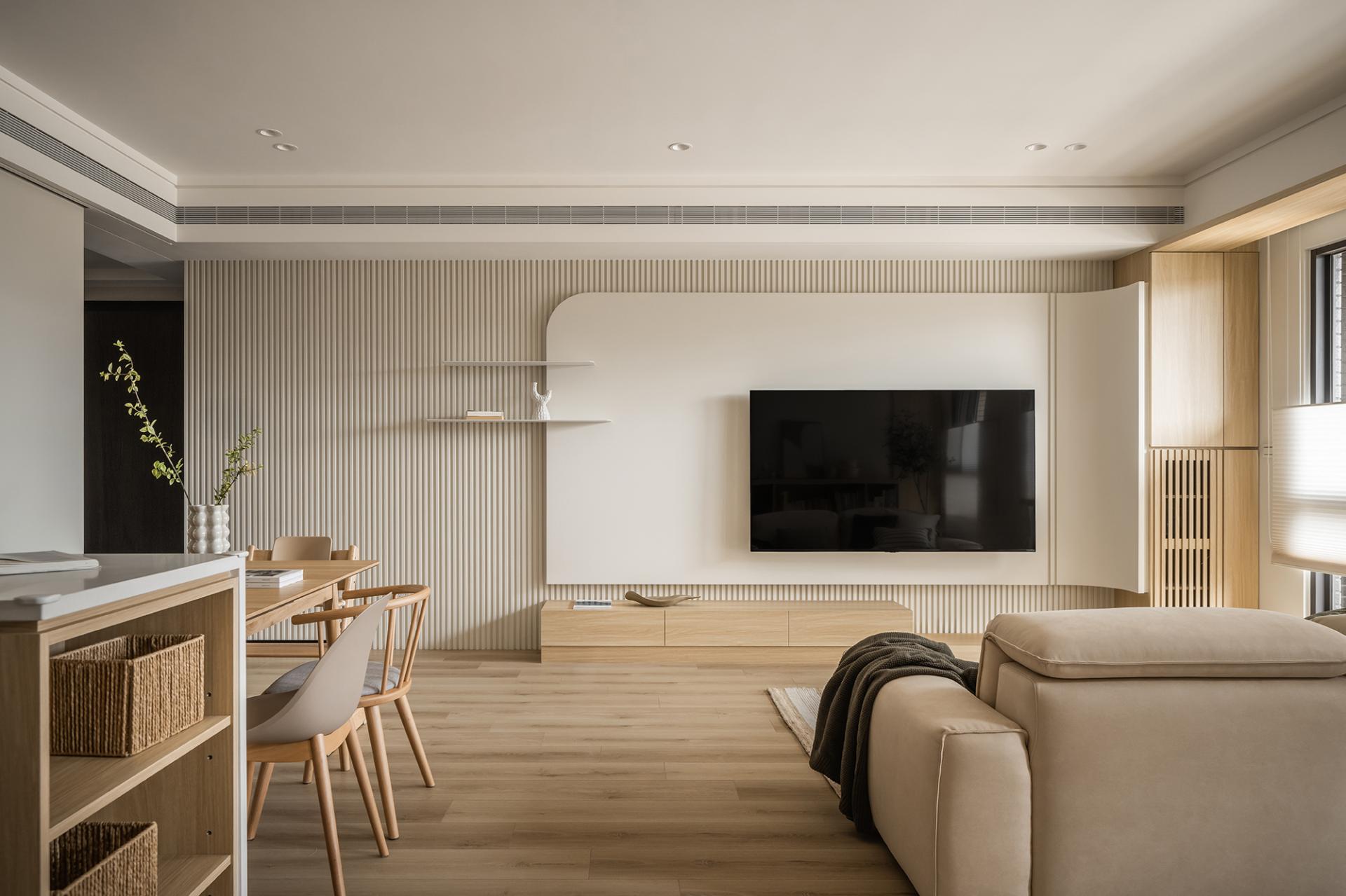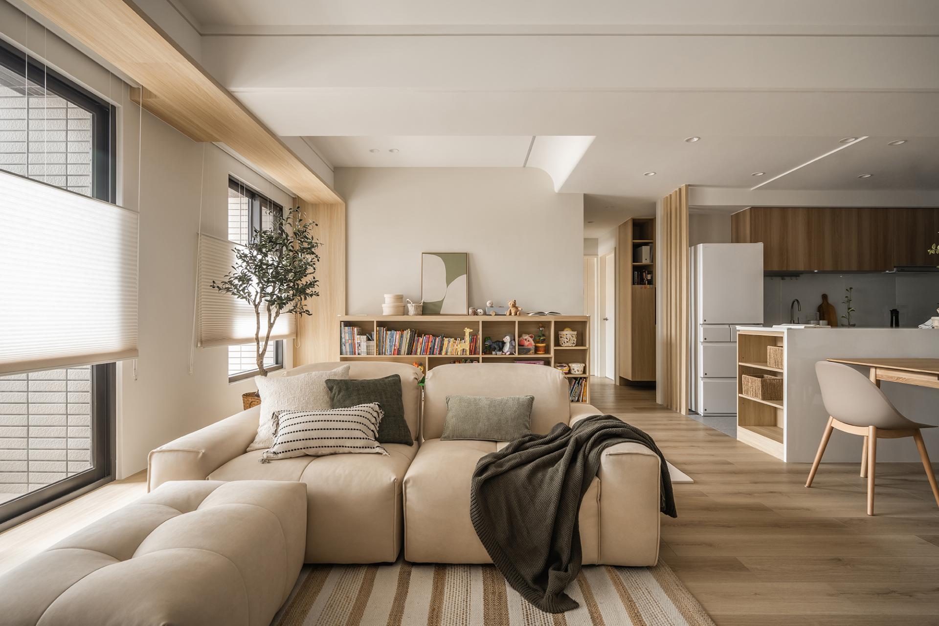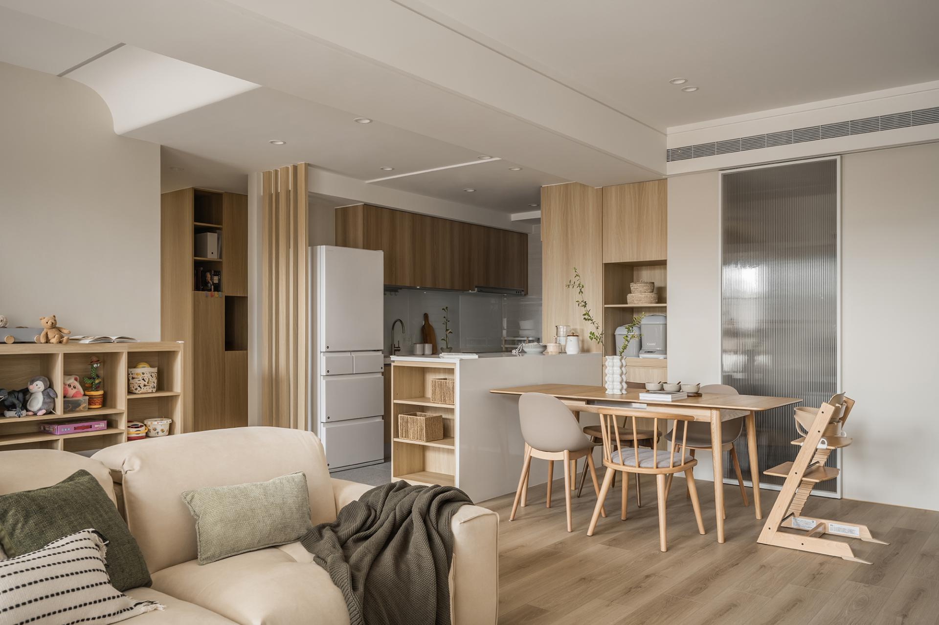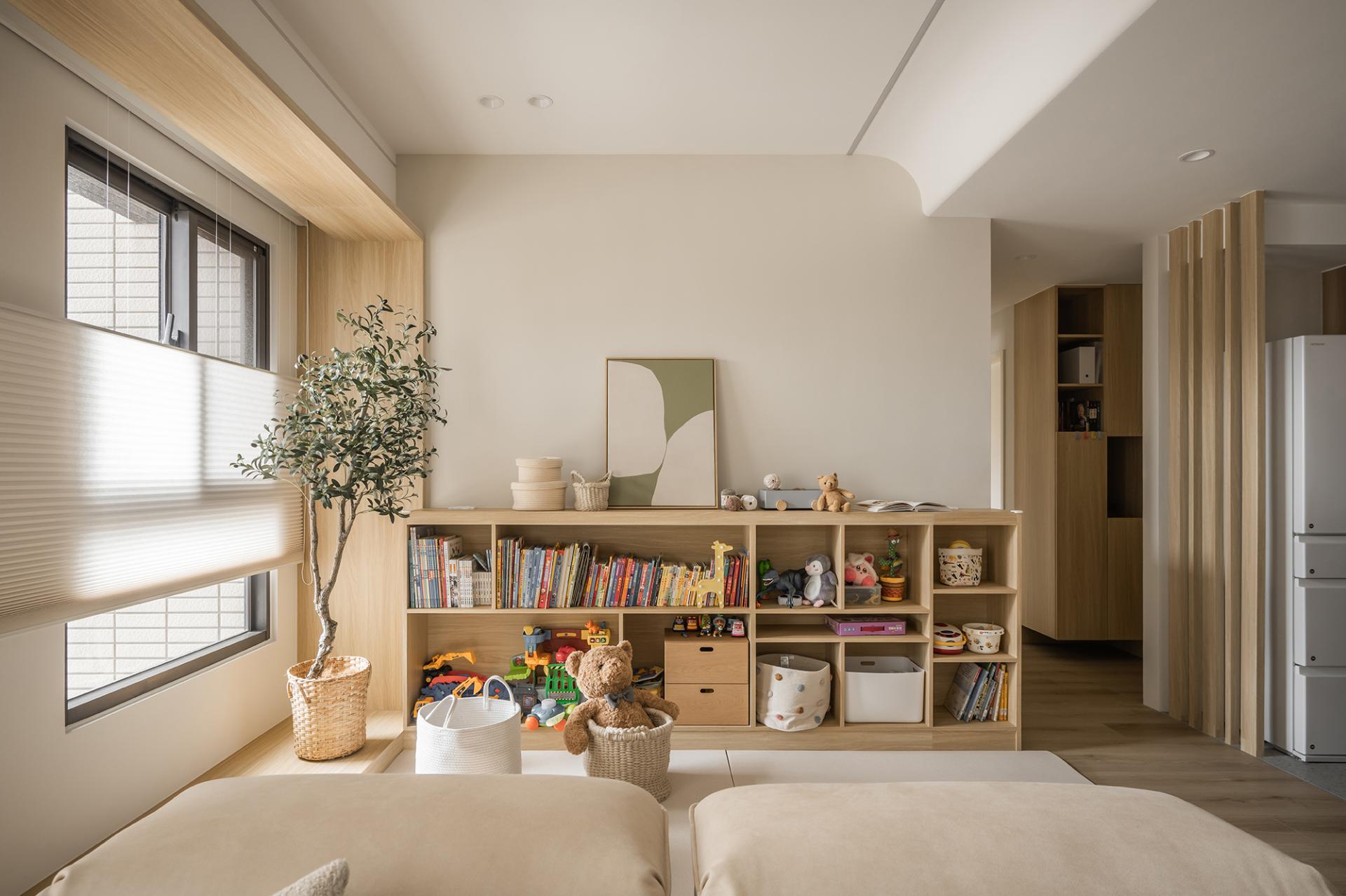The project, located in Taoyuan, is a three-room residence for a family of three. Inspired by the family's lifestyle and love for camping, the designer captured their deep connection to nature and their child. Centered on the concept of “a home where the child feels secure at first glance,” the design encourages safe and free exploration. The name Wanderoo symbolizes the child roaming freely like a wanderer. The overall space uses soft arcs and earth tones throughout—seen in the curved TV wall, ceiling corners, and window-side seating—to guide both sightlines and flow with a sense of embrace.