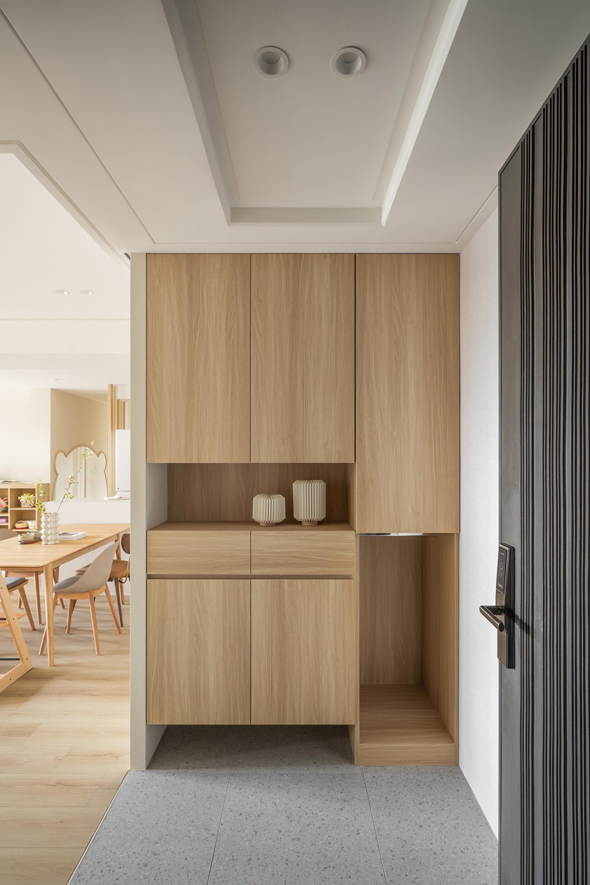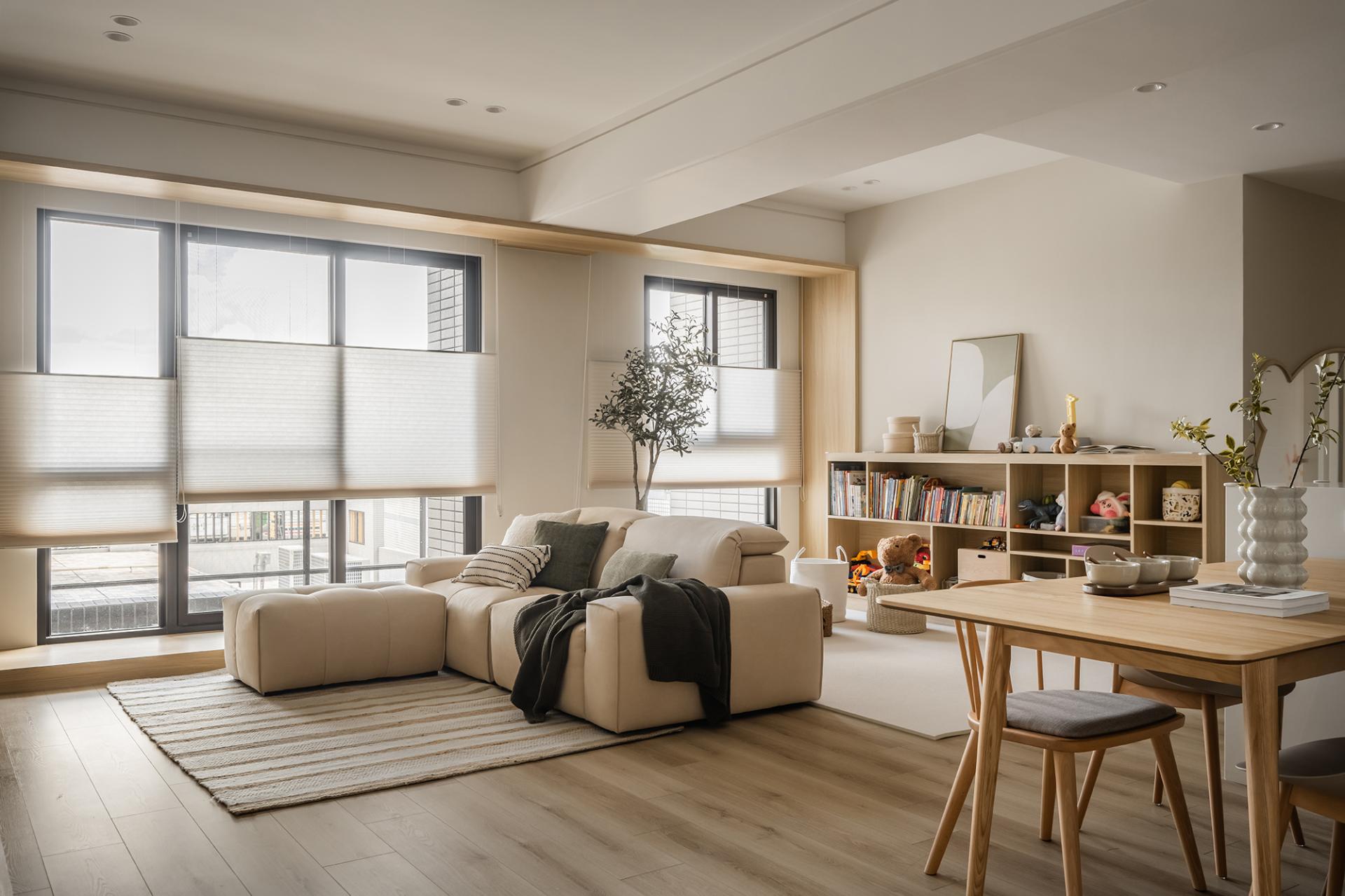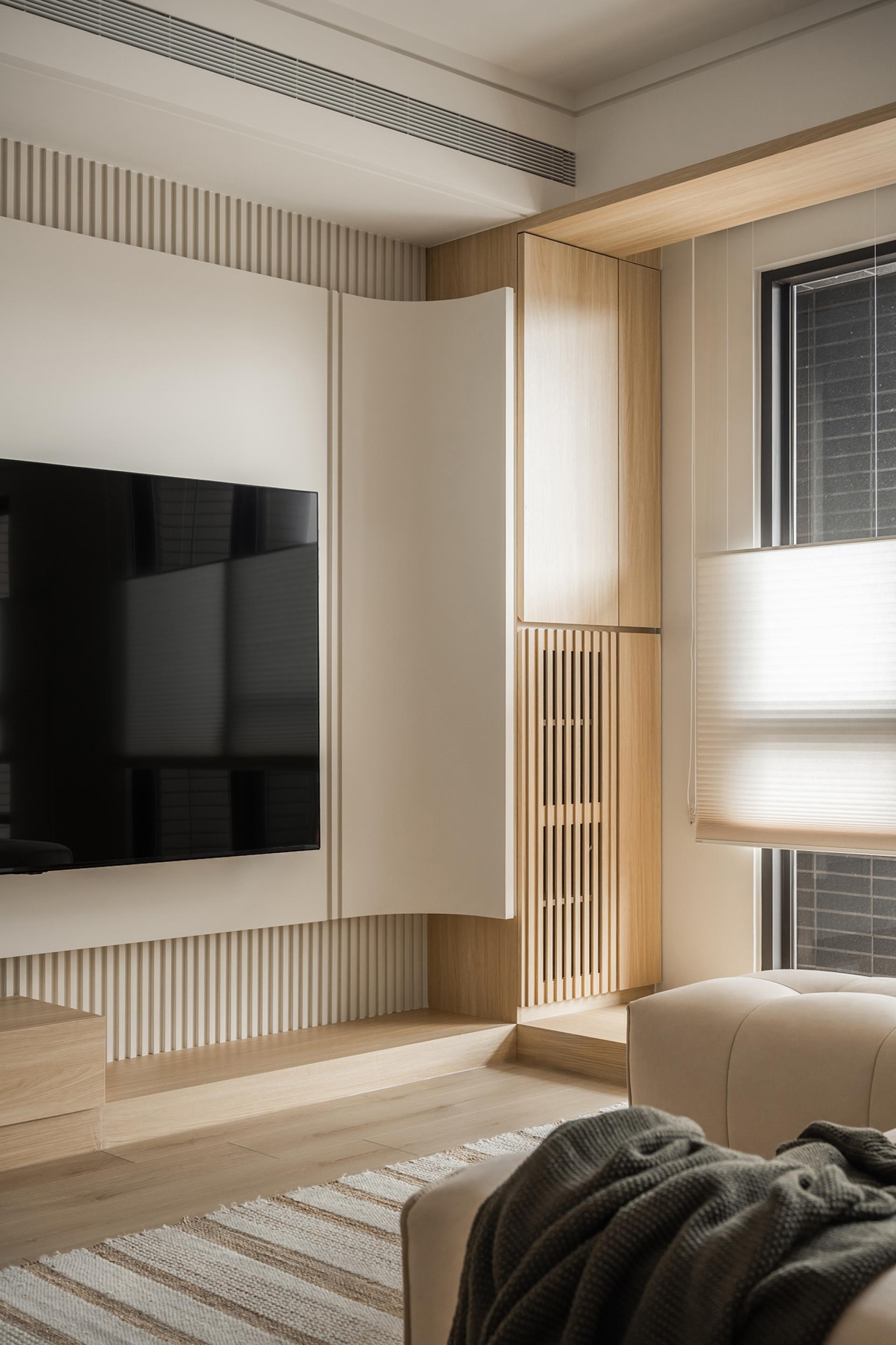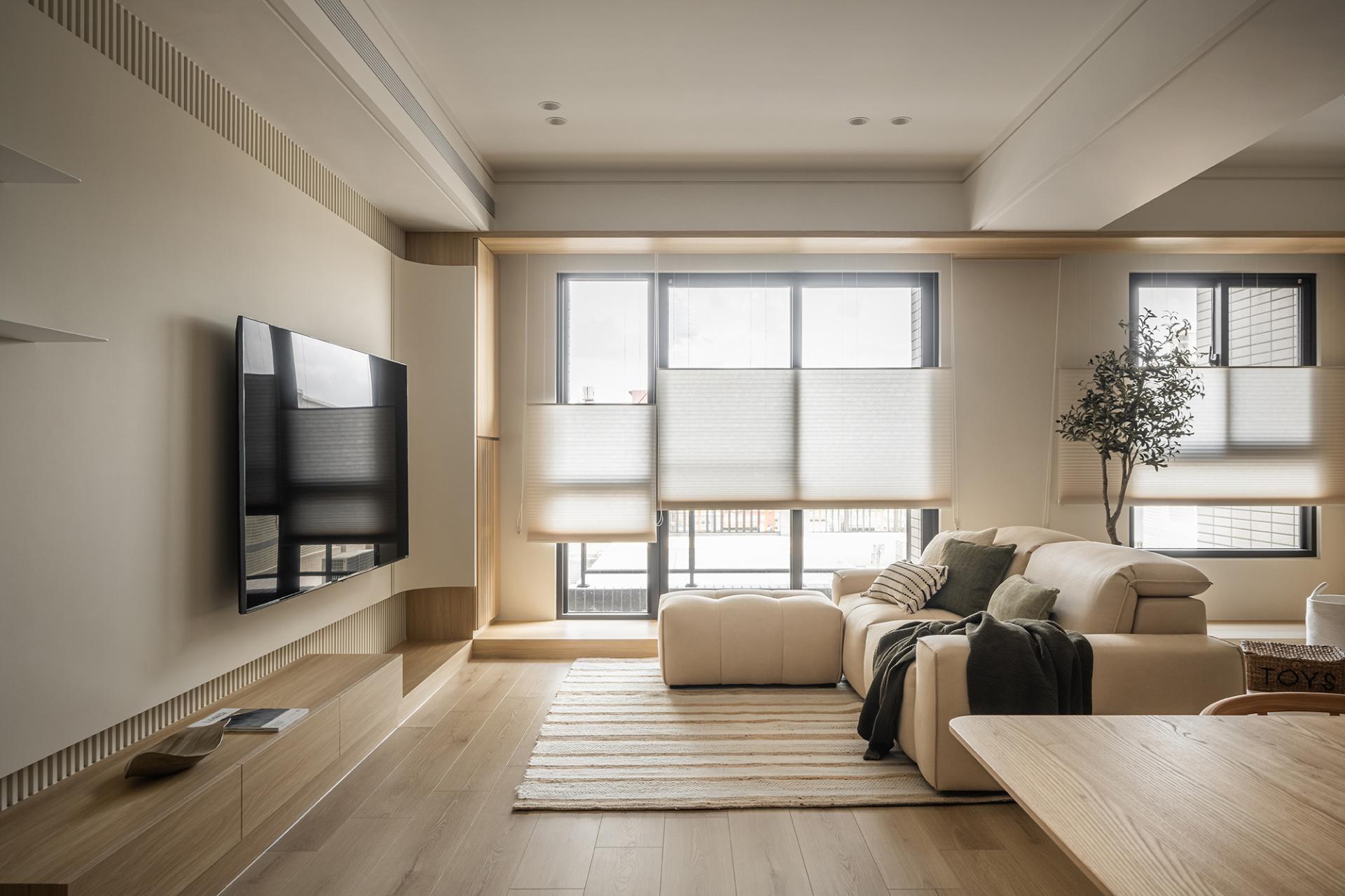 The project, located in Taoyuan, is a three-room residence for a family of three. Inspired by the family's lifestyle and love for camping, the designer captured their deep connection to nature and their child. Centered on the concept of “a home where the child feels secure at first glance,” the design encourages safe and free exploration. The name Wanderoo symbolizes the child roaming freely like a wanderer. The overall space uses soft arcs and earth tones throughout—seen in the curved TV wall, ceiling corners, and window-side seating—to guide both sightlines and flow with a sense of embrace.