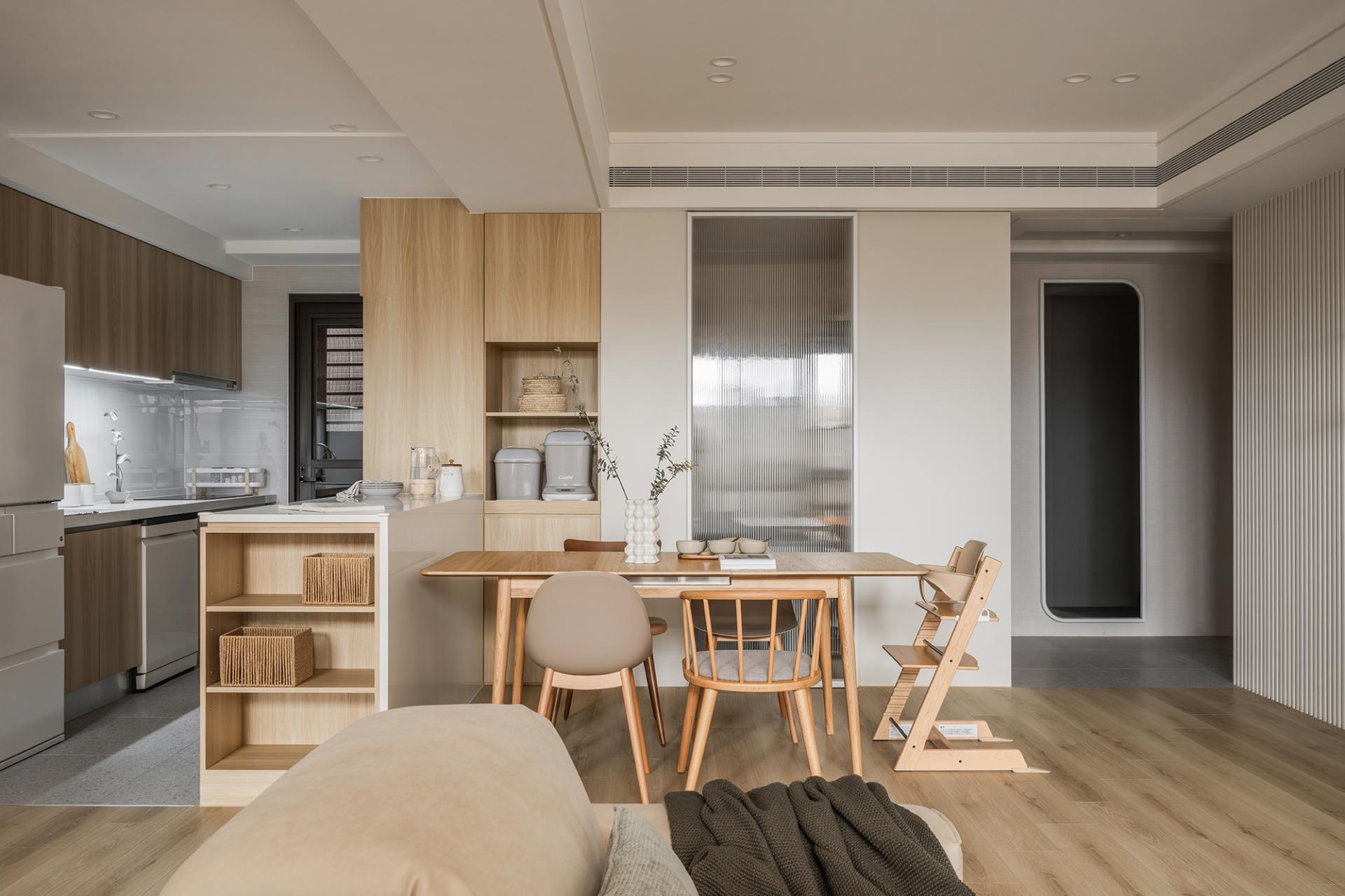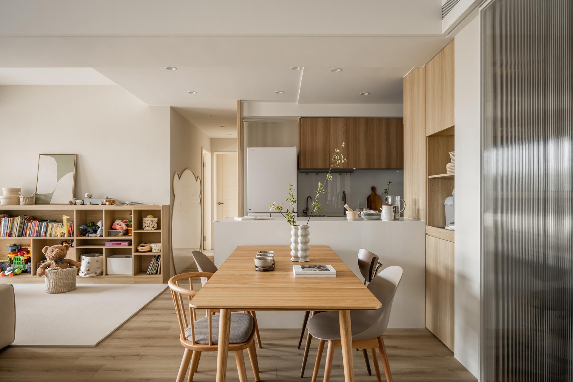 The window-side lounge, designed for the mother, offers a cozy nook for reading while keeping an eye on the child. Accordion blinds and a raised platform create an embracing, intimate atmosphere. The dining and desk areas are interchangeable, allowing for layout flexibility. A hidden storage room—concealed behind fluted glass sliding doors—concentrates household storage, accommodating strollers, electric wardrobes, and camping gear, keeping the communal areas organized.