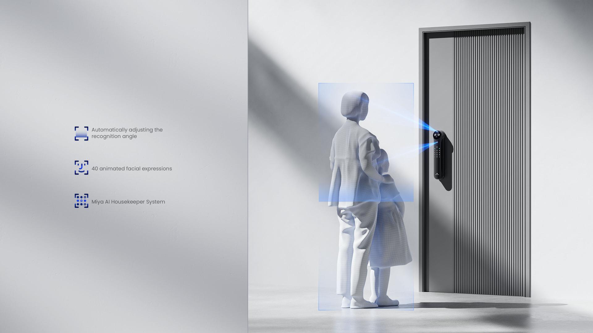 The product introduces the world’s first gimbal-based peephole camera, allowing users to rotate and view the area in front of the door freely, and tracking human automatically. With intelligent human-tracking and zero blind spots, it far surpasses traditional fixed peepholes. It also adjusts the recognition angle based on the user’s height—especially considerate for facial recognition in children. Integrated with the Miya AI Housekeeper System, which includes an advanced large language model, interactive engine, and multi-dimensional surveillance, it supports intelligent dialogue, visitor identification, and package monitoring—minimizing the need for physical interaction.