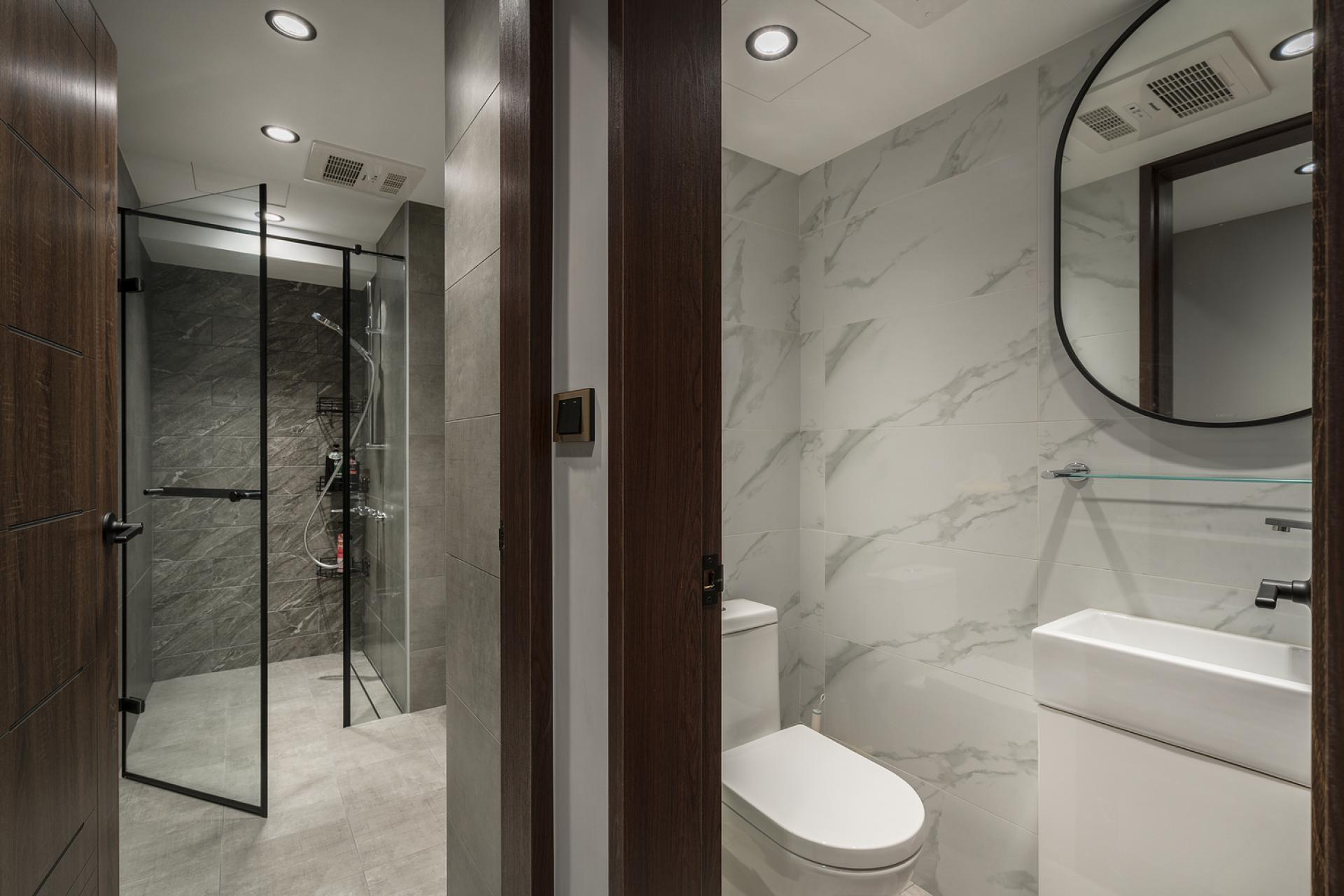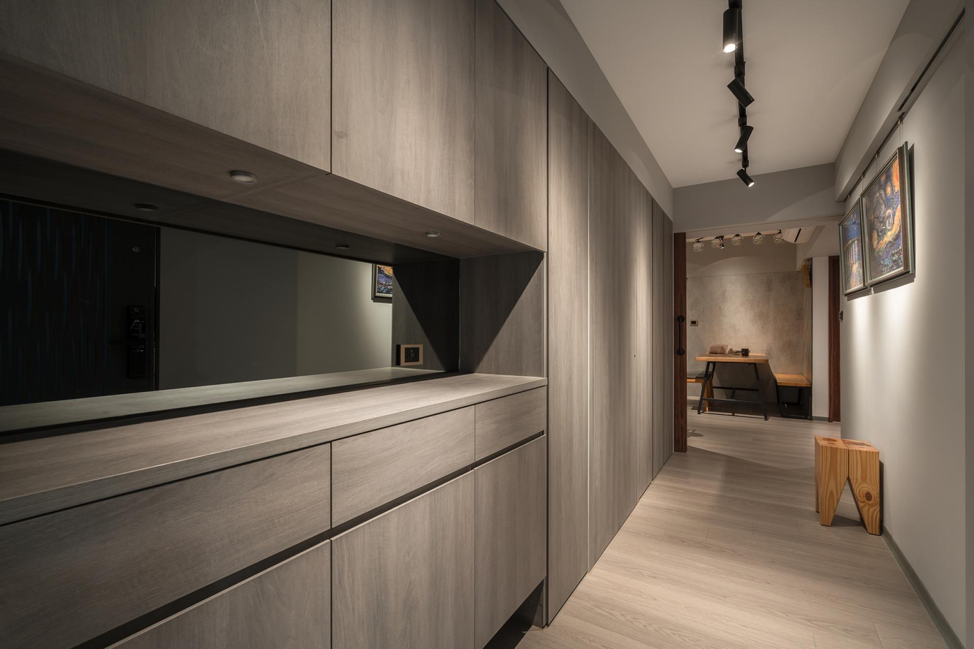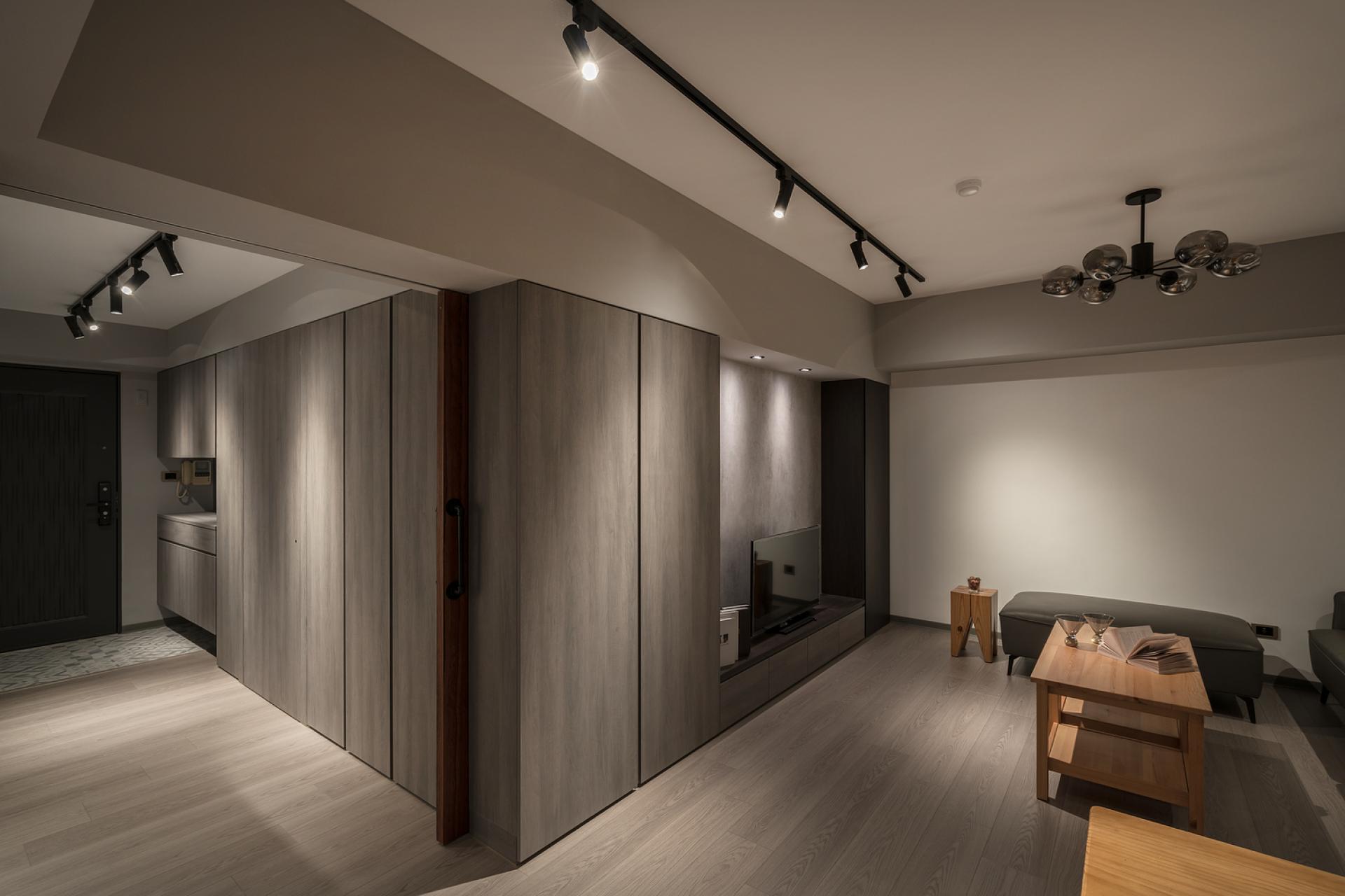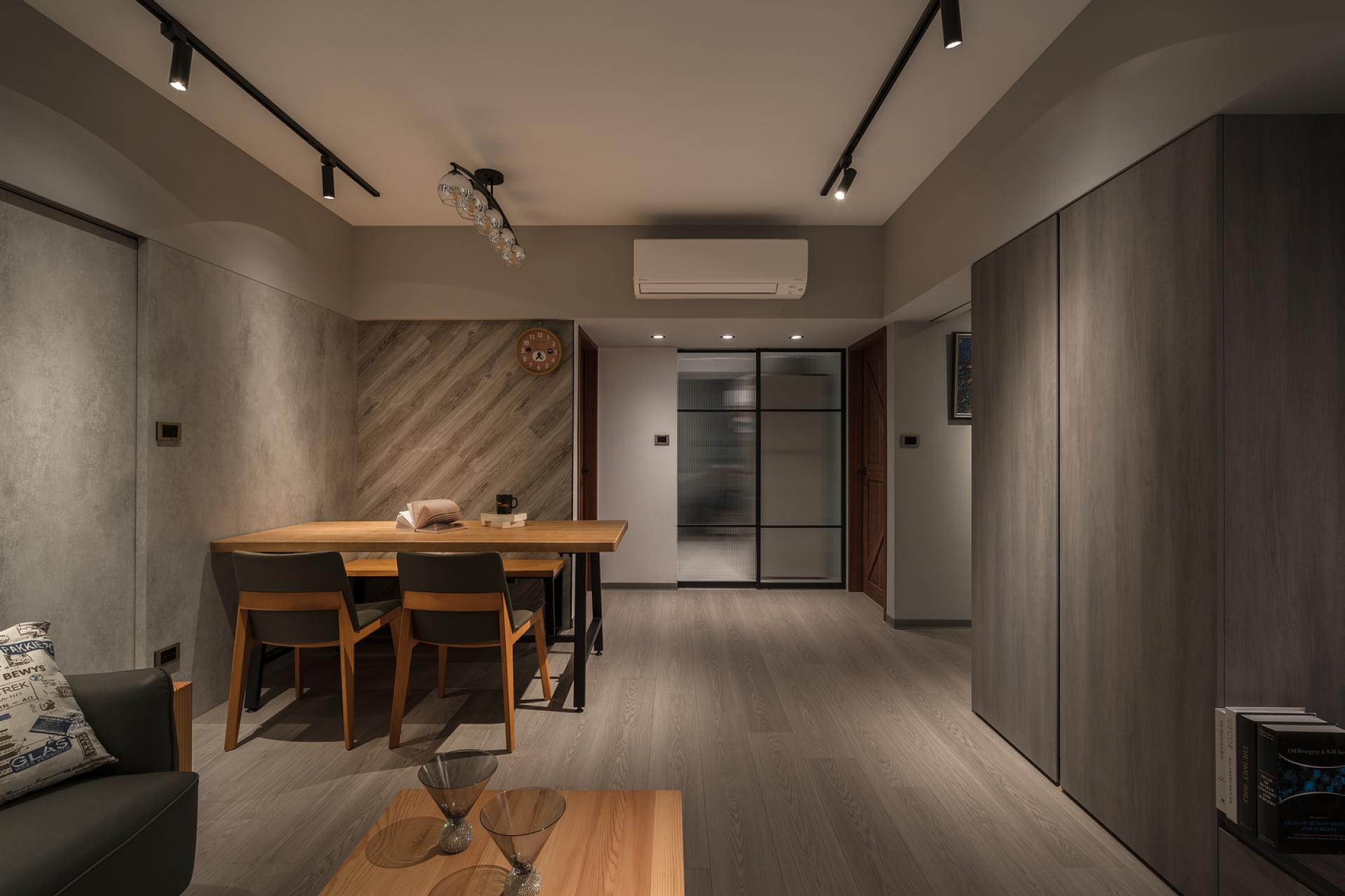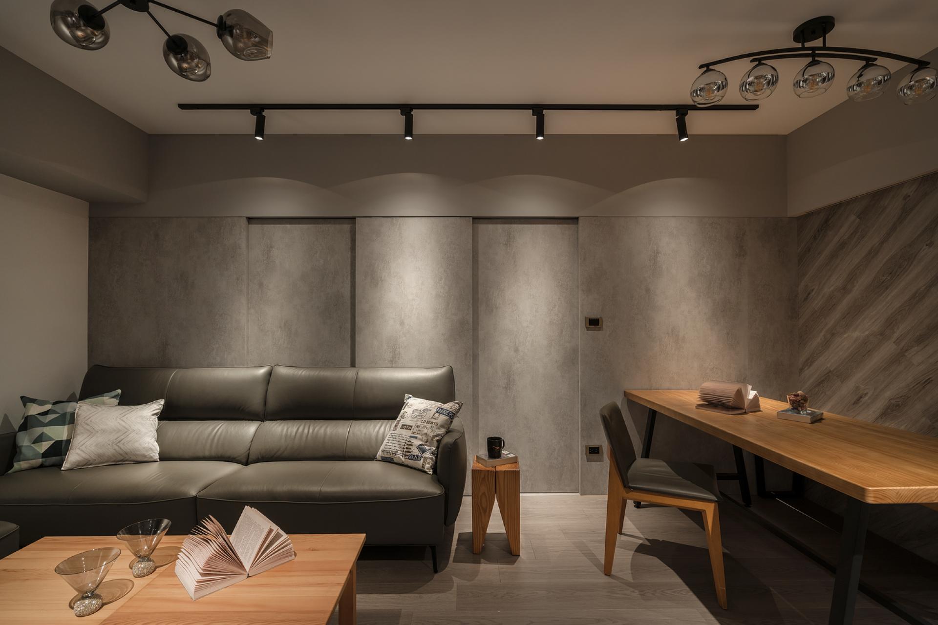 True refinement in home design is not defined by costly materials but by ingenious execution and creative intention. Against a backdrop of calm gray tones, tactile elements such as leather seating and wooden coffee tables introduce grounded warmth, and metal-accented track lights and pendant fixtures artfully add an industrial flair. The resulting aesthetic is edgy and refined, accurately integrating the couple’s contrasting preferences. The TV wall features built-in cabinetry in a clean, unified layout, offering storage without visual clutter. The conventional horizontal grain in the dining area is reimagined with 45-degree veneer paneling, bringing a sense of movement and understated vibrancy to a life of enduring strength and quiet elegance.