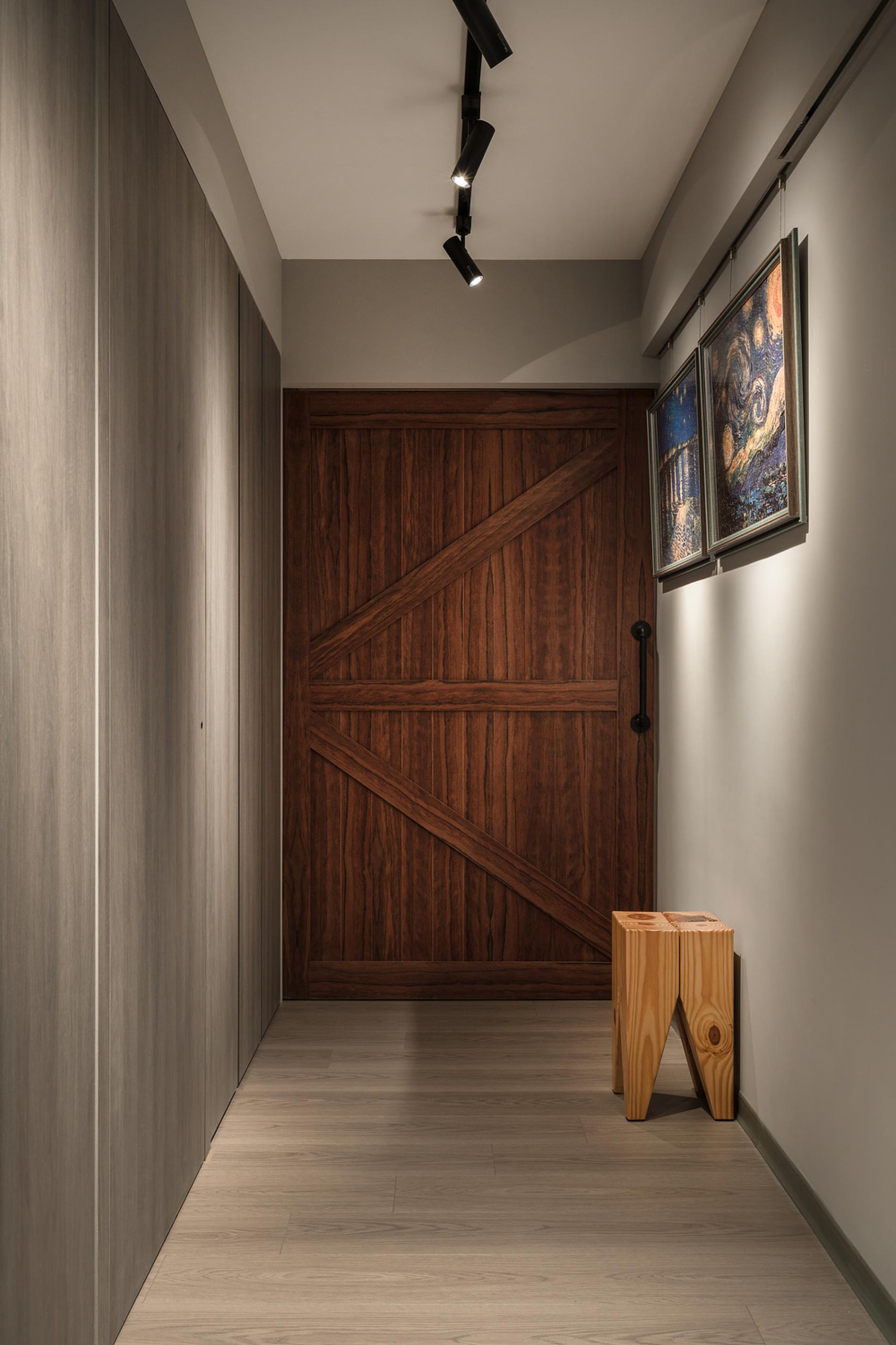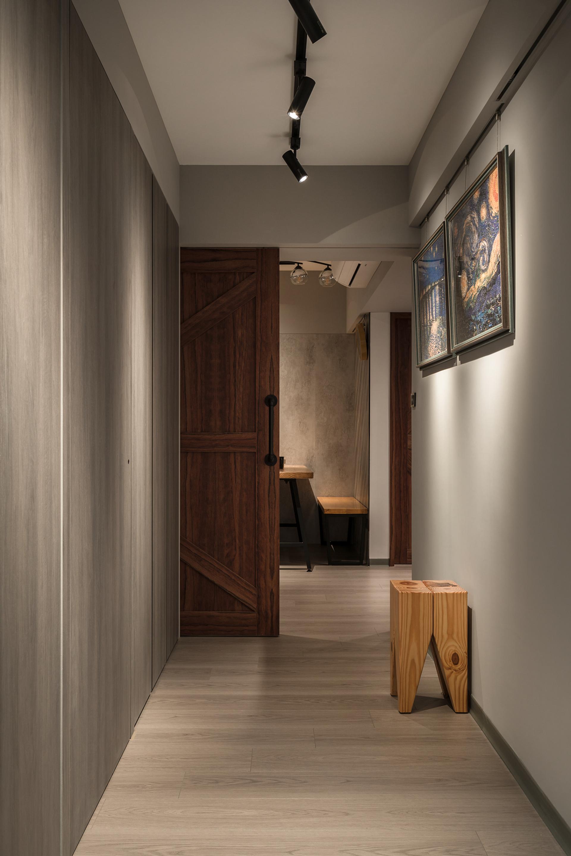 In response to the couple’s differing aesthetic preferences, the design team curated a hybrid style that blends industrial strength with understated luxury. A handcrafted barn door serves as a defining feature, while wood, stone, and metal interplay to strike a refined equilibrium between rugged character and delicate detail. Warm wooden furnishings, introducing just the right degree of softness to counterbalance the raw edge of industrial elements, thoughtfully temper the chill restraint of the gray palette. Built-in cabinetry and concealed doors enhance function and flow, creating a streamlined layout along the narrow corridor where utility and visual clarity coexist in quiet harmony.