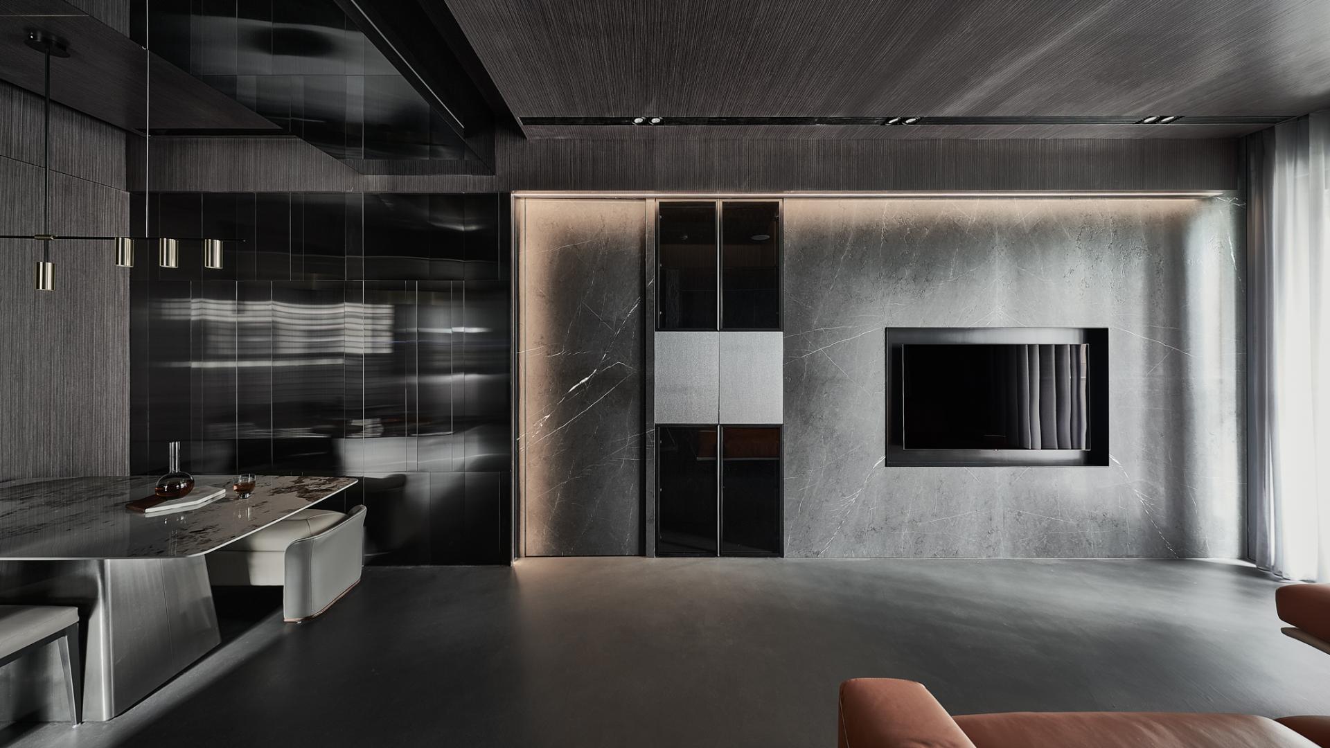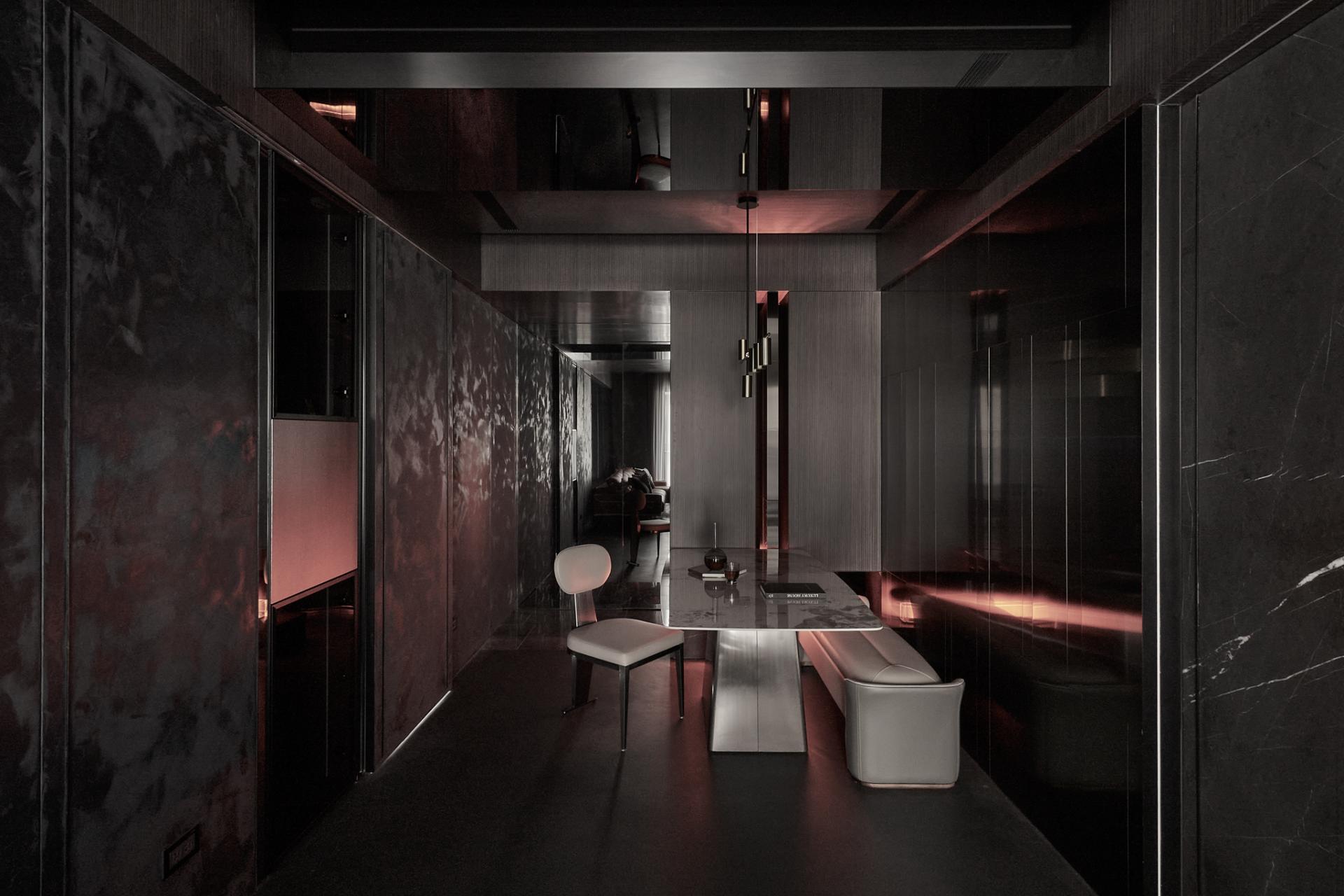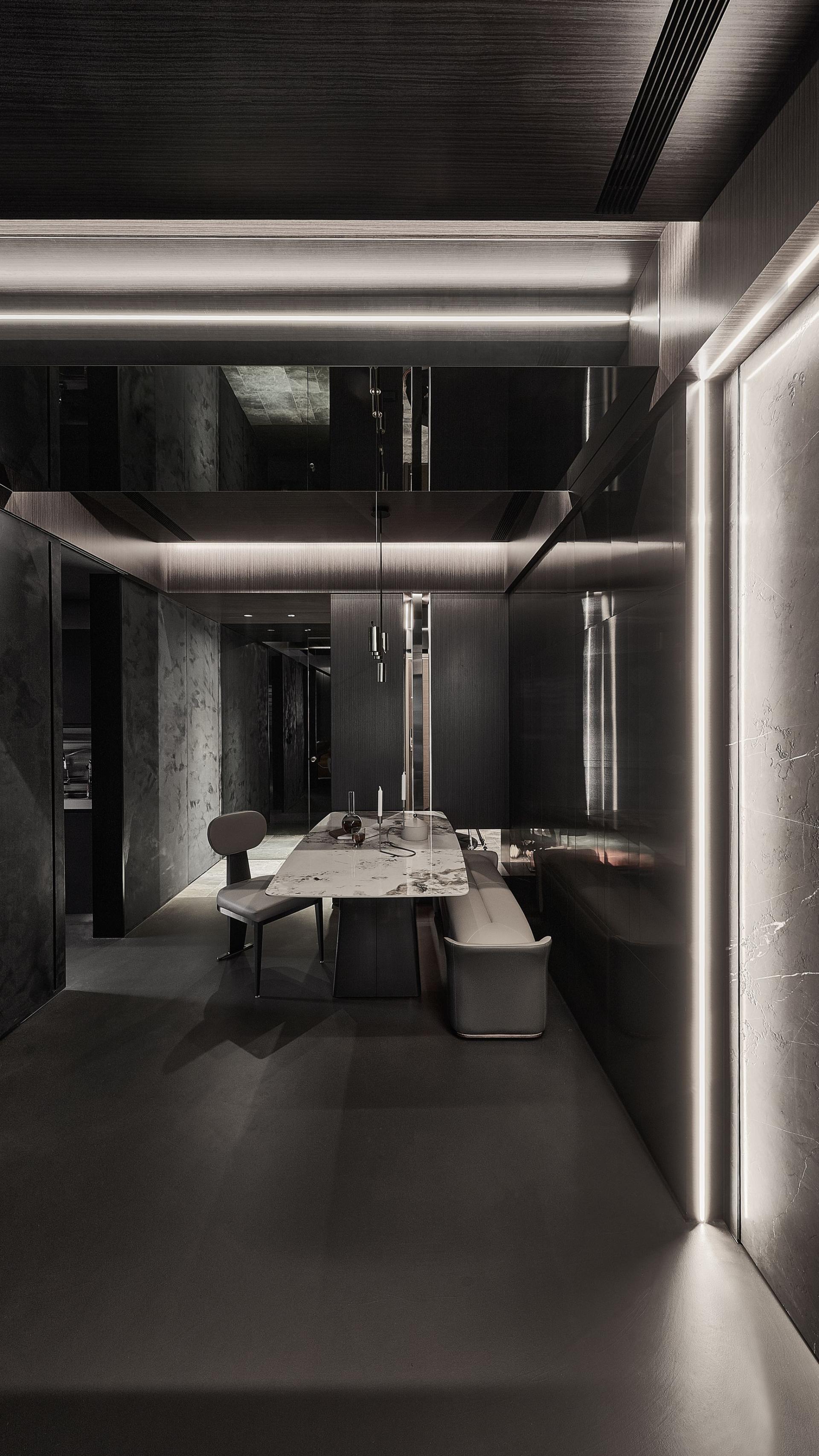 From the moment one enters, a luminous translucent stone panel radiates a gentle welcome, while brushed metal cabinetry sets an elegant, industrial tone. Open spatial flow and mirrored ceilings extend perceived height, amplifying daylight and accent lighting into layered rhythms. In the dining area, brushed metal wall panels refract and diffuse light, scattering it into glimmers that evoke the fluidity of water and the softness of candlelight, lending a dynamic vitality to everyday routines.