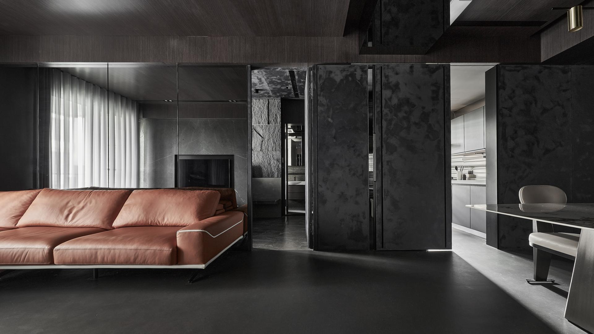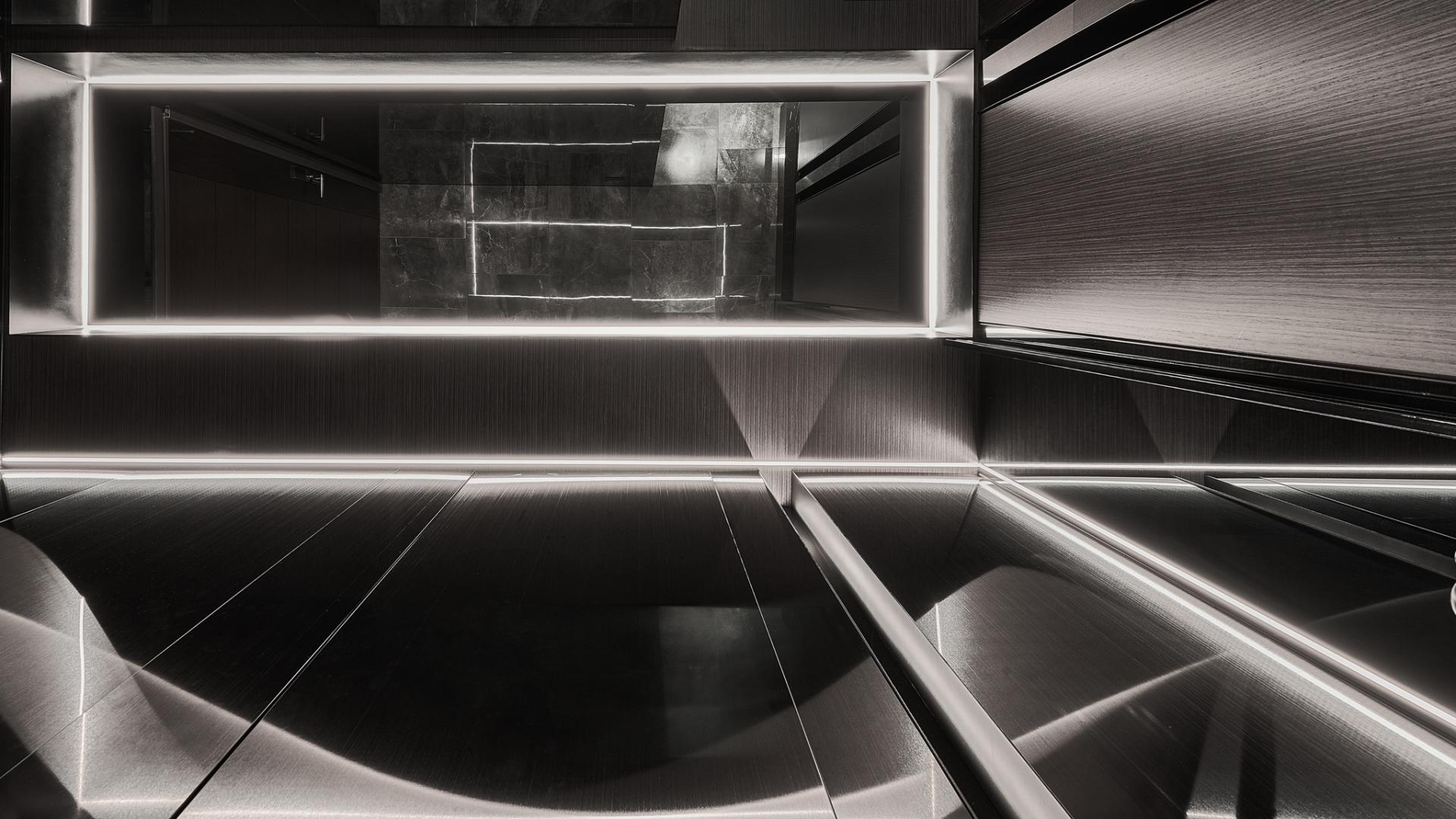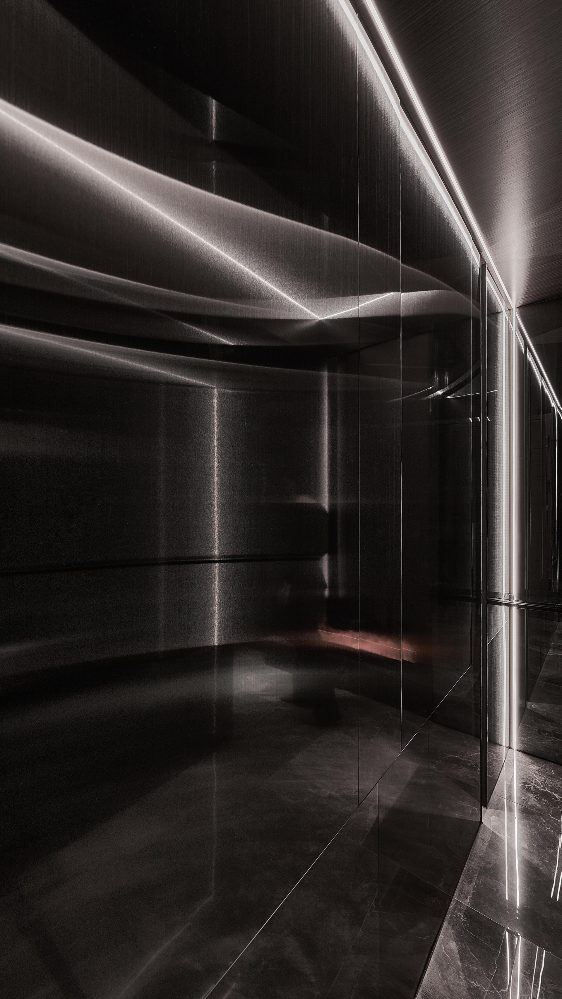 From the moment one enters, a luminous translucent stone panel radiates a gentle welcome, while brushed metal cabinetry sets an elegant, industrial tone. Open spatial flow and mirrored ceilings extend perceived height, amplifying daylight and accent lighting into layered rhythms. In the dining area, brushed metal wall panels refract and diffuse light, scattering it into glimmers that evoke the fluidity of water and the softness of candlelight, lending a dynamic vitality to everyday routines.
