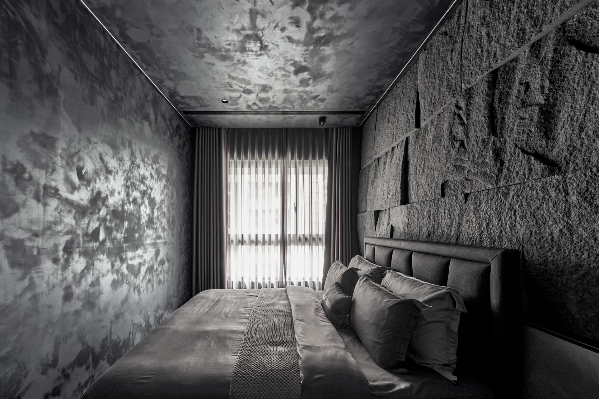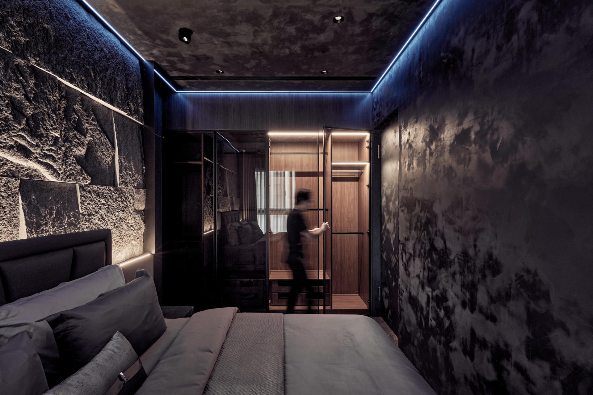 The living spaces are defined by a cool monochromatic palette and non-toxic mineral-coated flooring that offers both comfort and environmental well-being. The bedroom brings nature inside with a hand-laid stone veneer headboard wall, recalling the rugged beauty of mountain cliffs and fostering a calming retreat. In the gaming room, a custom-illuminated Avengers emblem reflects the owner’s passions, merging pop culture with architectural refinement in a playful yet refined expression.