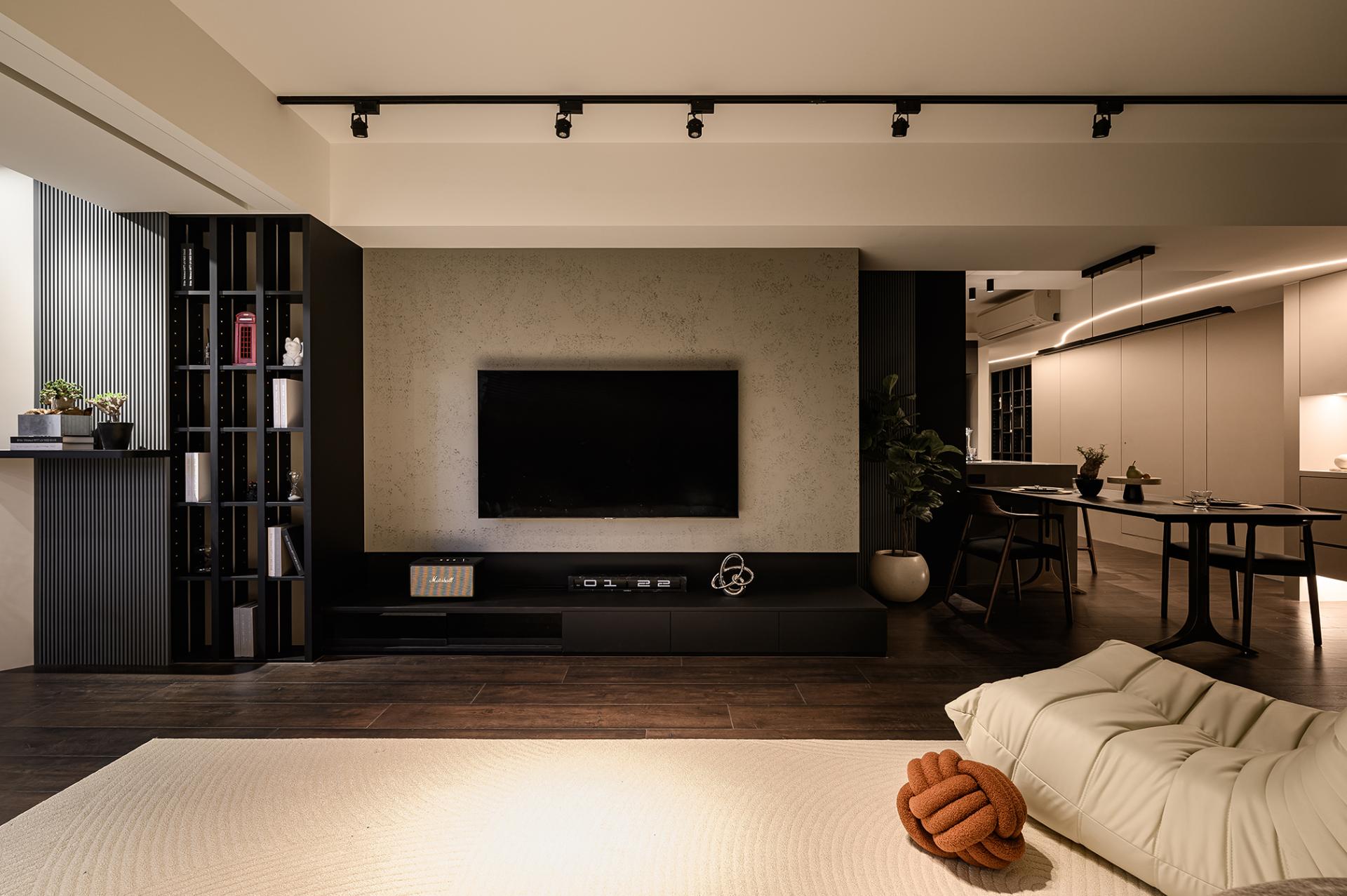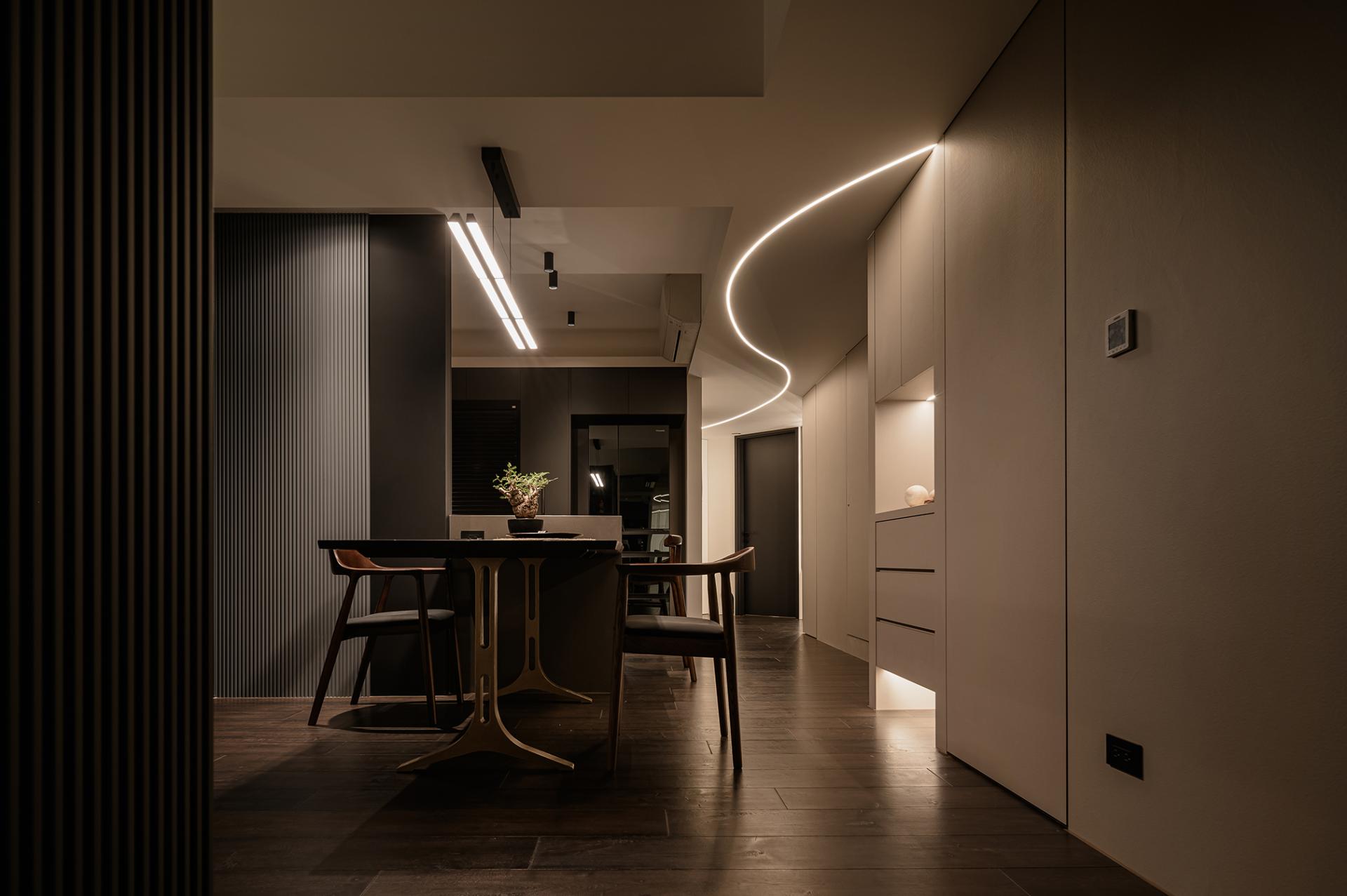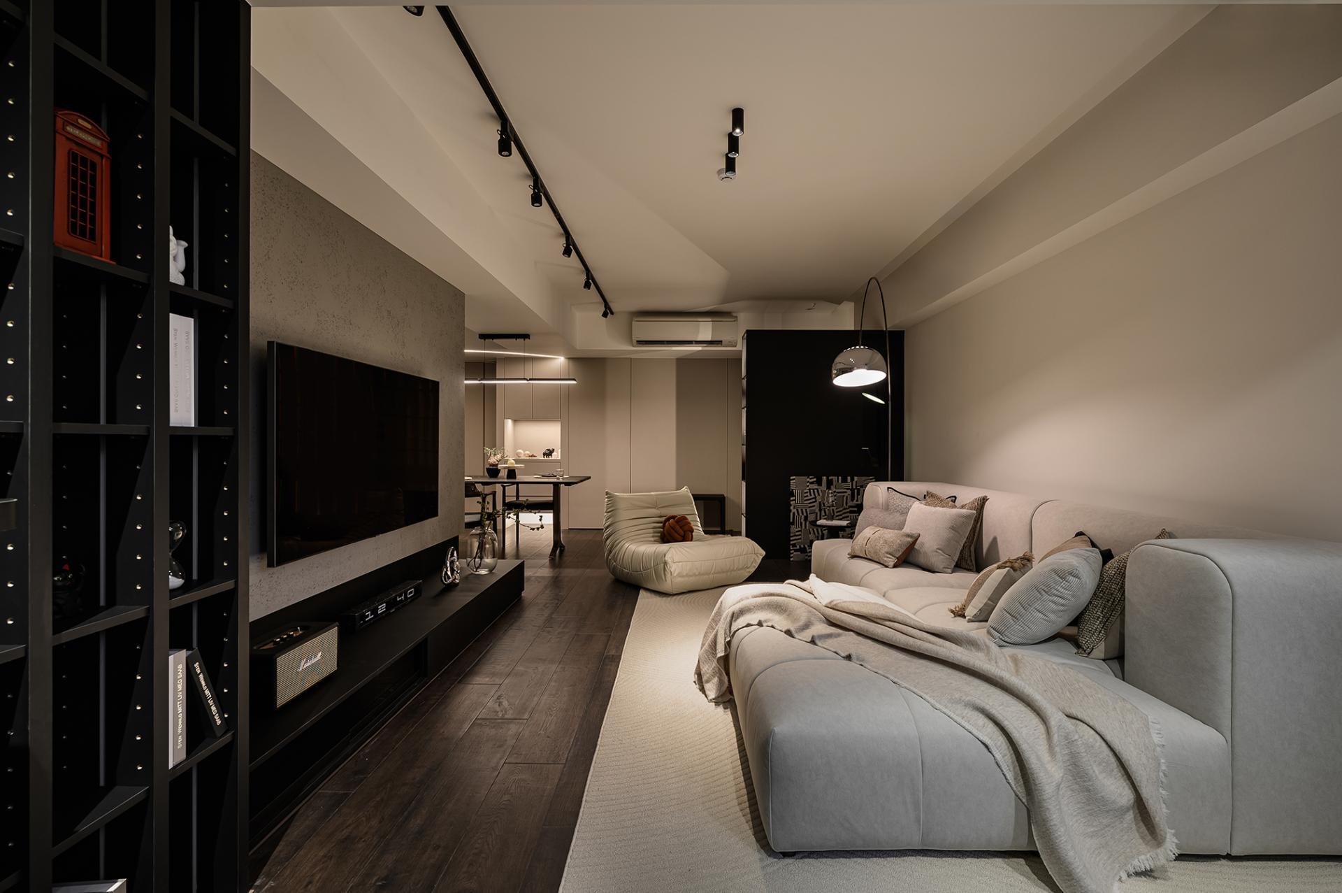 Located on Minquan East Road, Section 6, Taipei City, the 119 square meters apartment became a shared residence for a young couple and their three cats. Preferring dark palettes and stylish atmospheres, the homeowners guided the designer to adopt a minimalist modern aesthetic with black, gray, and beige as the foundation. Clean lines established a composed ambience, while highlights included the integration of beams and ducts into a flat ceiling with a curving light strip, transforming flaws into a focal point; the kitchen wall clad in herringbone tiles, adding rhythm and layering; and the thoughtful addition of custom cat doors enabling free movement between rooms.