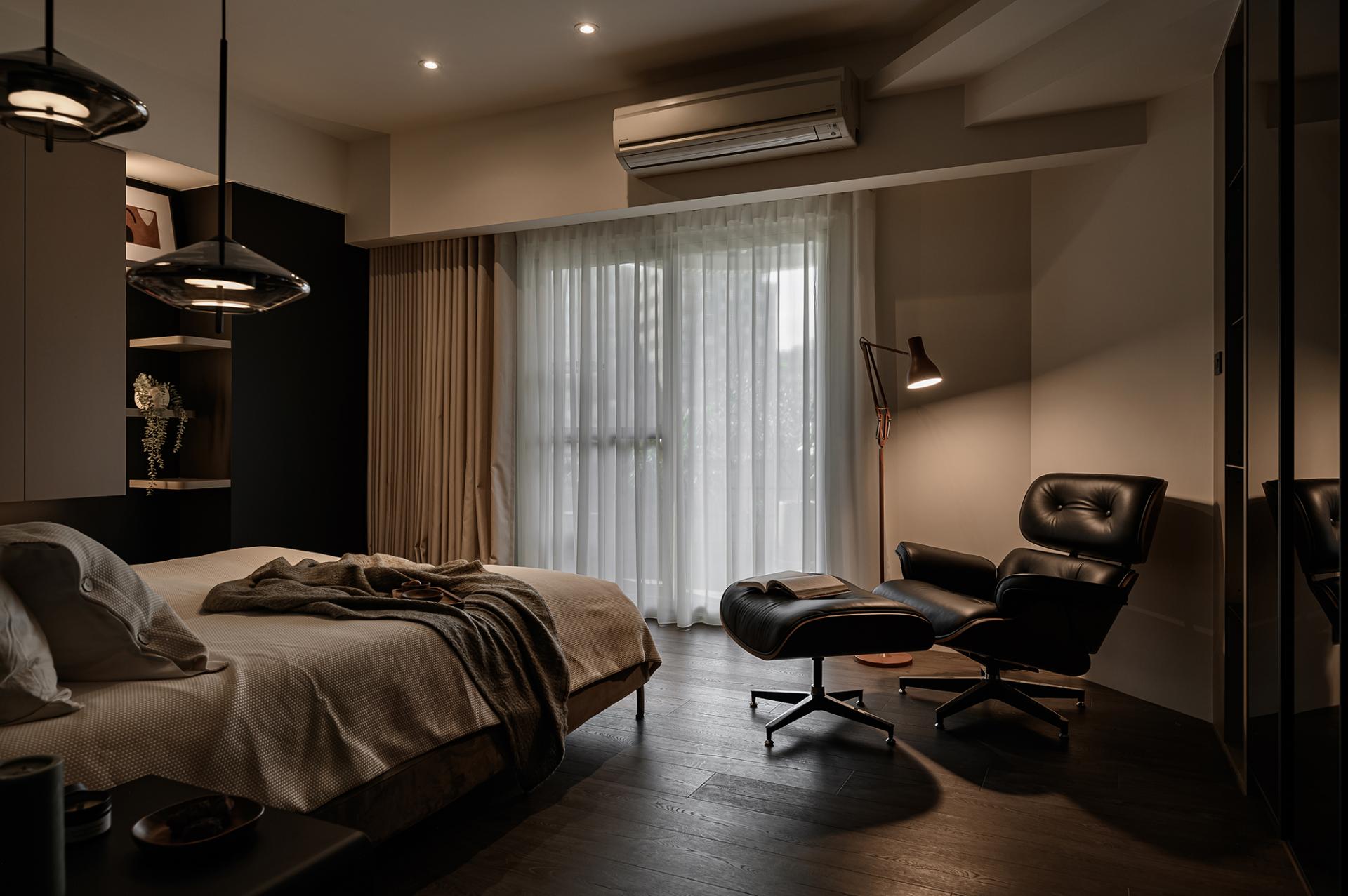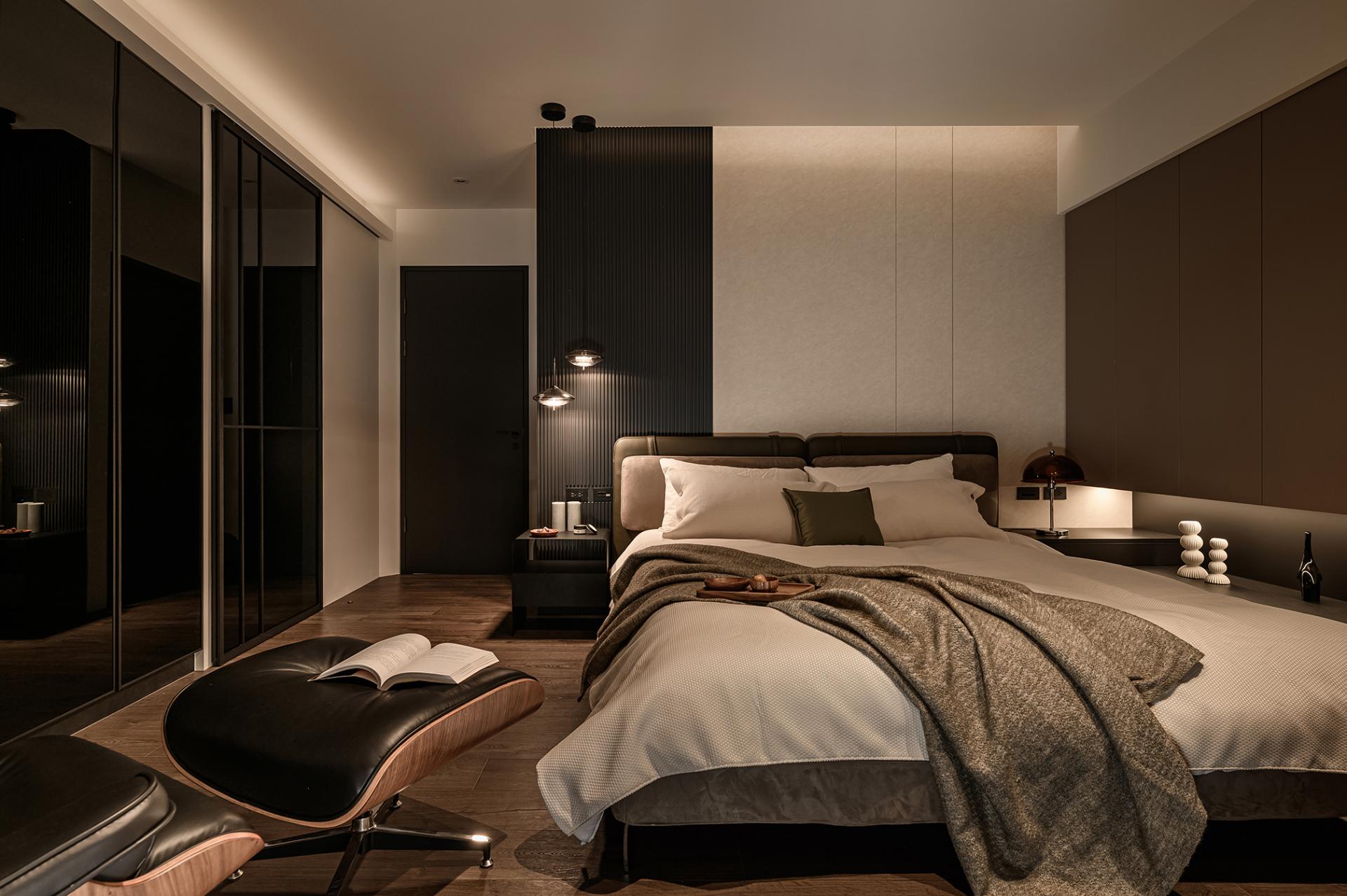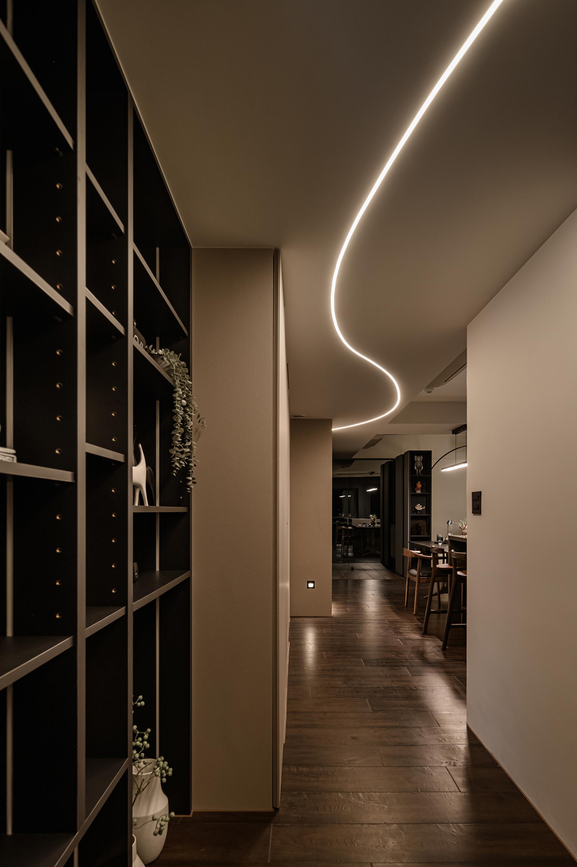 Located on Minquan East Road, Section 6, Taipei City, the 119 square meters apartment became a shared residence for a young couple and their three cats. Preferring dark palettes and stylish atmospheres, the homeowners guided the designer to adopt a minimalist modern aesthetic with black, gray, and beige as the foundation. Clean lines established a composed ambience, while highlights included the integration of beams and ducts into a flat ceiling with a curving light strip, transforming flaws into a focal point; the kitchen wall clad in herringbone tiles, adding rhythm and layering; and the thoughtful addition of custom cat doors enabling free movement between rooms.