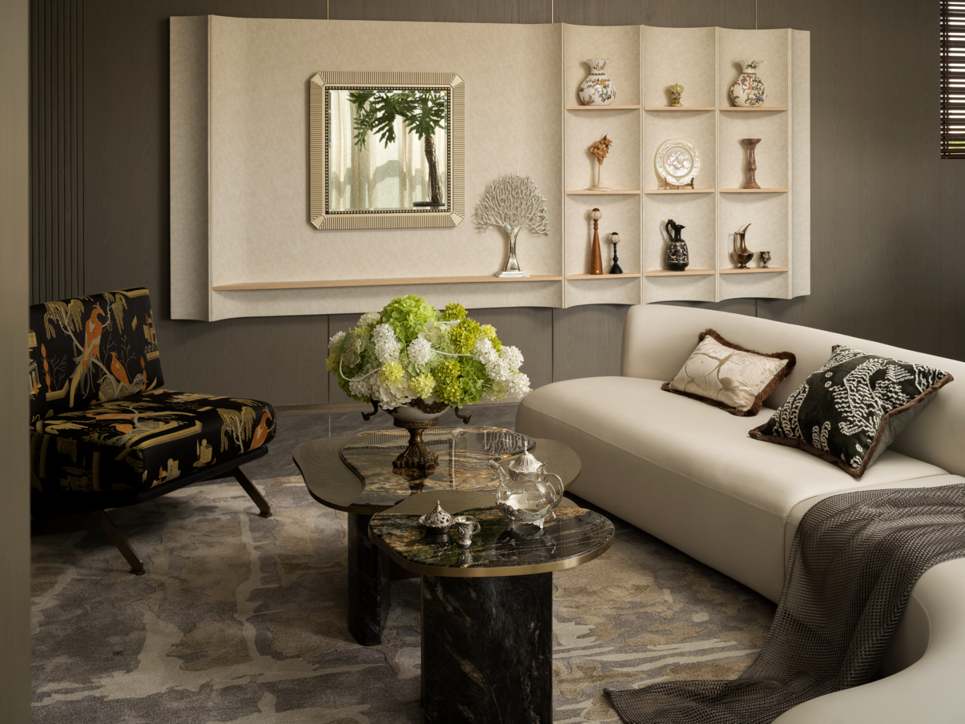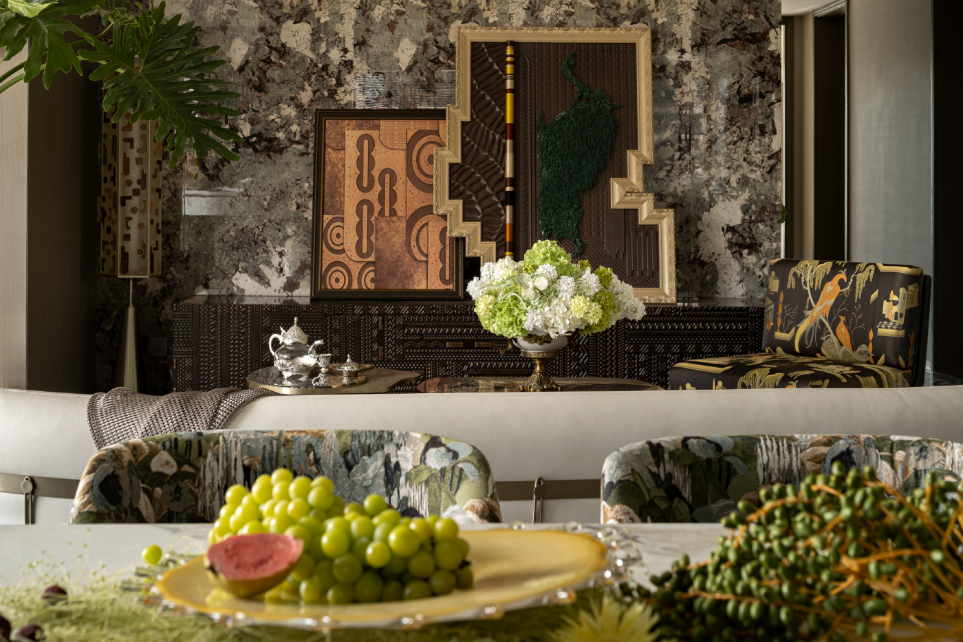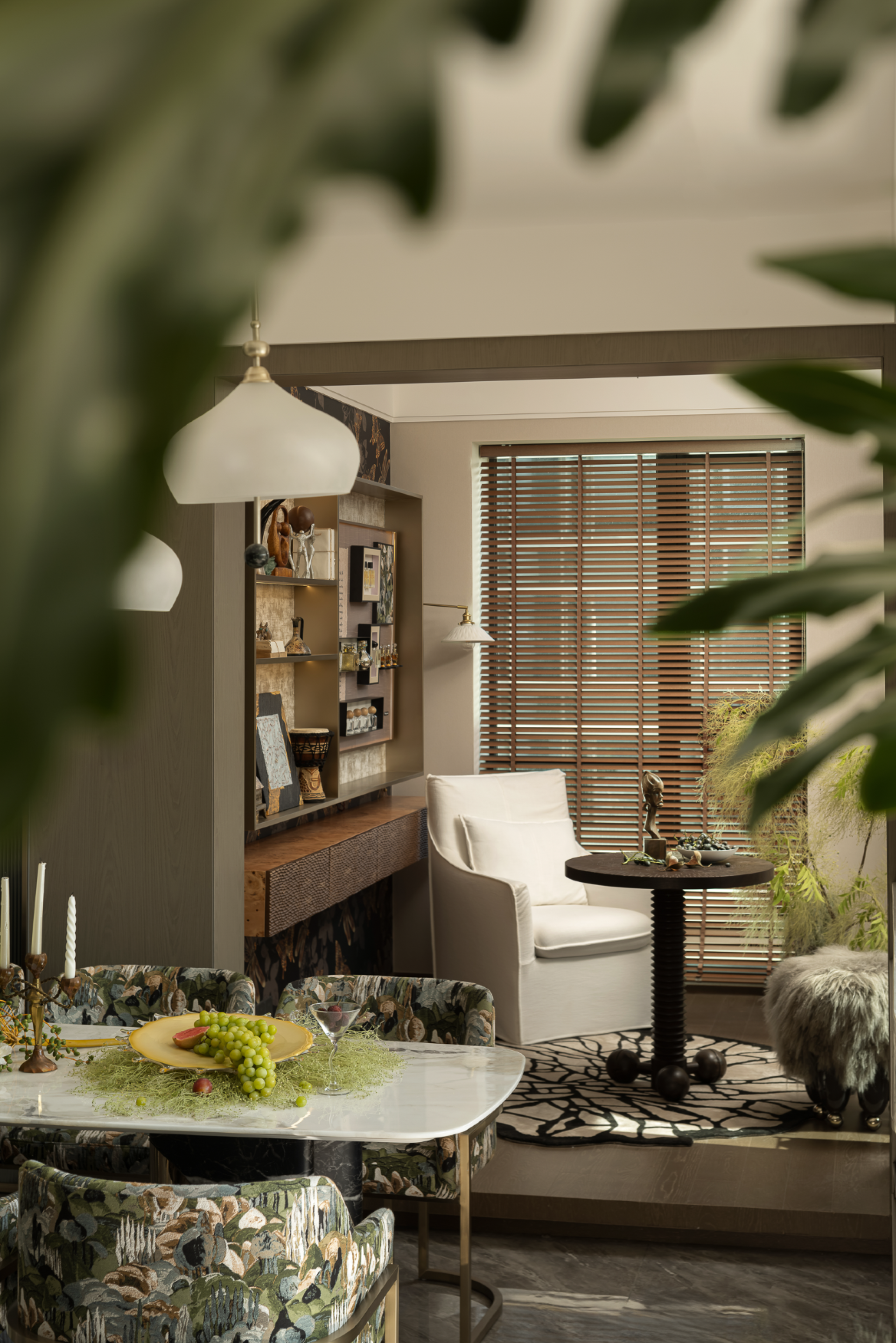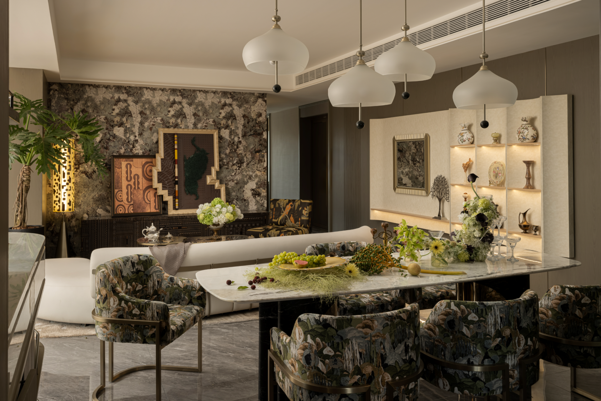 The open-plan living/dining area interweaves emotional connections with spatial flow, achieving harmonious tension between high luminance and desaturated tones. Each sculptural furniture piece injects dynamic vitality, while Cosmic Black Gold marble and Fendi White Onyx manifest as material statements and aesthetic allegories. This symbiotic experience of space, nature, and art embodies an inward-outward harmony resonating with quiet power.