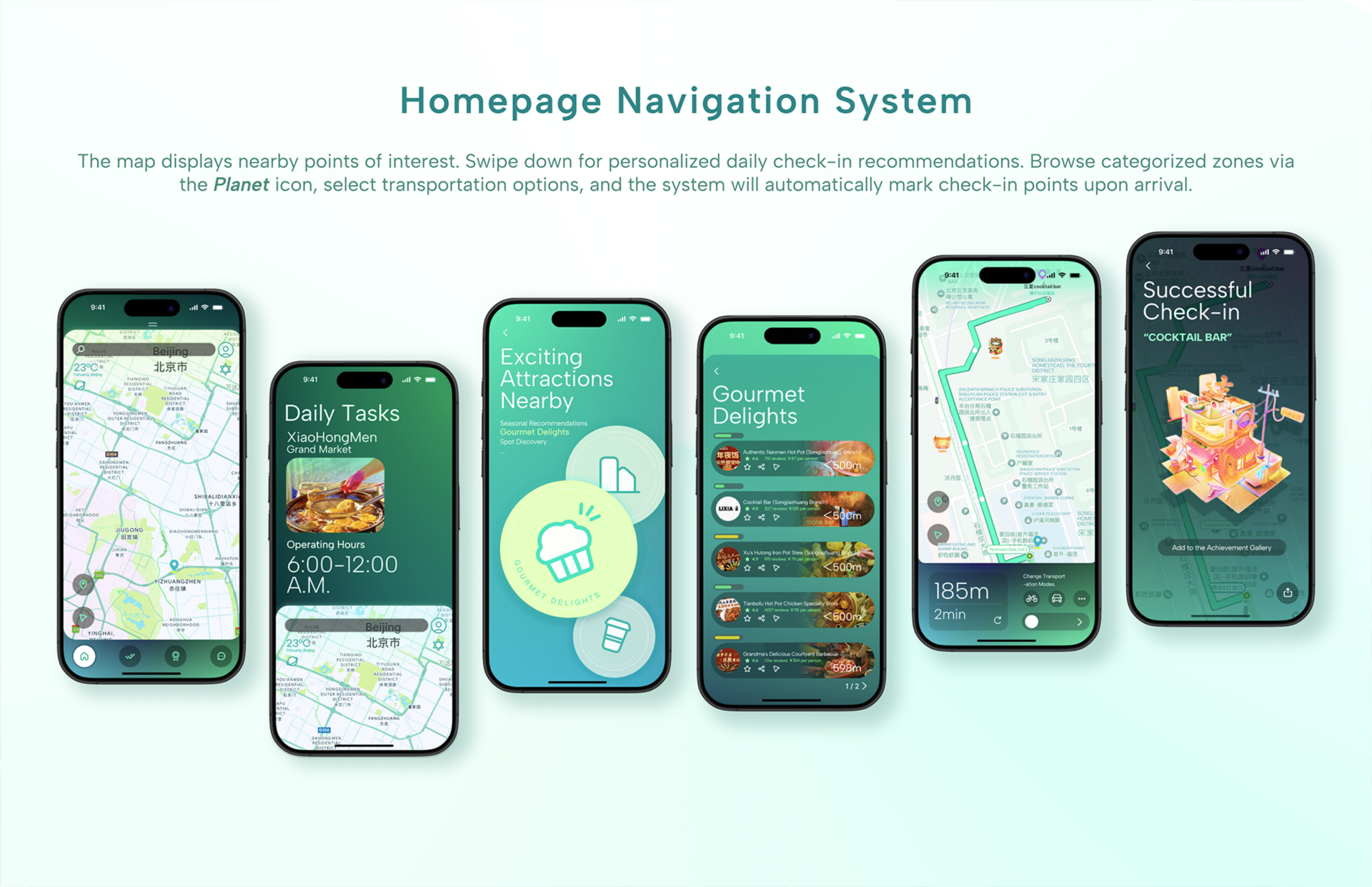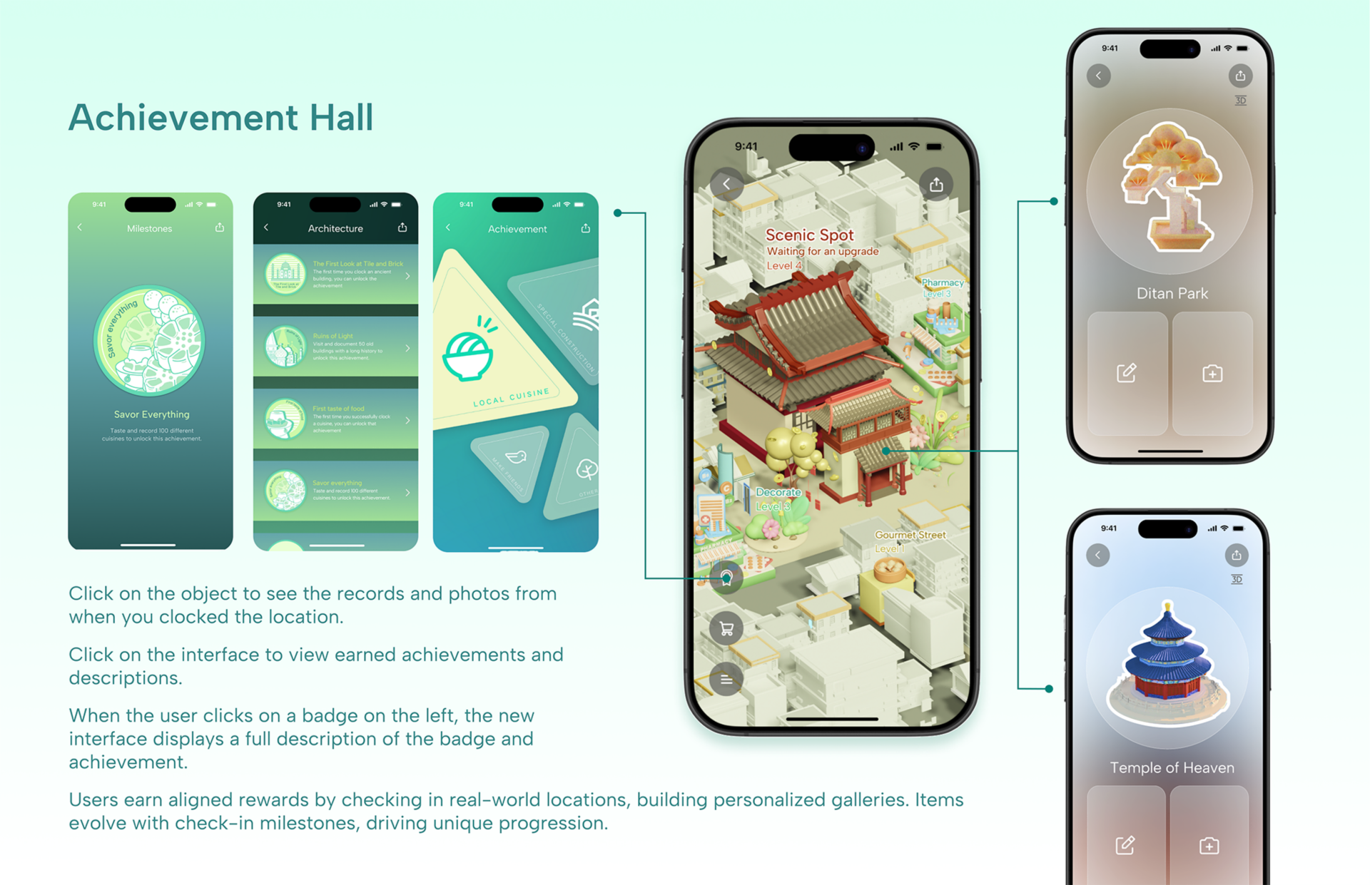 2. "Achievement System": Features themed badges and scene maps with attributes corresponding to real-world architecture, incentivizing users to complete consecutive check-ins, unlock hidden locations, and display achievements on personal profiles to amplify positive feedback;