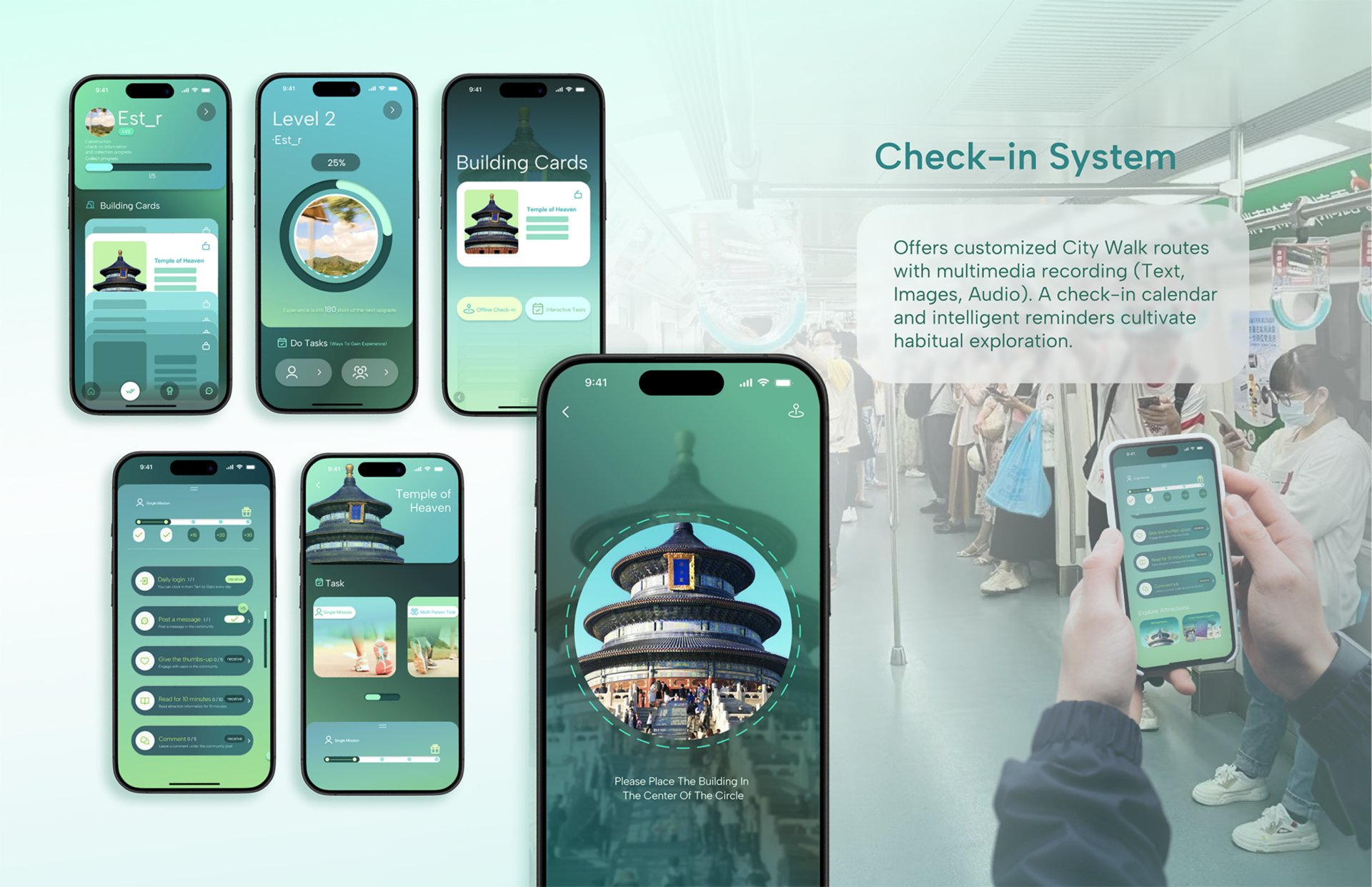 1. "Check-in System": Provides customized City Walk routes with text/image/audio documentation capabilities. Combines a check-in calendar with intelligent reminders to cultivate exploration habits.