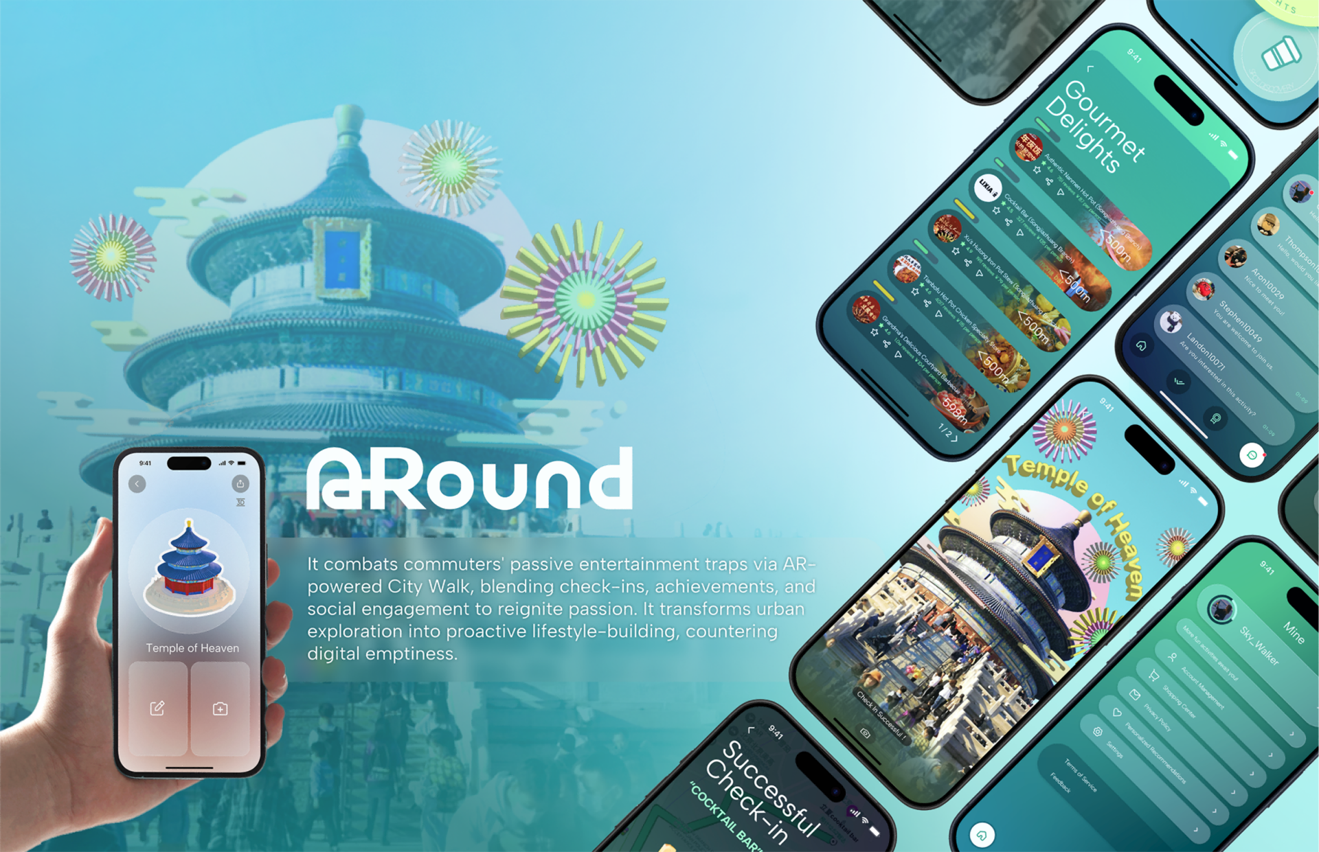The "Around" APP addresses the pain point of commuters being prone to falling into the "escapist entertainment" trap of passive leisure (commonly referred to as "tittytainment"). Centered around urban exploration (City Walk), it integrates check-in features, achievement systems, and social functionalities with AR technology to help users reignite their passion for life. By guiding users to actively discover urban beauty, it counteracts the spiritual void caused by passive entertainment and facilitates the formation of positive lifestyle habits.