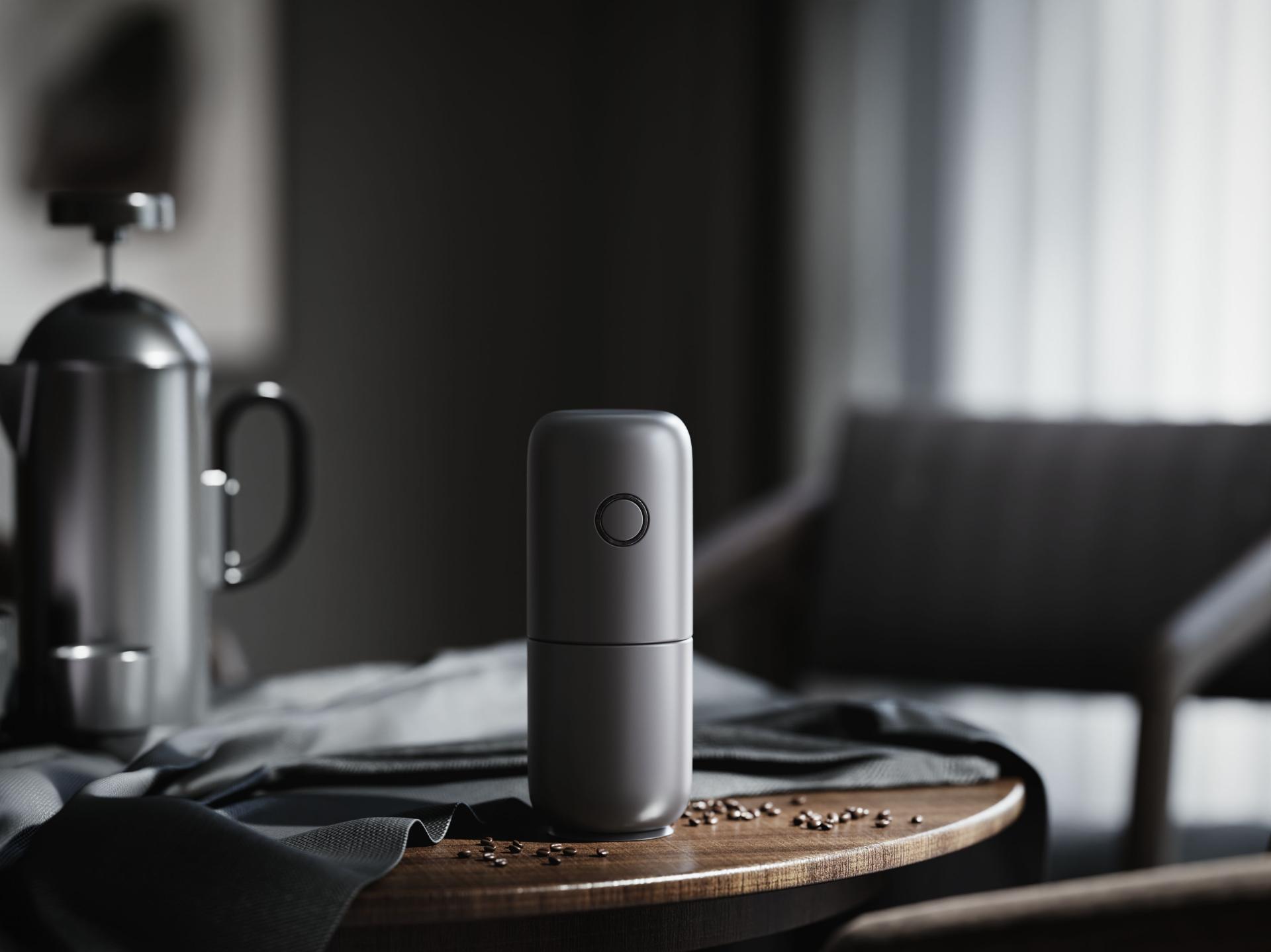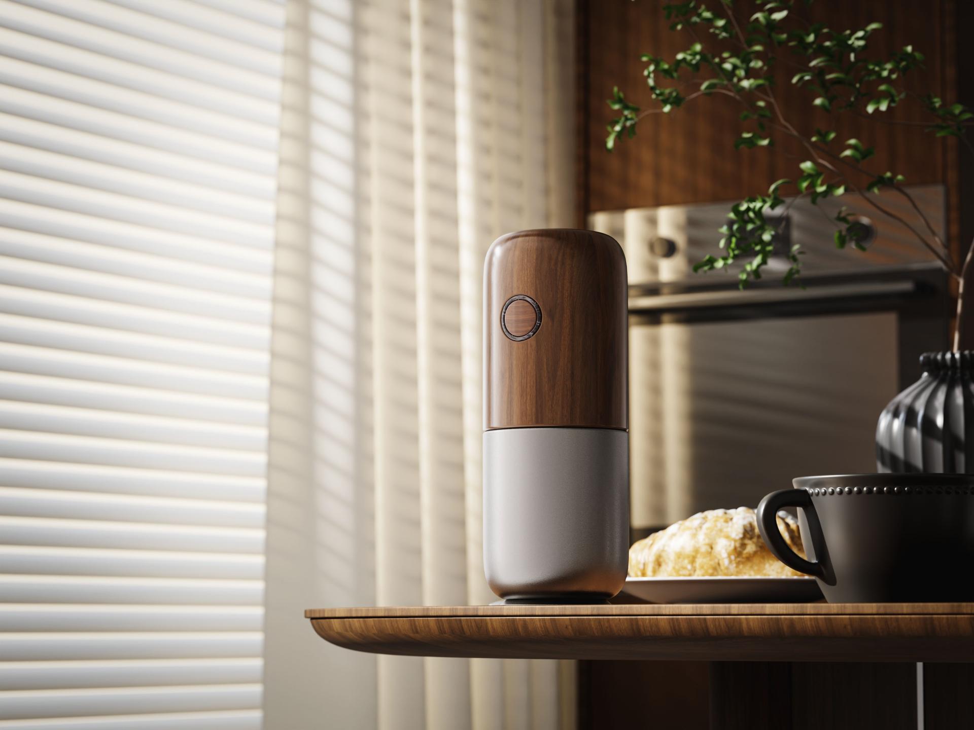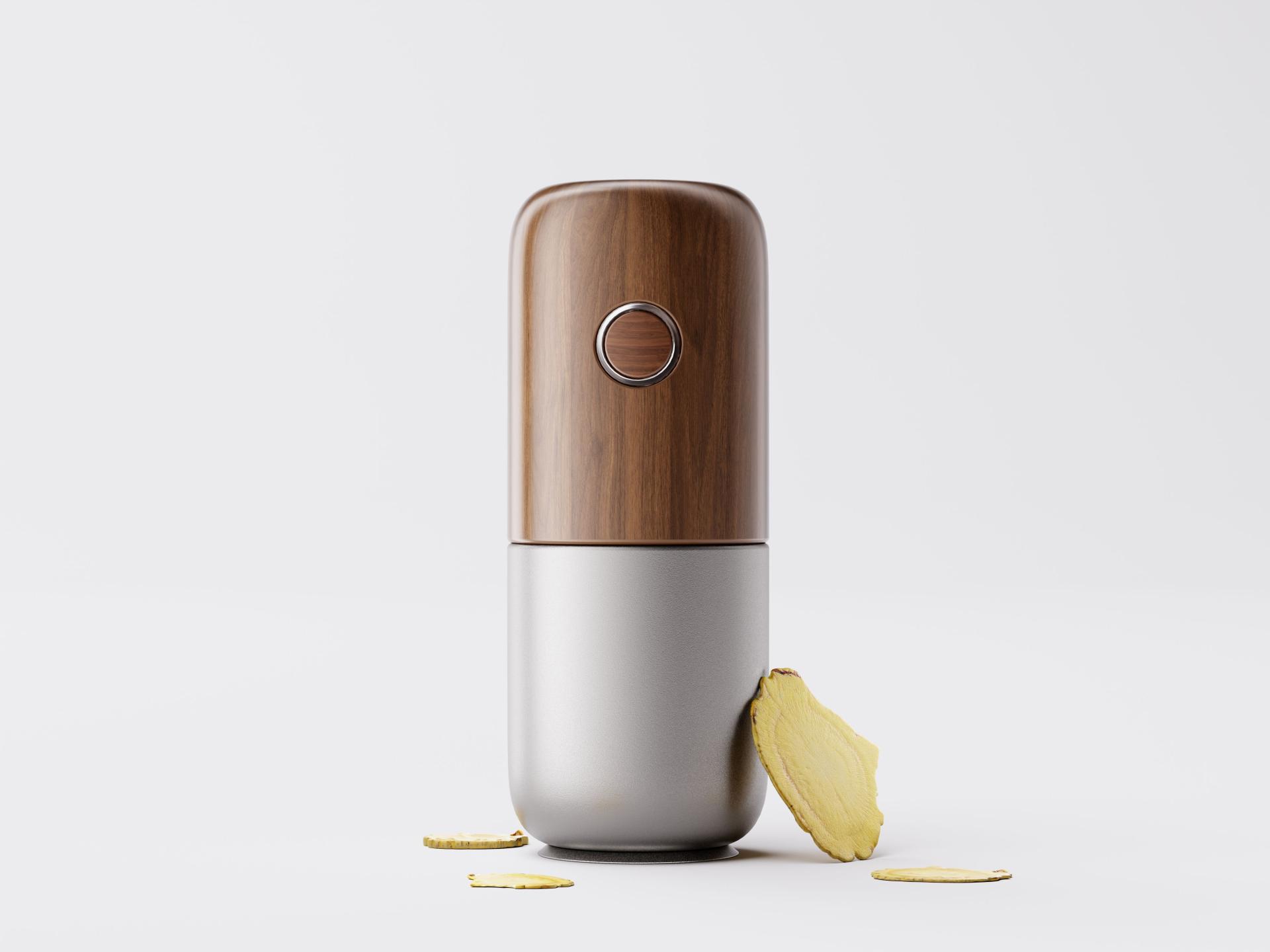 In terms of design, the grinder embraces a minimalist cylindrical form with large, rounded edges for a simple and elegant appearance and a smooth and comfortable grip. It combines the durability and modern appeal of an anodized aluminum body with the warmth and tactility of wood-grain accents—redefining the product as more than just an appliance, but an extension of one’s lifestyle. It blends seamlessly into various settings like homes and offices, reflecting a refined sense of taste and lifestyle aesthetics.