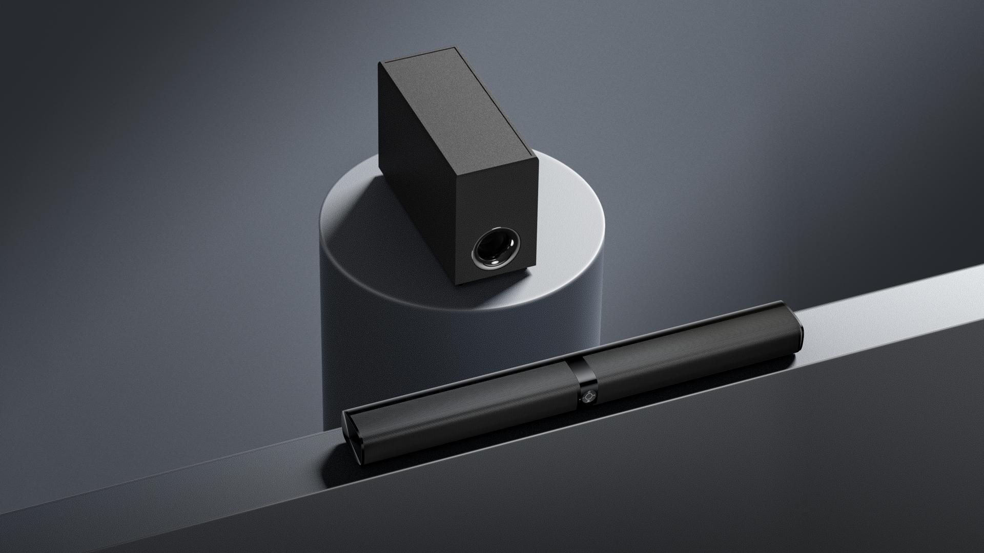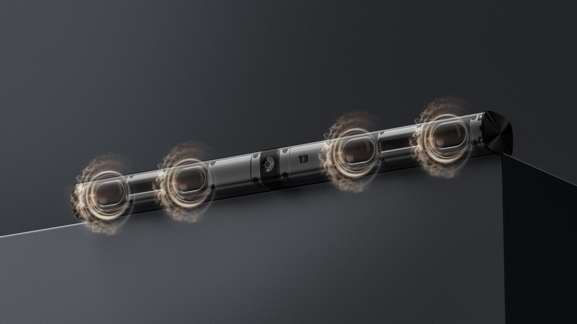The soundbar features a scratch-resistant plastic housing with a metallic-texture grille, combining durability with a premium tactile feel. The subtly contoured control interface and status-indicating LEDs provide both visual feedback and ergonomic touchpoints, echoing a modern, user-centric design language.