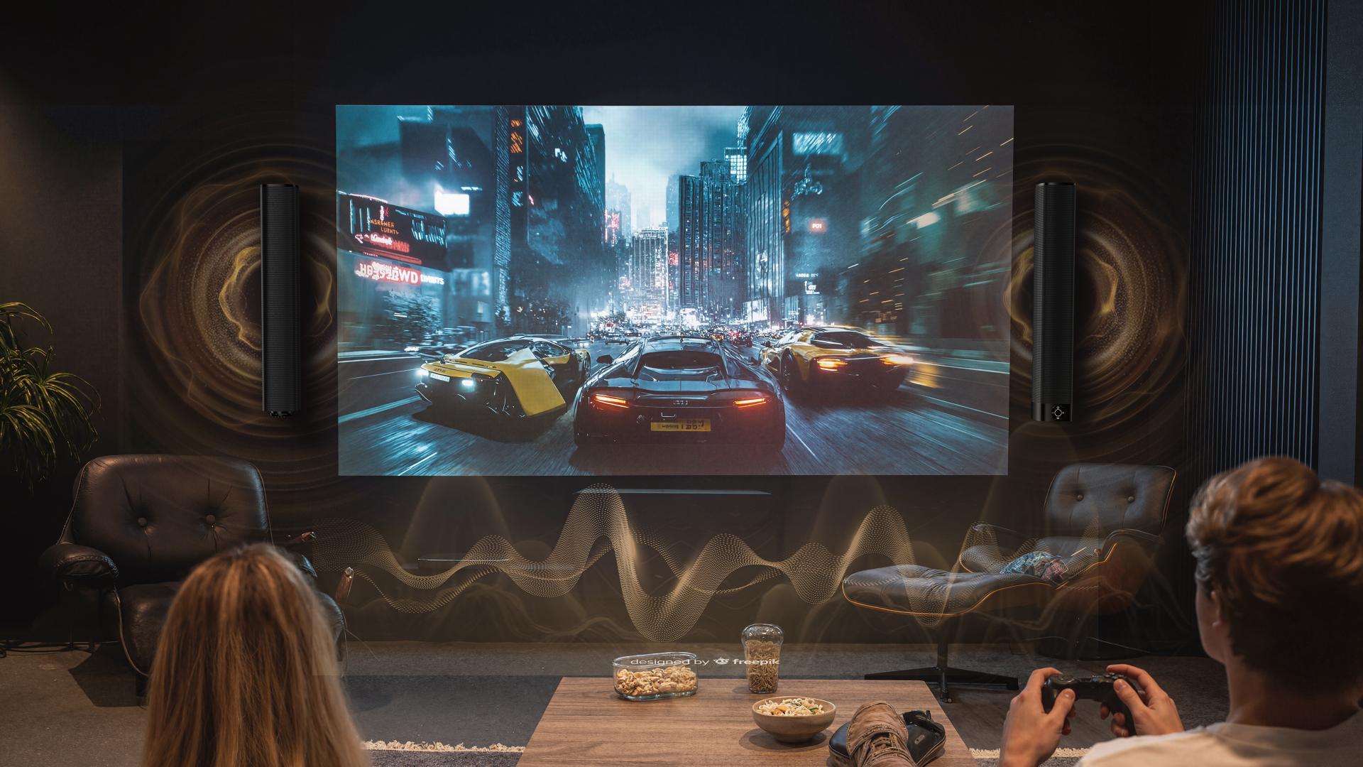 Guided by the design philosophy of seamless spatial integration, the KY-8000 adopts a matte-black, streamlined form factor with a 2-in-1 split design. Whether horizontally placed or vertically separated into twin tower speakers, its adaptable structure blends effortlessly with various living environments while maintaining visual elegance.
