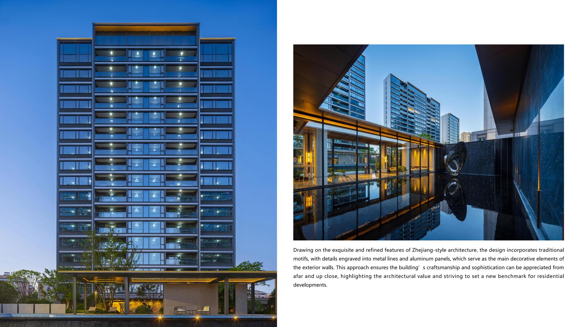 Drawing on the exquisite and refined features of Zhejiang-style architecture, the design incorporates traditional motifs, with details engraved into metal lines and aluminum panels, which serve as the main decorative elements of the exterior walls. This approach ensures the building’s craftsmanship and sophistication can be appreciated from afar and up close, highlighting the architectural value and striving to set a new benchmark for residential developments.