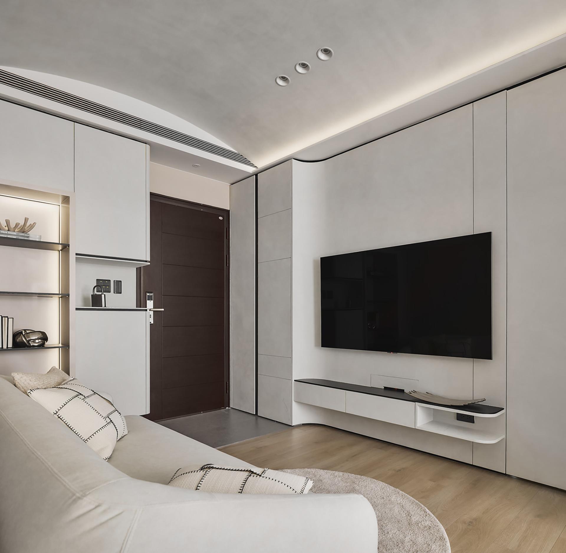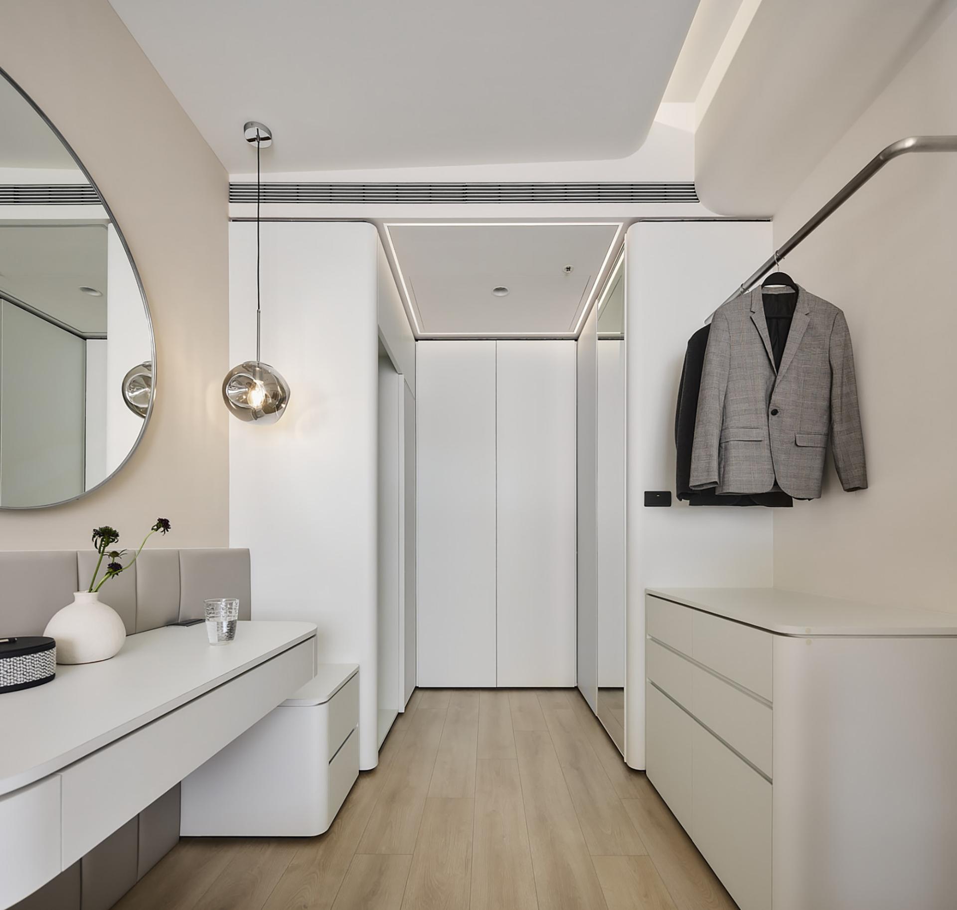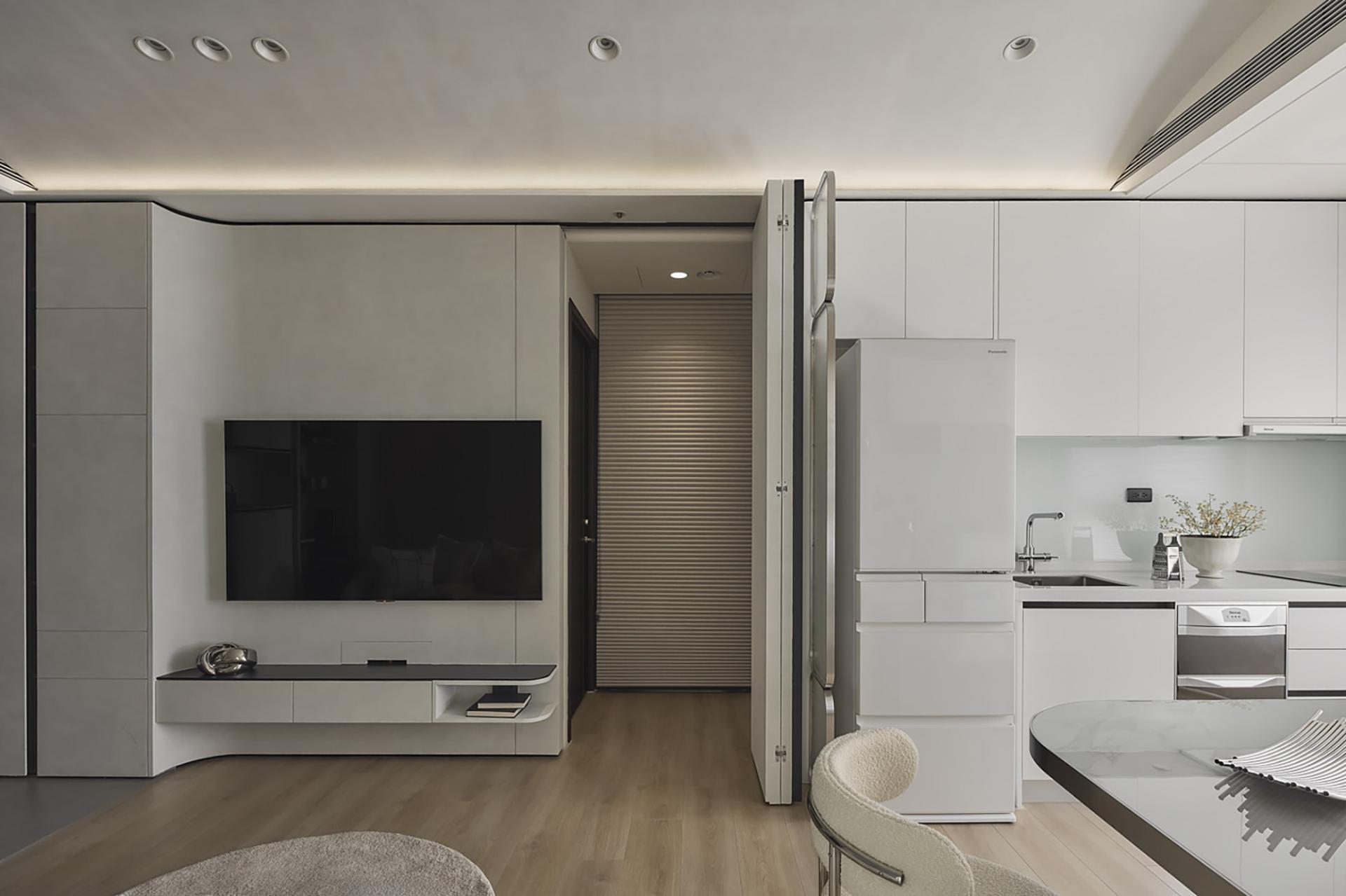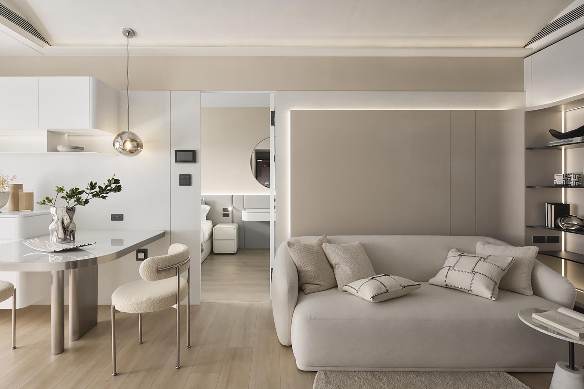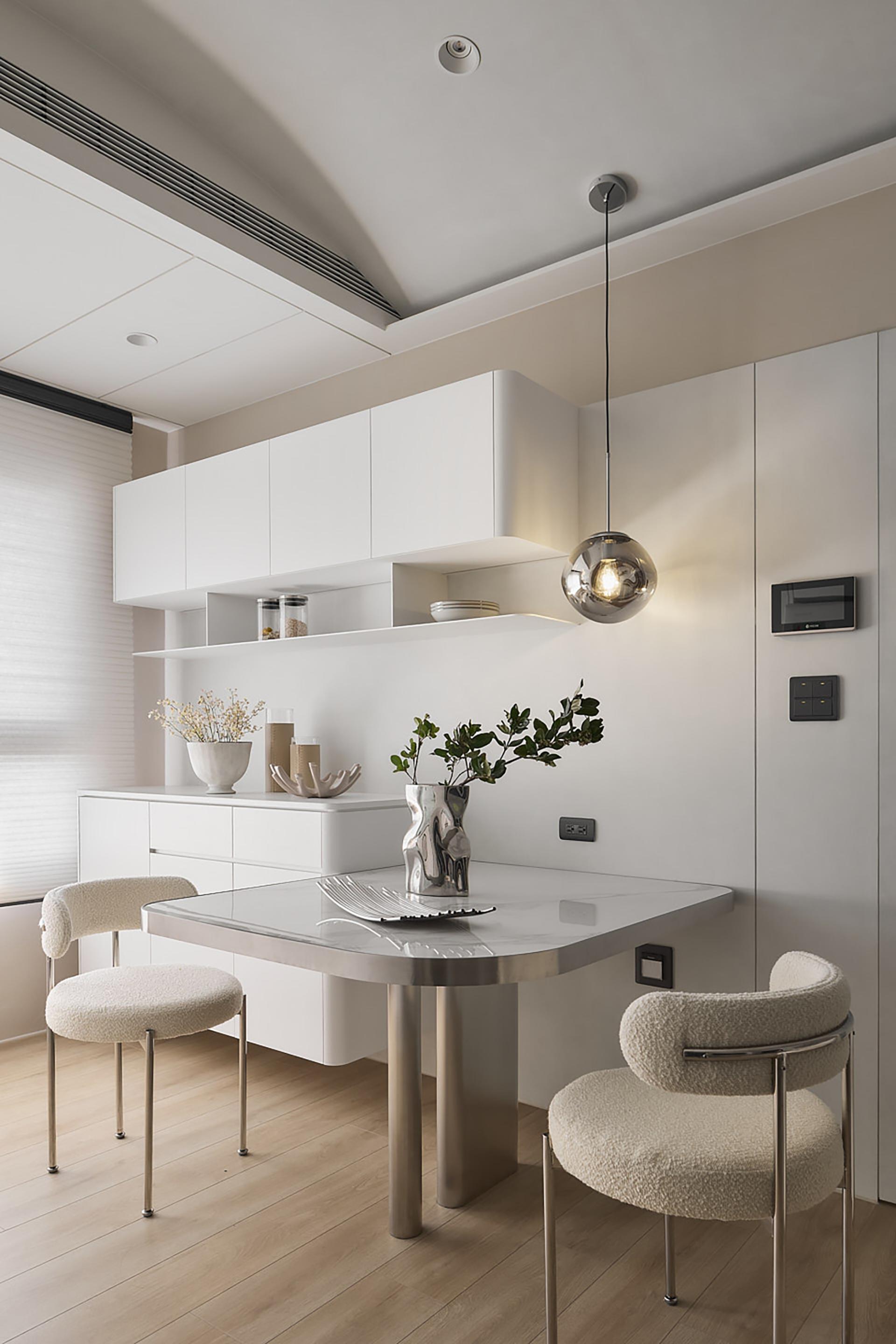 The highlight—a rising curved dome—channels light along its arc, giving the space rhythm and breath. Rounded corners and two-tone walls infuse the environment with order and variation, while materials like metal and fabric balance rationality with emotion. Every detail echoes the theme of "soft yet ordered.” Whether the couple sits together at the table or someone gazes silently at the ceiling, the space captures these tender, shared moments.